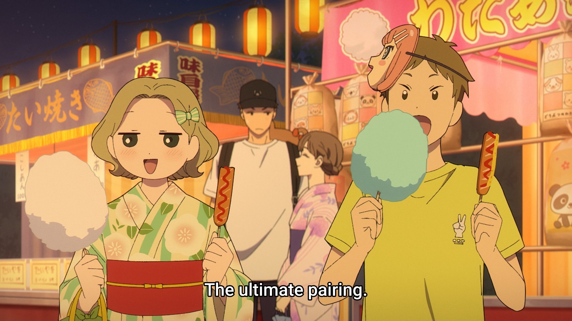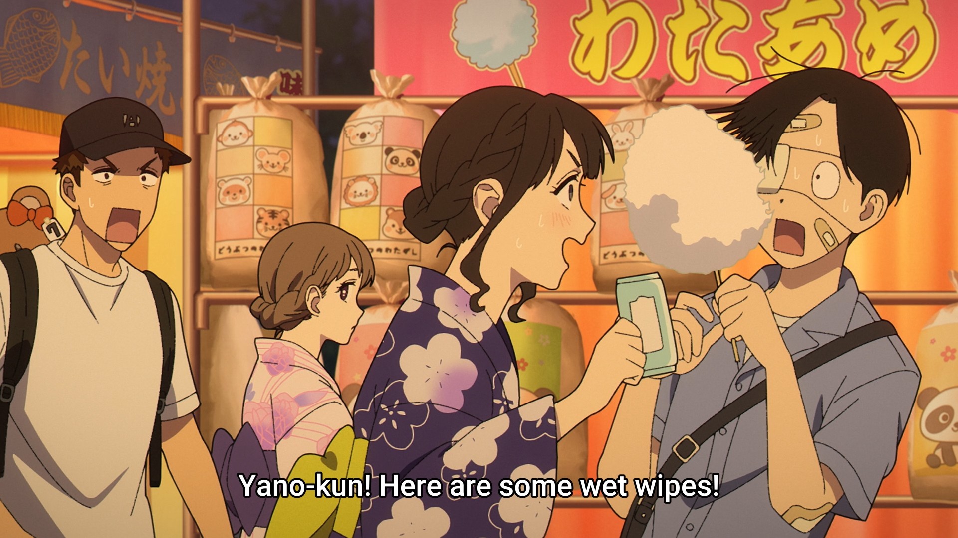 The ensuing “ménage à trois” is a sad affair. Hashiba is jealous of Yano, so he tries to compete with the guy at festival games in order to soothe his ego. Unfortunately for Hashiba, this simply leads to Yano injuring himself at every single activity, which then drives Kiyoko towards her boyfriend even more. Bro can’t even eat cotton candy without fucking up! Cotton candy! The best laid plans of mice and men, huh Hashiba? Meanwhile, Kiyoko is jealous of Hashiba for being so “close” to Yano, so she randomly glares at him throughout the night. It doesn’t help that our couple isn’t acting very couple-y. They don’t walk together, they don’t sit together. Despite being so bold in confessing his feelings to her two episodes ago as well as calling her cute tonight, Yano suddenly pulls back when he gets the chance to hold his girlfriend’s hand while walking the festival grounds. I’m back to being frustrated and annoyed by these children. To be fair, Yano does eventually make up for this by eventually buying Kiyoko the gaudiest ring I’ve ever seen. I seriously thought it was a ring pop.