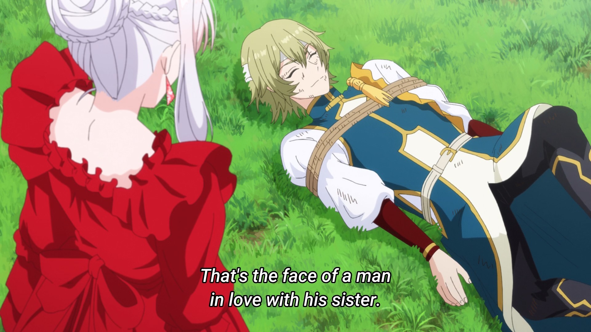 Scarlet then proceeds to interrogate Dios, but not for anything practical like how to stop the horde of invading monsters or Palmianism’s next moves. Rather, she wants to know why Dios, someone from the enemy faction, had tried to protect Diana that one time she fell off her palanquin during the parade. As you’ll recall, Leo stepped in and broke the saint’s fall. But if he had failed to act, Dios would’ve saved Diana instead. Welp, it turns out she and Dios are related. To be precise, they’re half-siblings. I guess his hair is sorta greenish, so this might have been a clue regarding his true identity? They’re also both traitors, so being a turncoat apparently runs in the family. Well, the moment is quickly ruined when it turns out Dios is kind of a siscon. Why is he even commenting on her body of all things? Ugh. Anime, why do you always gotta be so weird?