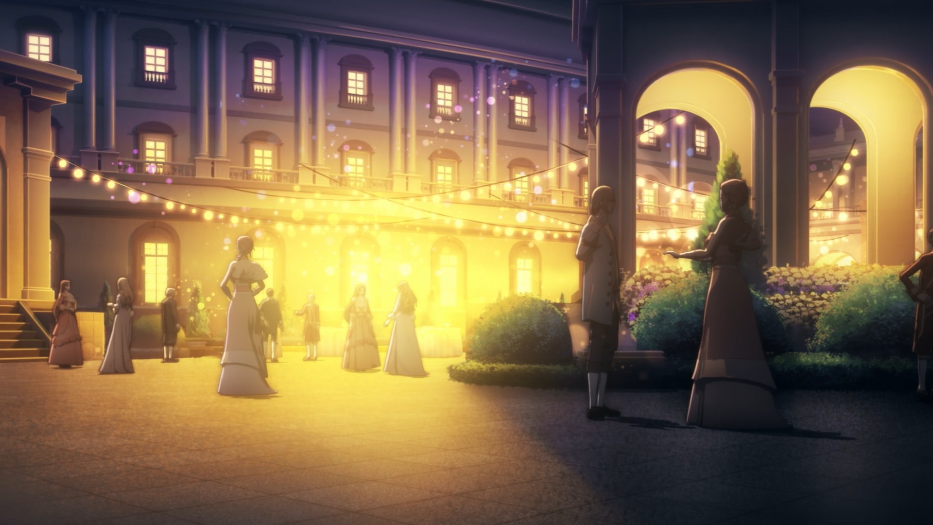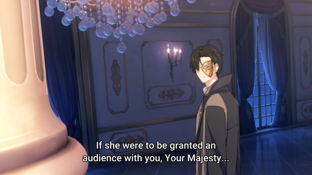 At this point, Duke What’s-his-face makes his move, and I’m sorta buying his argument. Nevertheless, it’s an argument he has tried and failed to make over and over before: Athanasia needs friends her own age. Remember how he wanted to introduce Athanasia to his son Ijikiel? She fought against it back then, but now she’s dancing with him at the ball. So if she would just meet Jennette, they would probably become fast friends if not besties since they have so much in common. Unfortunately, Claude is both too wary of Duke What’s-his-face and also distracted by a mysterious masked man. Yo, who let this chump crash the princess’s party? Security? After the masked man slips away in the darkness, Claude proceeds to make my other argument, i.e. this isn’t the right time, bro. Give it a rest, bro. Duke What’s-his-face really needs to step his Machiavellian game up. He kinda sucks at this. It seems like he only succeeded in the previous timeline because Claude was a mentally broken deadbeat through and through.