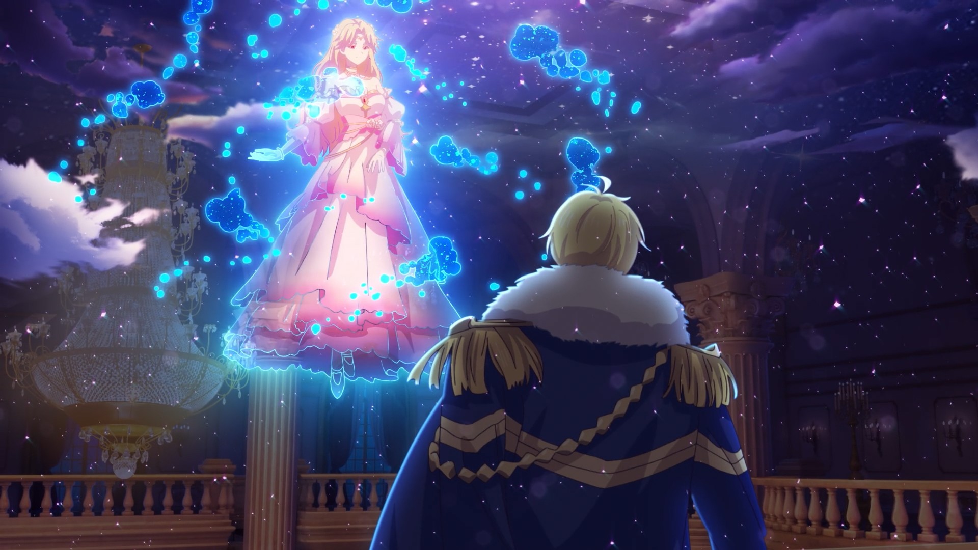 Even though Duke What’s-his-face’s schemes are falling apart, Athanasia still plays her trump card, so she gathers everyone’s attention and summons forth a projection of her dear mother. The projection is apparently tangible enough that Claude can even dance with his late wife. That’s really fancy magic for someone who could barely levitate a potato just a few years ago. To top it all off, Athanasia then hops onto a piano and starts jammin’. All this just to impress her father. All this just for her coming-of-age to ultimately be all about Claude, Claude, Claude. You gotta hand it to her for working so hard at, well, everything. Dancing, magic, piano, etc. Nevertheless, this all just feels so… one-sided. At this ball, Athanasia wants to be the daughter that Claude can be proud of! At this ball, Duke What’s-his-face wants to get his foot in the door and start influencing Claude! At this ball, Jennette wants to finally meet her (not) father Claude! It even feels like the masked man is only here to troll Claude! The only major character who seemingly doesn’t give two shits about our special little emperor is, well, Ijikiel. He’s too preoccupied with Claude’s offspring instead.