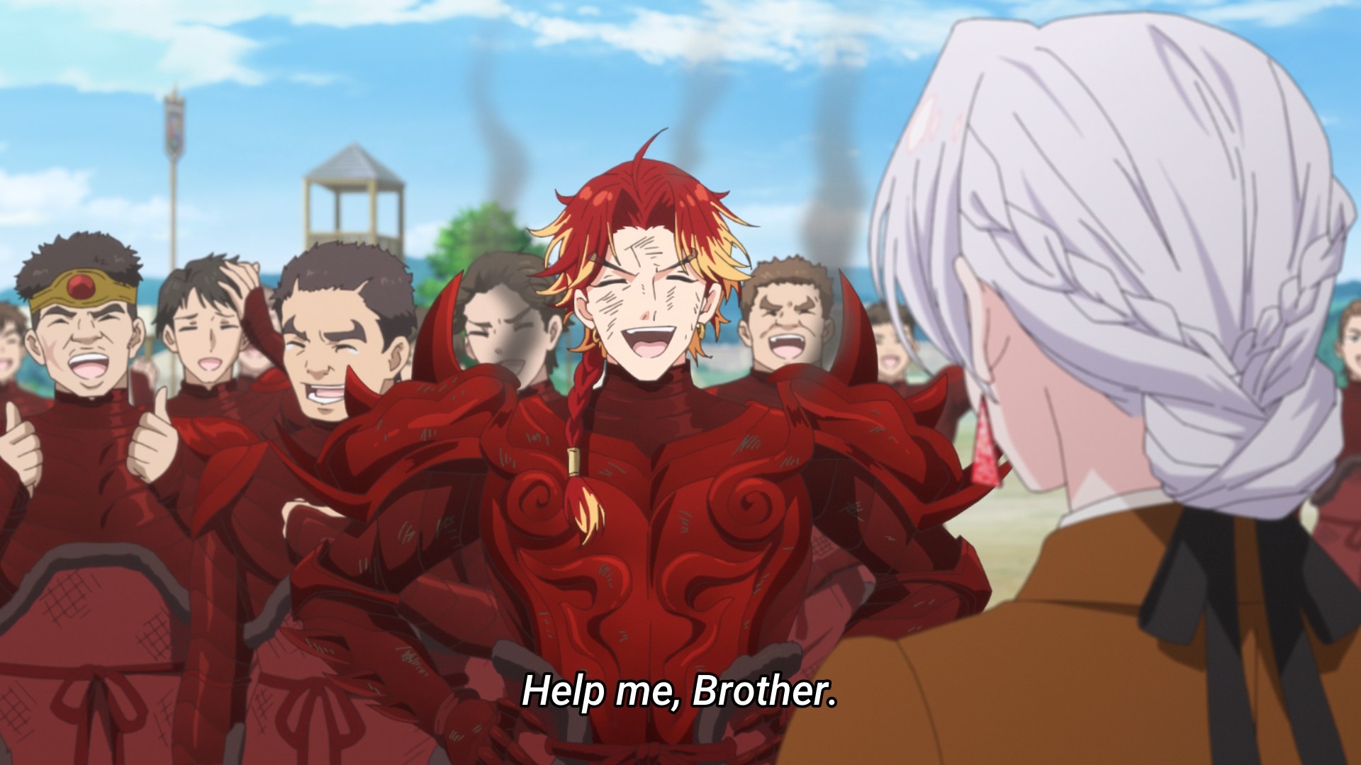 As for the rest of the conference? Falconia’s heart isn’t in it, so if Pallistan can convince them to stand down, it might also get Eldrand to stand down. Nanaka and Dios must then travel to the northern border and negotiate peace with the elves and beastkin. Yep, this is probably the first time I’m not enjoying an episode of this series. Just a bunch of talking heads around a table, discussing boring strategy instead of taking action. Scarlet should be punching shit, and when she’s done punching shit, someone can run up to her and say, “Scarlet, you need to go here because x, y, and z,” or, “Oh no, the negotiations have failed!” Something to that effect. The end. No boring exposition needed. Of course, the story wouldn’t exactly play out this way, because I don’t know what happens later, but you get my point. You don’t need to do a scene like this where everyone literally sits down at a table and dryly talks things through. You can still do a scene like this, but you better nail the atmosphere and dialogue. It better be tense and suspenseful as all hell, keeping us at the edge of our seats like a political thriller. But this ain’t that.