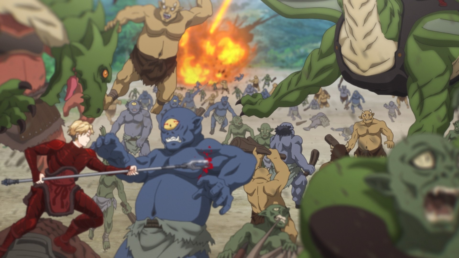 Everyone has their marching orders, so we see Scarlet join up with Alflame and his men in order to slay monsters. The horde is supposed to number 50,000 strong, but I don’t think this show can really animate that — any show, really. So instead, we only get to see Scarlet punch and kick a handful of orcs at a time. It would take more than a handful of handfuls in order to add up to 50,000, but let’s just overlook that for the sake of expediency.