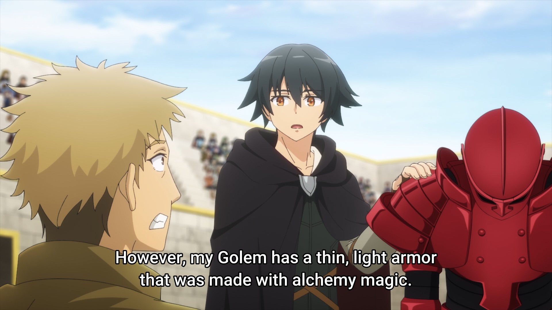Arel impresses more magical schools by… let’s see here… creating a kickass golem, zapping the undead with his holy magic, and enslaving a demon he found in a book. Just another day for our blasé hero. But there is a plot… sorta. The Black Institute of Magic is about to lose a huge chunk of its funding, so its headmaster goes and summon the supposedly greatest monster from the demon realm! Which is just a dark, indistinct blob. Well, it quickly swallows him up, so I guess Arel will have to clean up his mess in next week’s episode. Yay, so exciting.