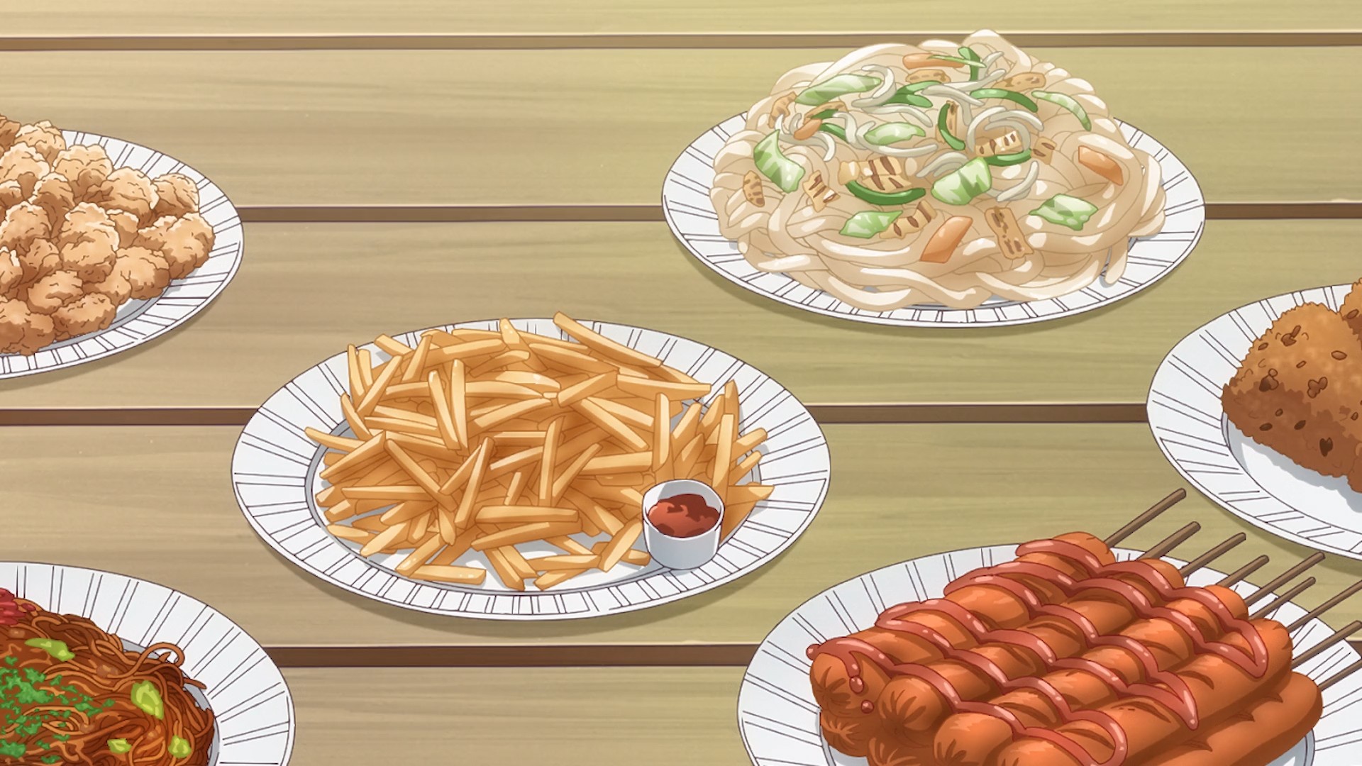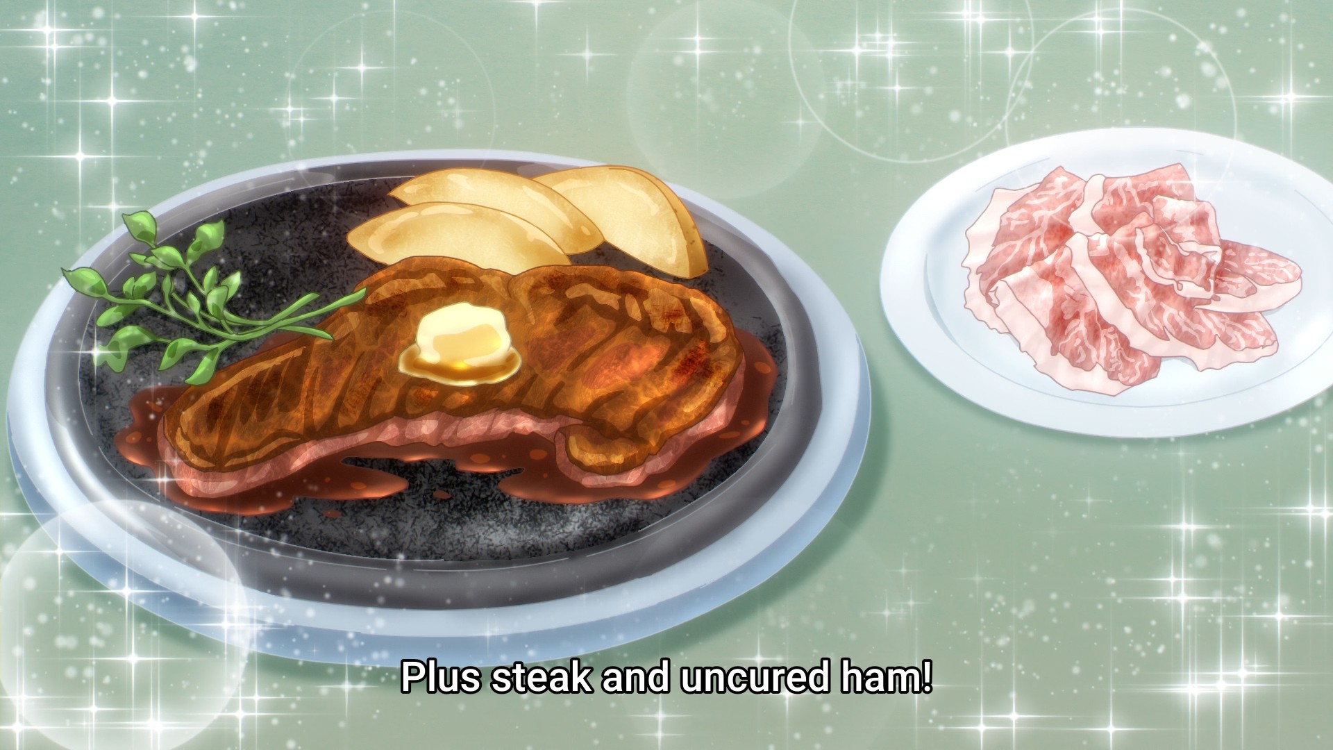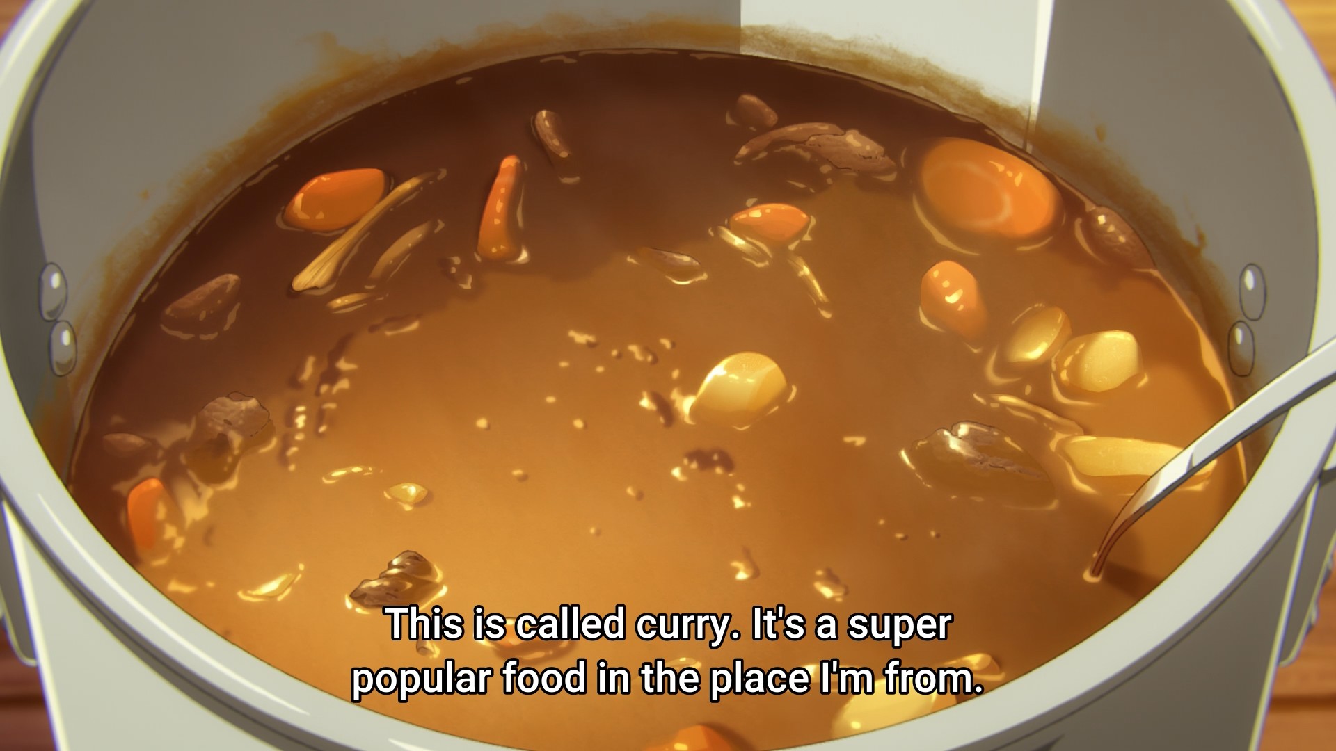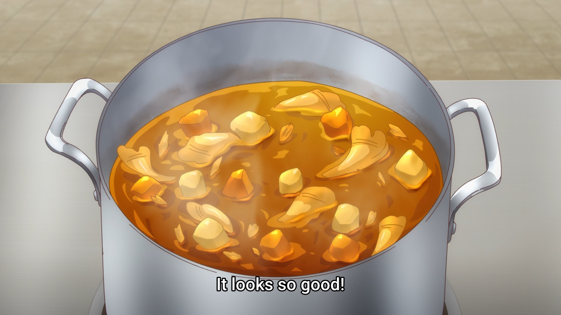 Anyways, nothing too exciting on the food front this week. We just meat stacked on top of meat. Literally mounds of them. And when they’re not eating mountains of meat, they’re eating mountains of carbs. Well, he does make Japanese curry for the gang, which contains some veggies. In the process of making it, Mukoda even remarks that he’s tried all sorts of curries, but he’ll always return to the Japanese variant. I’m the opposite. Korma is fantastic, and I love the spiciness and aroma of an authentic Thai green curry. I enjoy Japanese curry fine — I’ll even make it at home from time to time — but it’s definitely at the bottom of the curry totem pole.