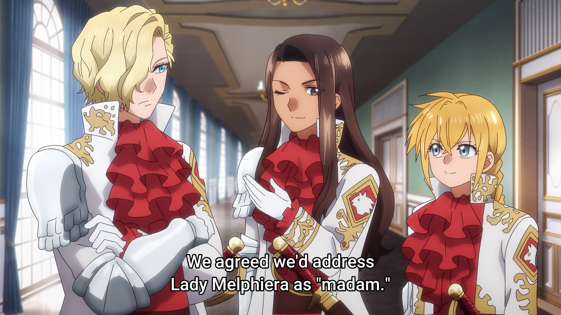 Apparently, Melphy’s hair looks unkempt here. Well, coulda fooled me. Nevertheless, Aristide can’t help his dear fiancée with this problem ’cause men can’t comb their wives’ hair…? As a result, he summons a female-only knight corps. So… do they fight in those poofy shirts? Unfortunately, there’s little to talk about in this week’s episode. It’s nice to see Melphy make new friends, but there’s nothing else to chew on. It’s the same ol’ schtick as with the men. Melphy says she eats monster meat, everyone acts surprised, then she swears that she’ll will win them over if they would just try her cooking. Ho hum.