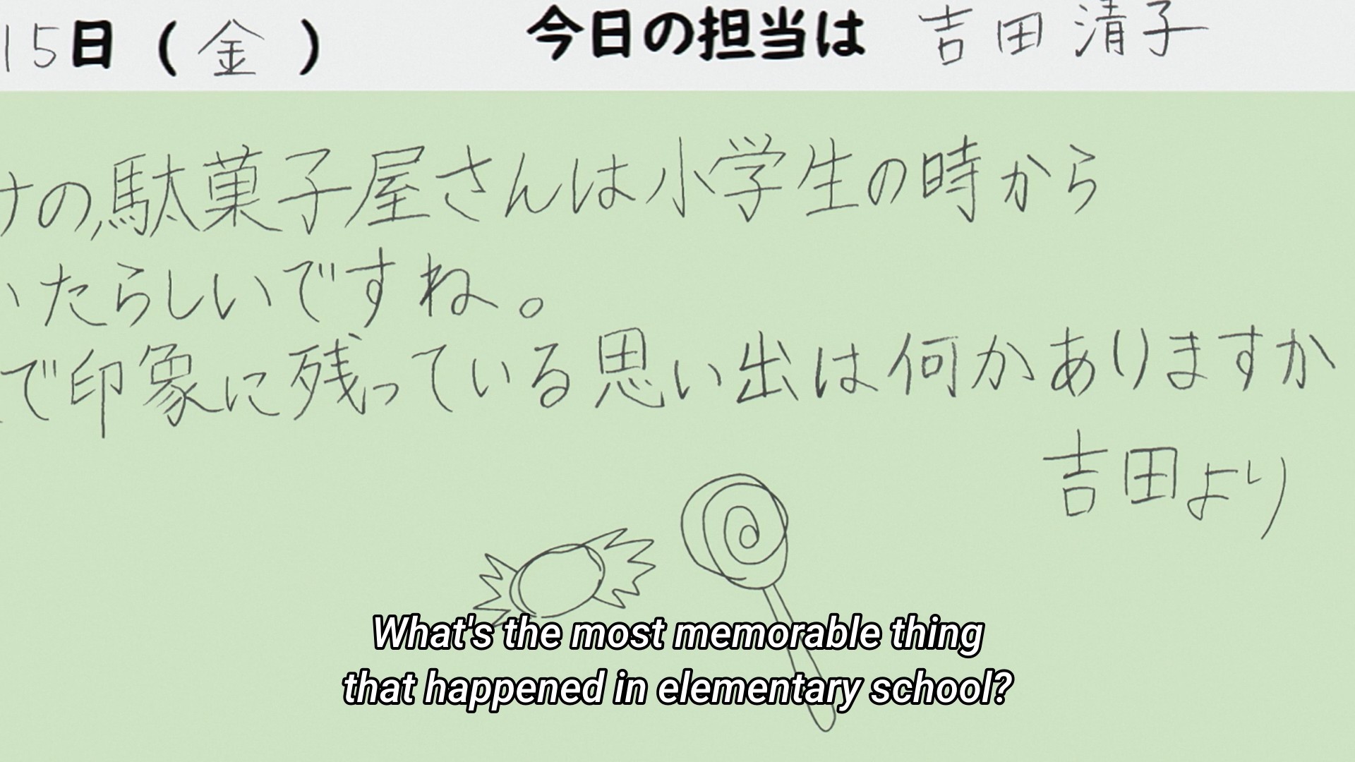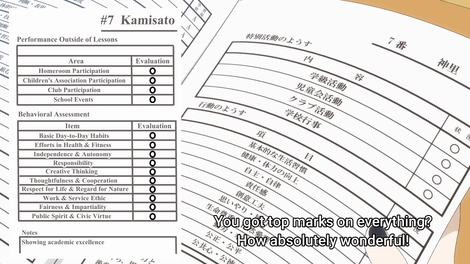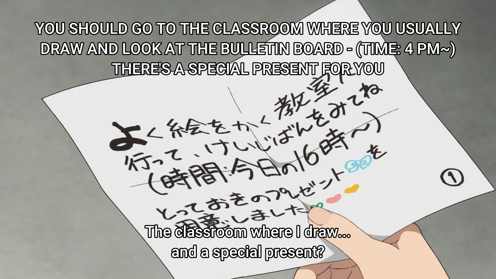 In the latter half of the episode, Kiyoko and Yano does an exchange diary exercise. It’s kinda like penpals except with a notebook that you pass back and forth. You’re supposed to take the notebook home before you read and answer the question that the other person wrote, but they’re sitting right next to each other. Oh well, I guess it’s a cheap way to animate the episode.