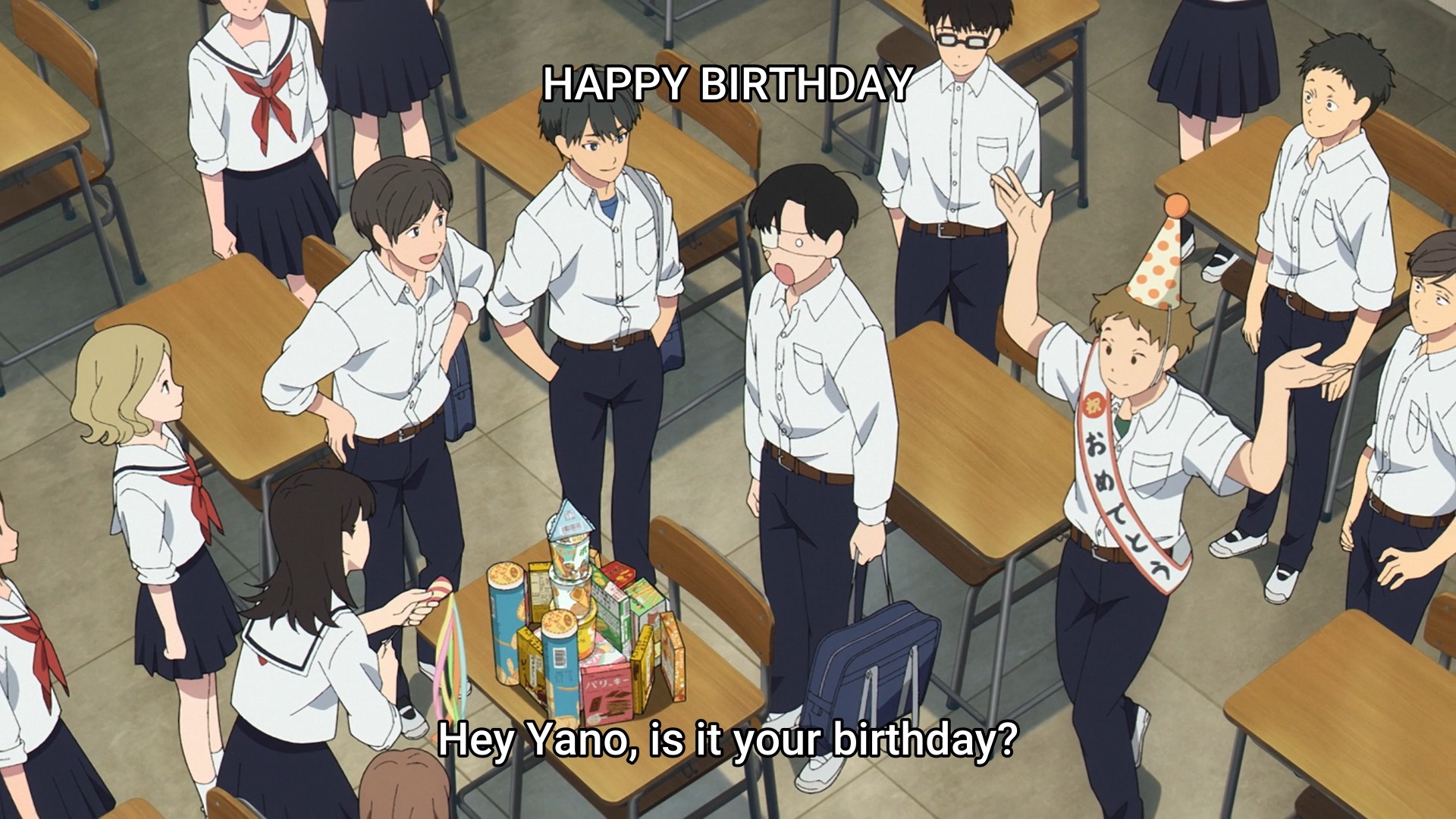 It’s Yano’s birthday, so the kids go over the top with it. Not only does he get a ton of snacks, they’ve even organized an elaborate treasure hunt with multiple clues. At the very end, he gets a box with his own very special girlfriend inside! I wonder if the gang will put in this much effort when someone else’s birthday rolls around. And if not, why? I’m sure Hashiba would love a box of Kiyoko too!