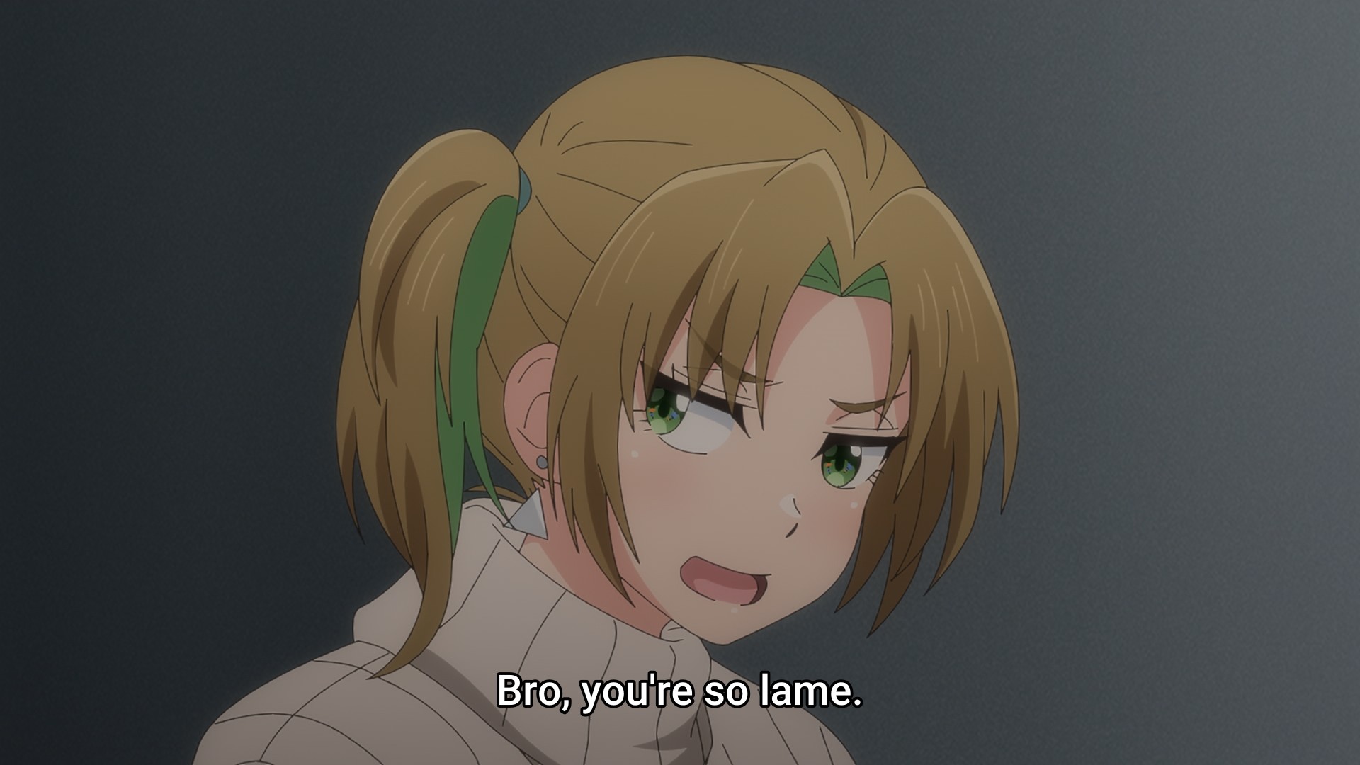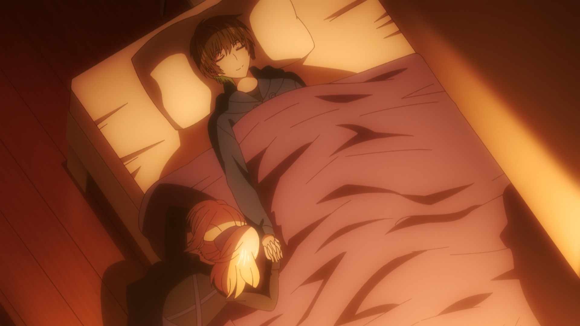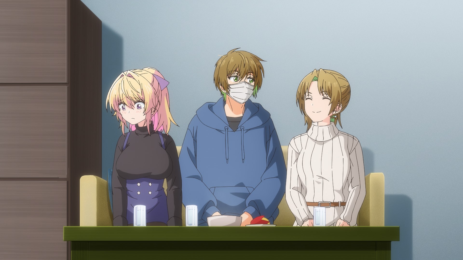 Nevertheless, coffee time leads to Kannawa spilling her guts about how she only acts mean as a defense mechanism. Y’see, her brusque demeanor keeps other people away, so her awkward self doesn’t have to actually interact with anybody. Sure, on the one hand, we have two love interests sharing a tender moment; she feels secure enough in his presence to open up to him, rendering herself vulnerable. Obviously, she thinks he’s boyfriend material. On other hand, your superior shows up to your door because you called in sick. She tries to make you food, but fails so you have to do it yourself. She then tells you it felt weird to see you with another woman, who was just your sister. You offer her coffee after the meal — a meal in which she didn’t eat because she’s not the sick one — so she proceeds to trauma dump on you. All this because she wanted to thank you for buying her a matching cat-themed coffee mug, which could’ve been weeks or months ago. Then your mentor kneels beside your bed and sings you a lullaby. Like… what? Is this a fever dream born from his illness? This whole episode, I feel like an alien watching a weird, exotic species interact for the first time and just scratching my head at what I’m seeing.