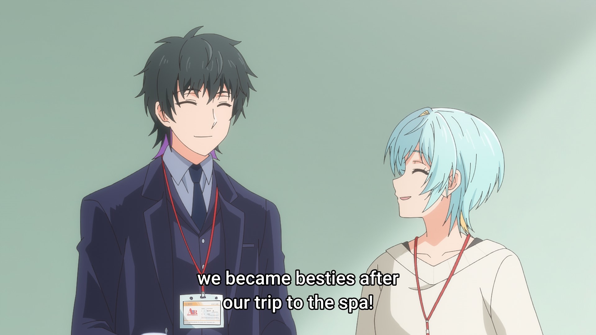 - So Hotta and… uh, what’s their name again? The other person… ah, yes, Kankaiji! I mean, they were just introduced last week. I’m juggling like a billion anime, so you can’t blame me for not remembering every little character. But back to my original point, Kankaiji and Hotta are only now friends, which implies that they weren’t friends before last week’s episode. Which also means they didn’t plan a spa trip just to get Kannawa and Kamegawa together. But then who just decides to go on an impromptu spa trip with their coworkers? One of the weird things about this show is how these people don’t seem to have a social life outside of work. With Kannawa, I can sorta understand it; she’s the socially awkward one. But what are the others’ excuse? Where are their non-work friends? Sure, in life, you’ll bump into that person who’s all about work, but you don’t bump into four of them at the same time. But you never see Kamegawa hang out with anyone but Kannawa and (recently) his sister.