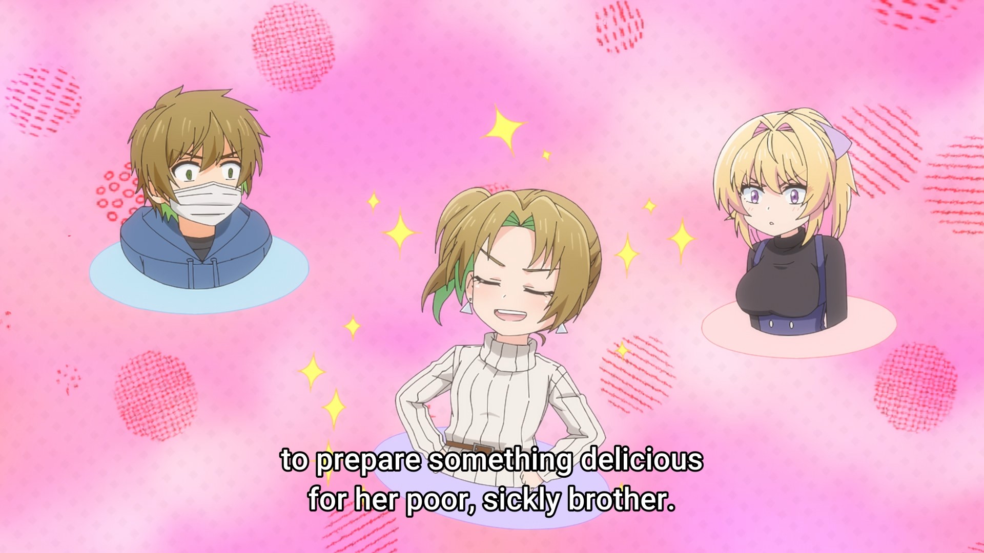 Even so, this “let’s take care of the sick person” episode is kinda weird, because Yuki is practically third wheelin’ her brother. Usually, the love interest does the cooking. Afterwards, they may or may not personally hand feed the sick person. But nope, both girls are gonna try to do the cooking for some reason. It’s… rice porridge. Hell, some rice cookers have a setting to do it automatically. To top it all off, both women are a disaster in the kitchen, so the sick guy eventually has to step in.