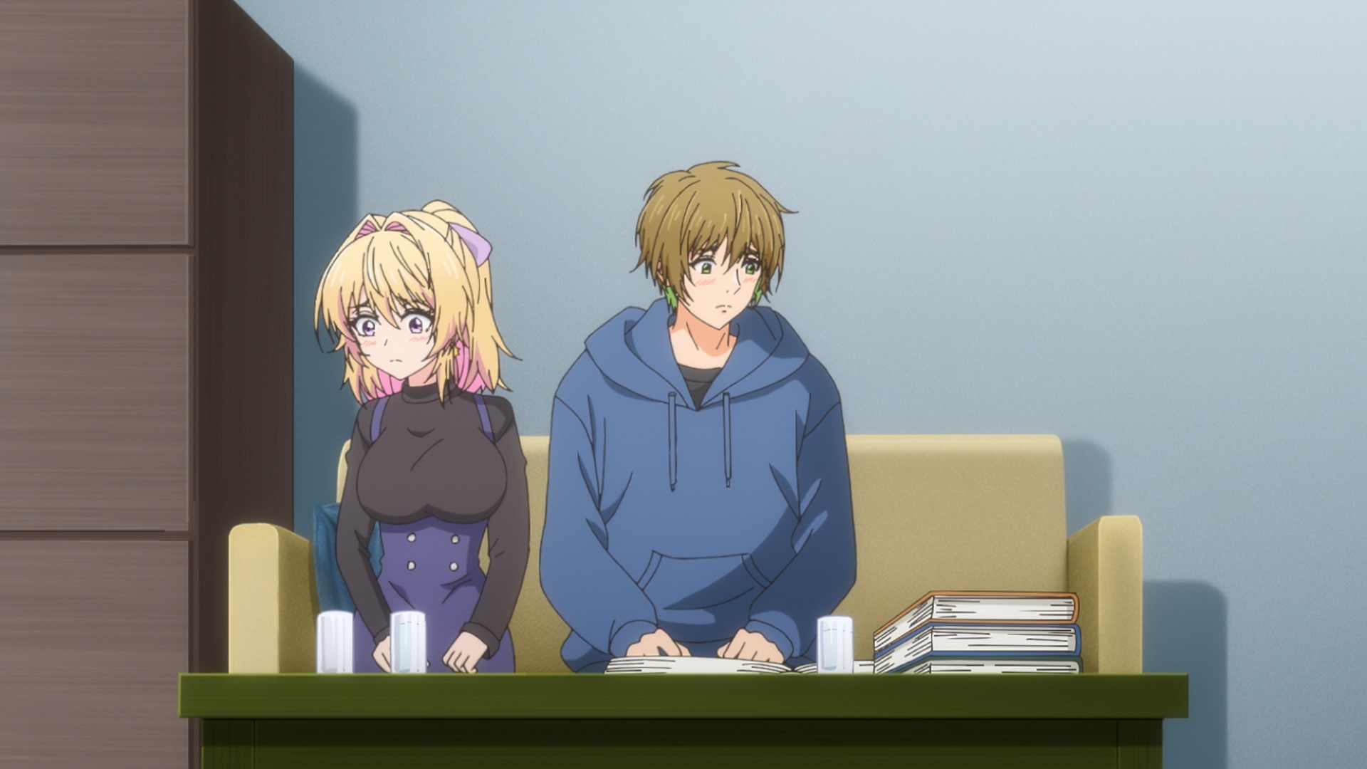 Nevertheless, coffee time leads to Kannawa spilling her guts about how she only acts mean as a defense mechanism. Y’see, her brusque demeanor keeps other people away, so her awkward self doesn’t have to actually interact with anybody. Sure, on the one hand, we have two love interests sharing a tender moment; she feels secure enough in his presence to open up to him, rendering herself vulnerable. Obviously, she thinks he’s boyfriend material. On other hand, your superior shows up to your door because you called in sick. She tries to make you food, but fails so you have to do it yourself. She then tells you it felt weird to see you with another woman, who was just your sister. You offer her coffee after the meal — a meal in which she didn’t eat because she’s not the sick one — so she proceeds to trauma dump on you. All this because she wanted to thank you for buying her a matching cat-themed coffee mug, which could’ve been weeks or months ago. Then your mentor kneels beside your bed and sings you a lullaby. Like… what? Is this a fever dream born from his illness? This whole episode, I feel like an alien watching a weird, exotic species interact for the first time and just scratching my head at what I’m seeing.