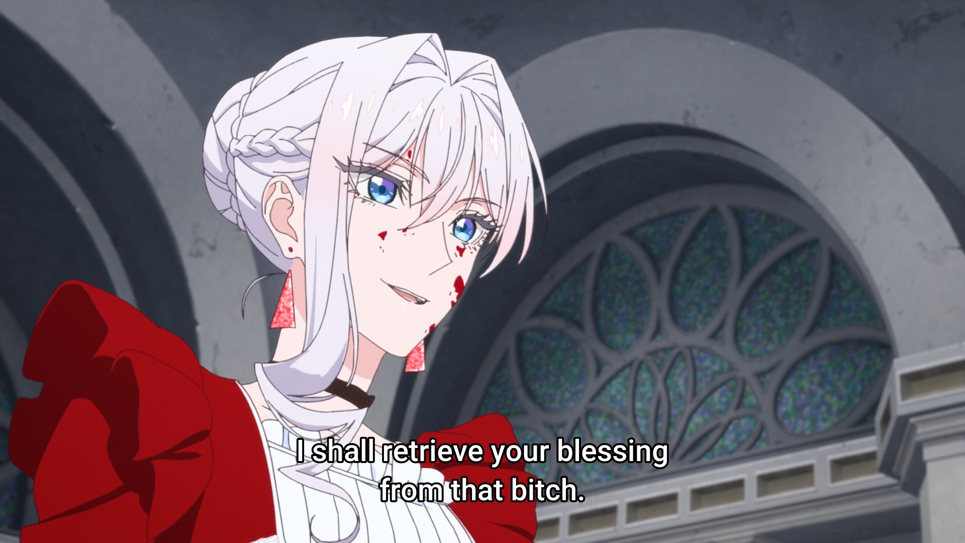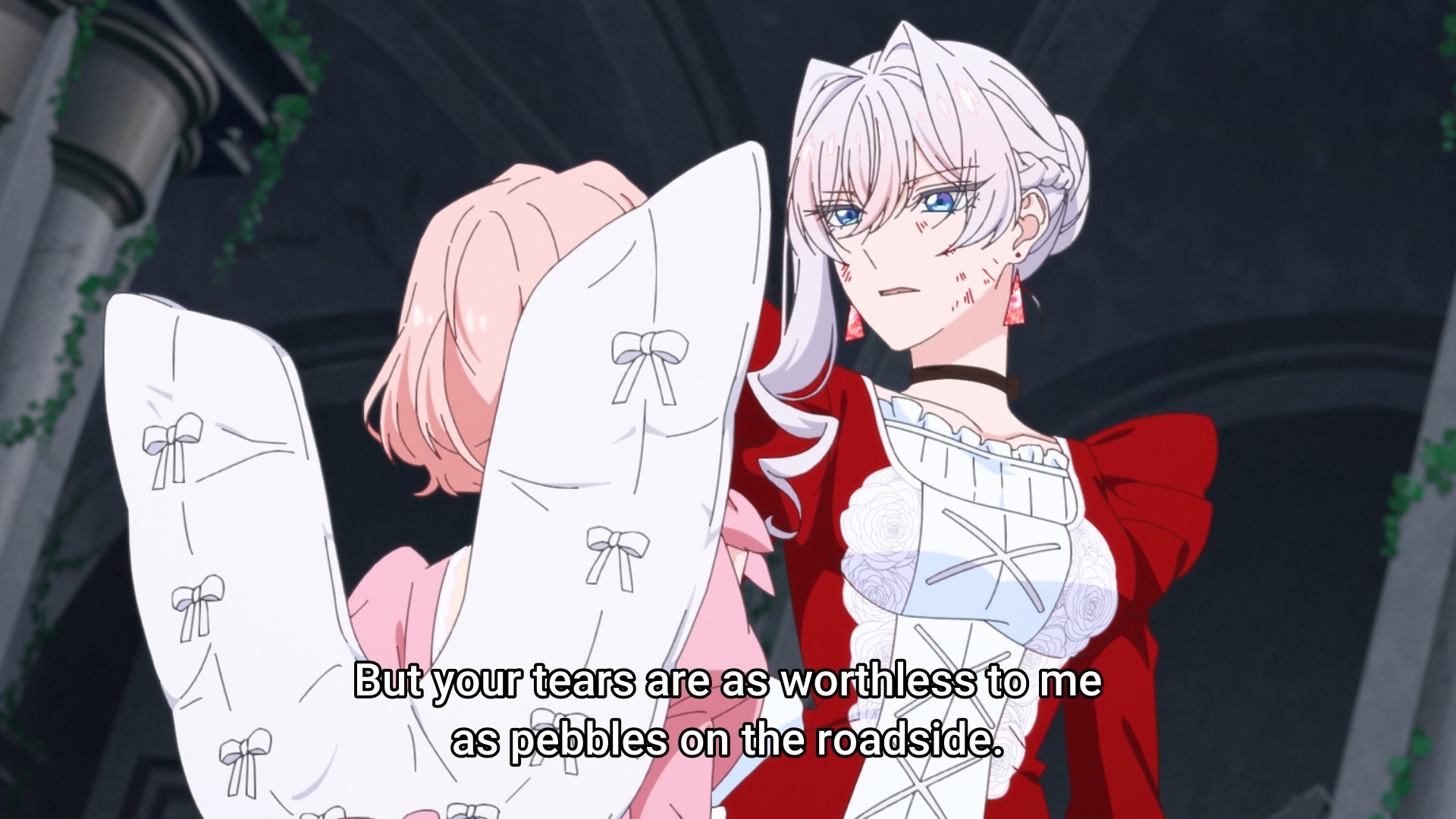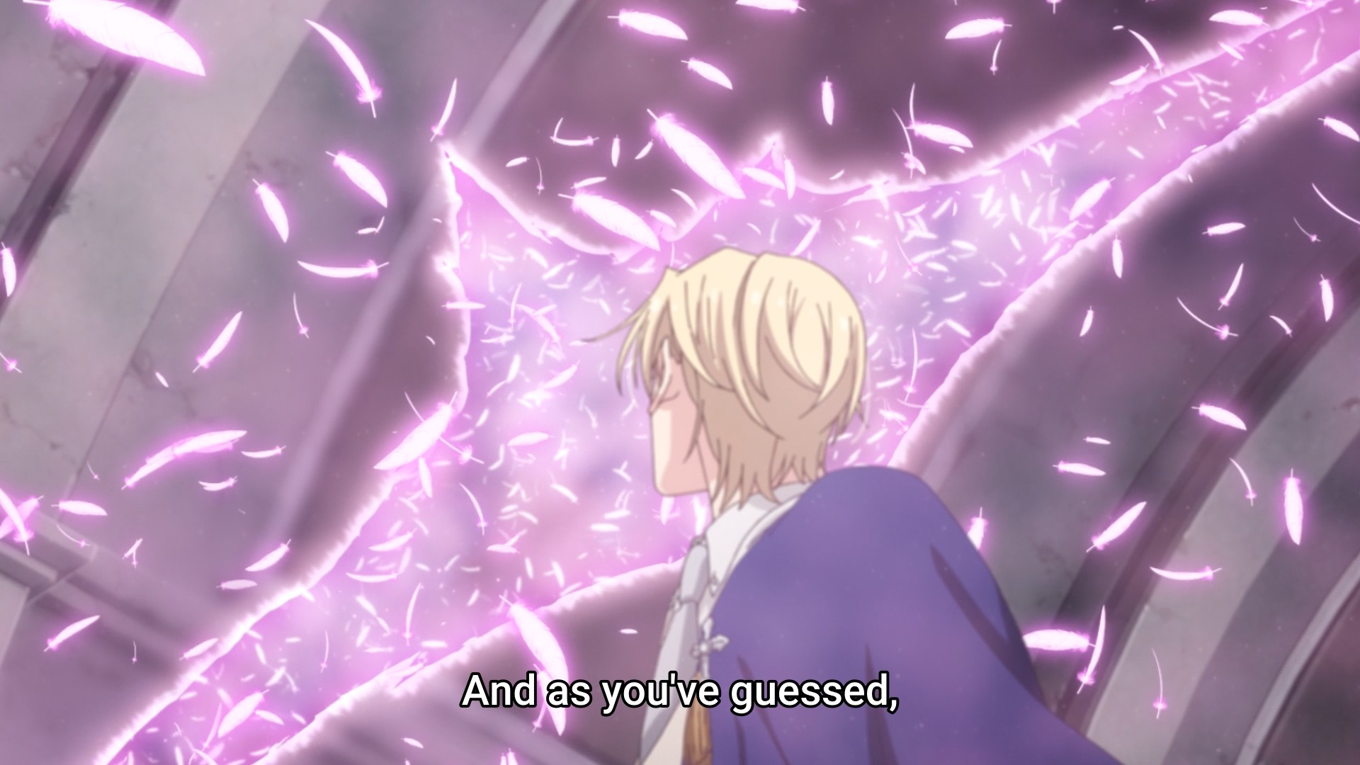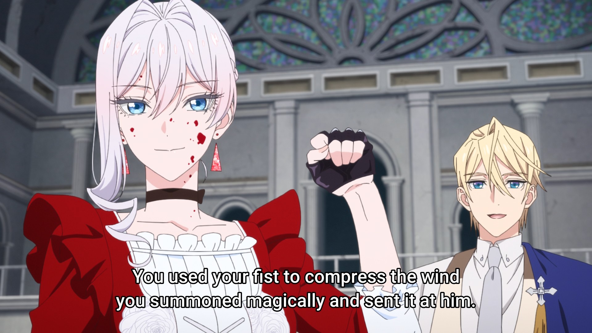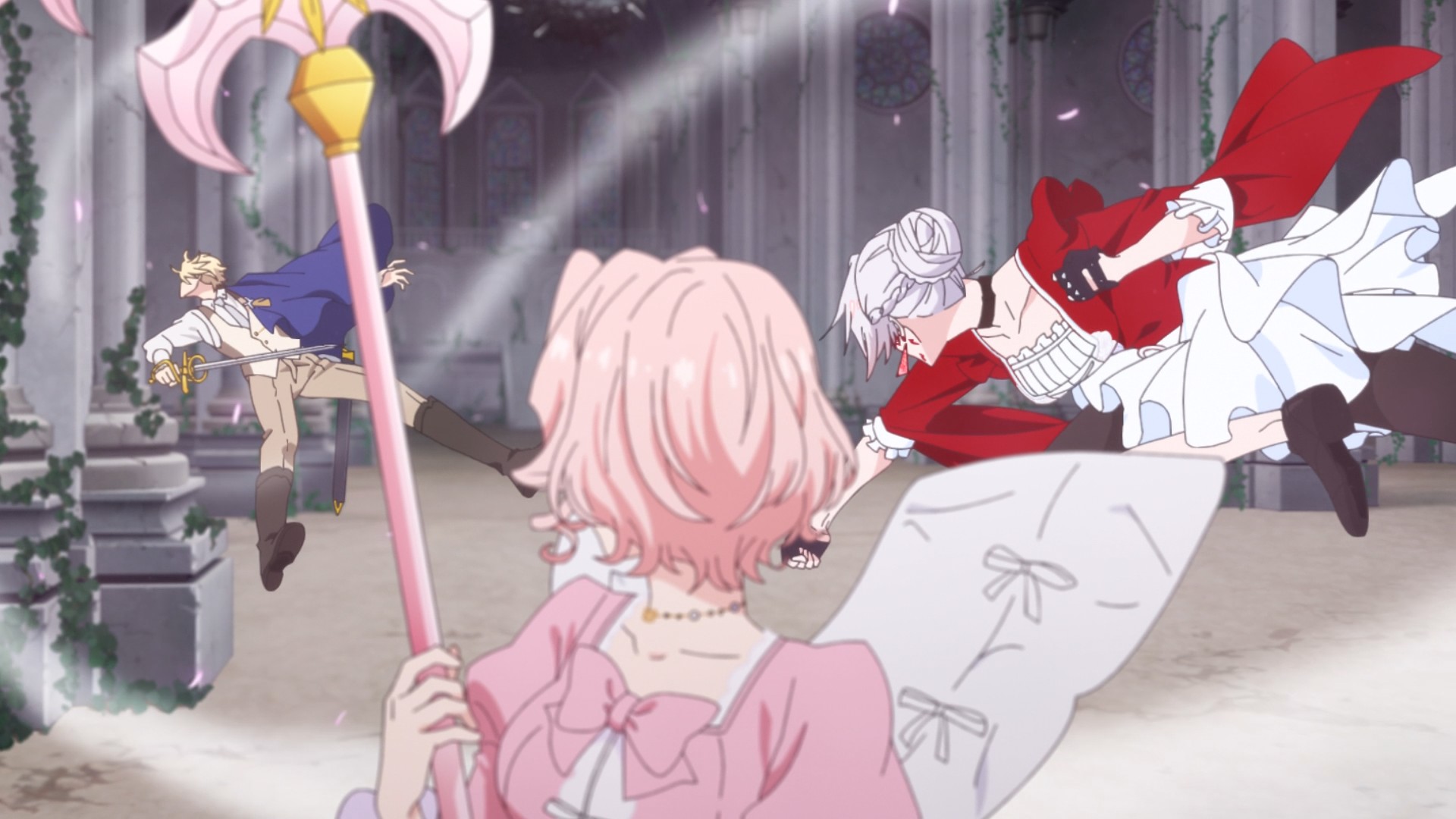 Scarlet didn’t punch Terenezza hard enough. As a result, the pink thing is able to use her final trump card: the prince himself. Well, I finally get what I’ve been asking for: Julius taking a punch to the face. It happens so fast that you can barely see contact being made. Unfortunately, it doesn’t seem like a single punch is enough to snap the prince back to his senses. I still think my kiss theory will bear fruit; the fairy tale motif is just too strong. But that’ll have to wait until next week in the season finale to see how it all plays out.