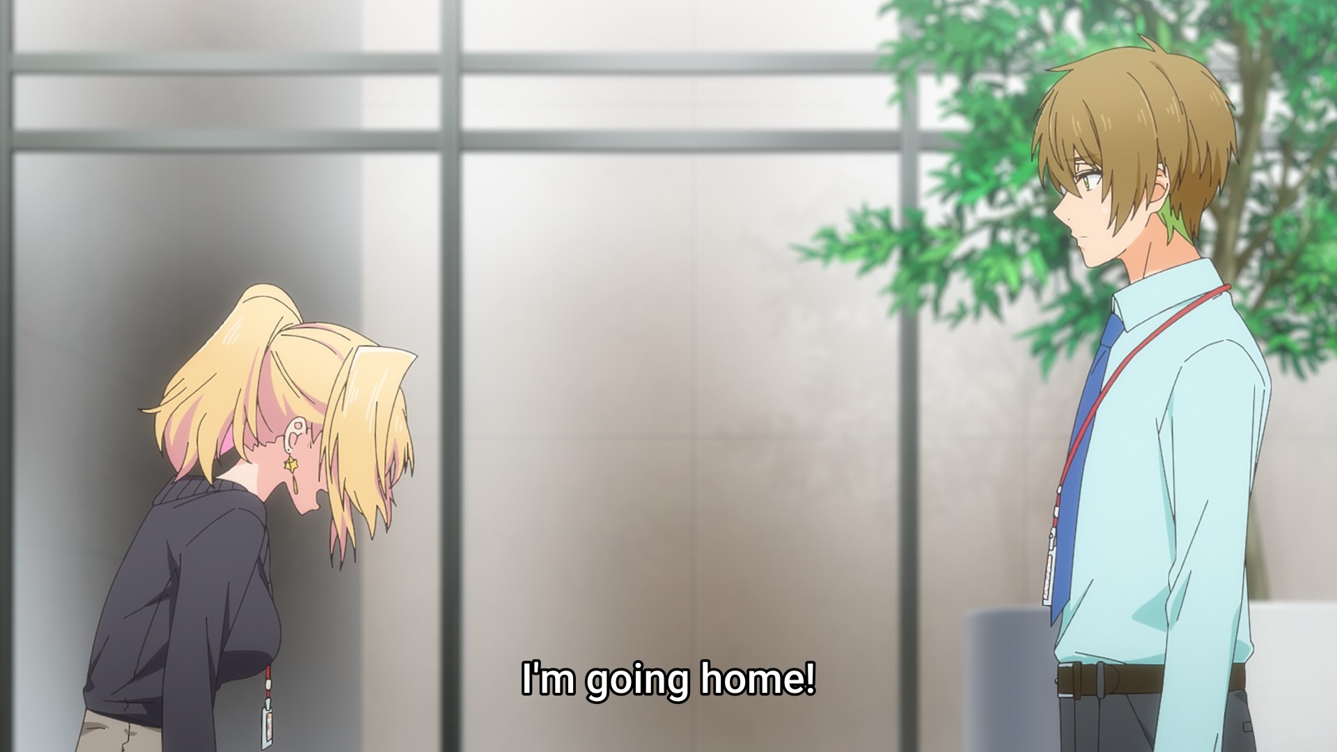 Nope, no backtracking now. Stay on course! I’m not a big fan of dating within the office, especially when there’s a power imbalance. But if you’re going to commit, then commit. This is, however, just the start of the episode, so of course, Kamegawa gets called away before he can properly explain his intentions. Afterwards, Hotta has to spell things out to Kannawa. She should’ve just done this from the start. Meanwhile, Kankaiji tries to advise Kamegawa to finish the damn job. And Kankaiji’s right: Kannawa is the sort of person who won’t believe that someone likes her. After all, she has completely abandoned the idea of making friends at work, so do you really think she would have enough of an ego to believe that Kamegawa likes her on her own? No way. Kamegawa needs to stop dancing around his feelings like some besotted schoolchild, waiting and hoping that their crush — their senpai — notices them. He needs to smash through Kannawa’s defenses like… I dunno, Nemesis from Resident Evil 3 or the Kool-Aid Man.