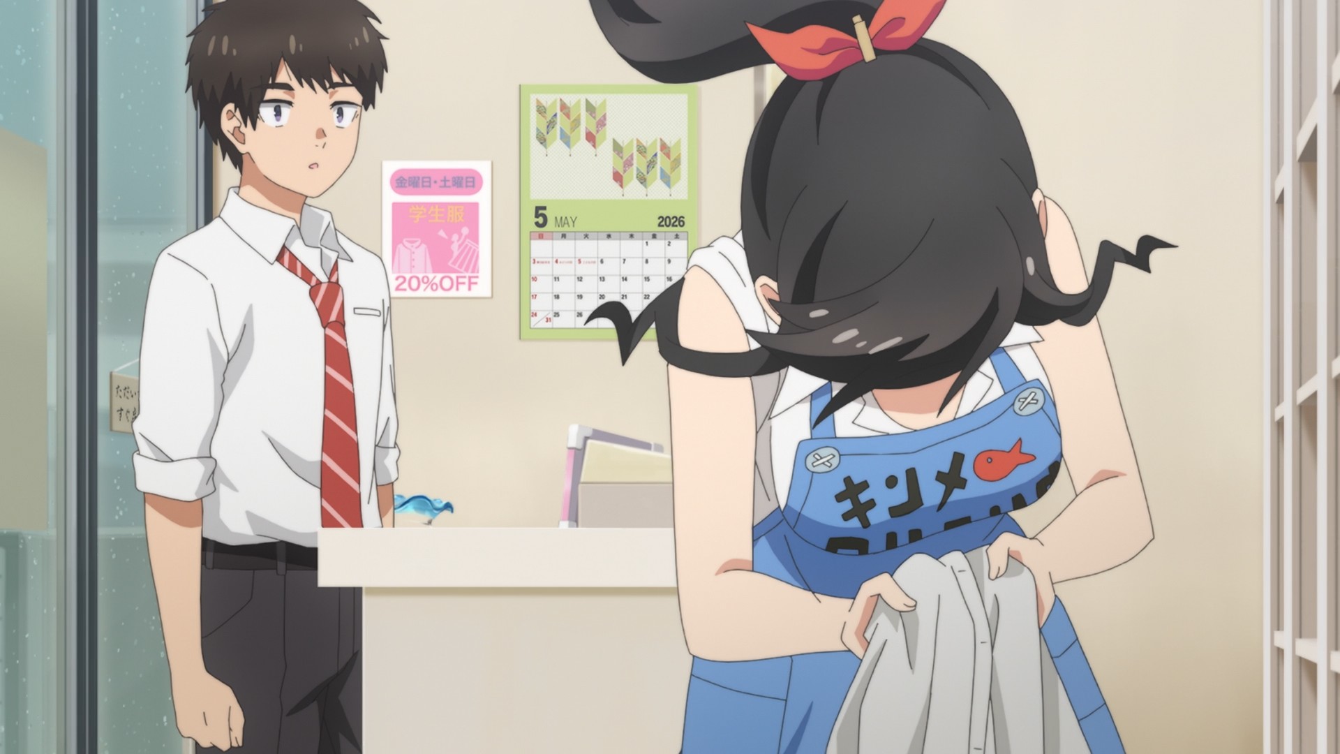 I have two qualms about the show. I knew one thing going in: our protagonist has lost her memories. Unfortunately, the only reference to it in this opening episode is a single line: “It is the one thing I didn’t forget, after all.” This is in response to a customer casually saying, “You sure do love doing laundry, don’t you?” That’s it. If you went in blind and didn’t pay attention for just a couple of seconds, you would’ve completely missed Wakana’s one remark about her amnesia. In other words, this show is practically distilled slice-of-life, and I don’t know if there’s enough here to blog about week in and week out. My second qualm involves Wakana losing her composure around (sigh) a high school boy. I don’t mind age gaps, but it’s a boy. C’mon. When you lost your memories, did you also forget that you shouldn’t be taking an interest in minors? Why did my seemingly wholesome, sleepy, slice-of-life anime suddenly started gooning? Girl, put that away.