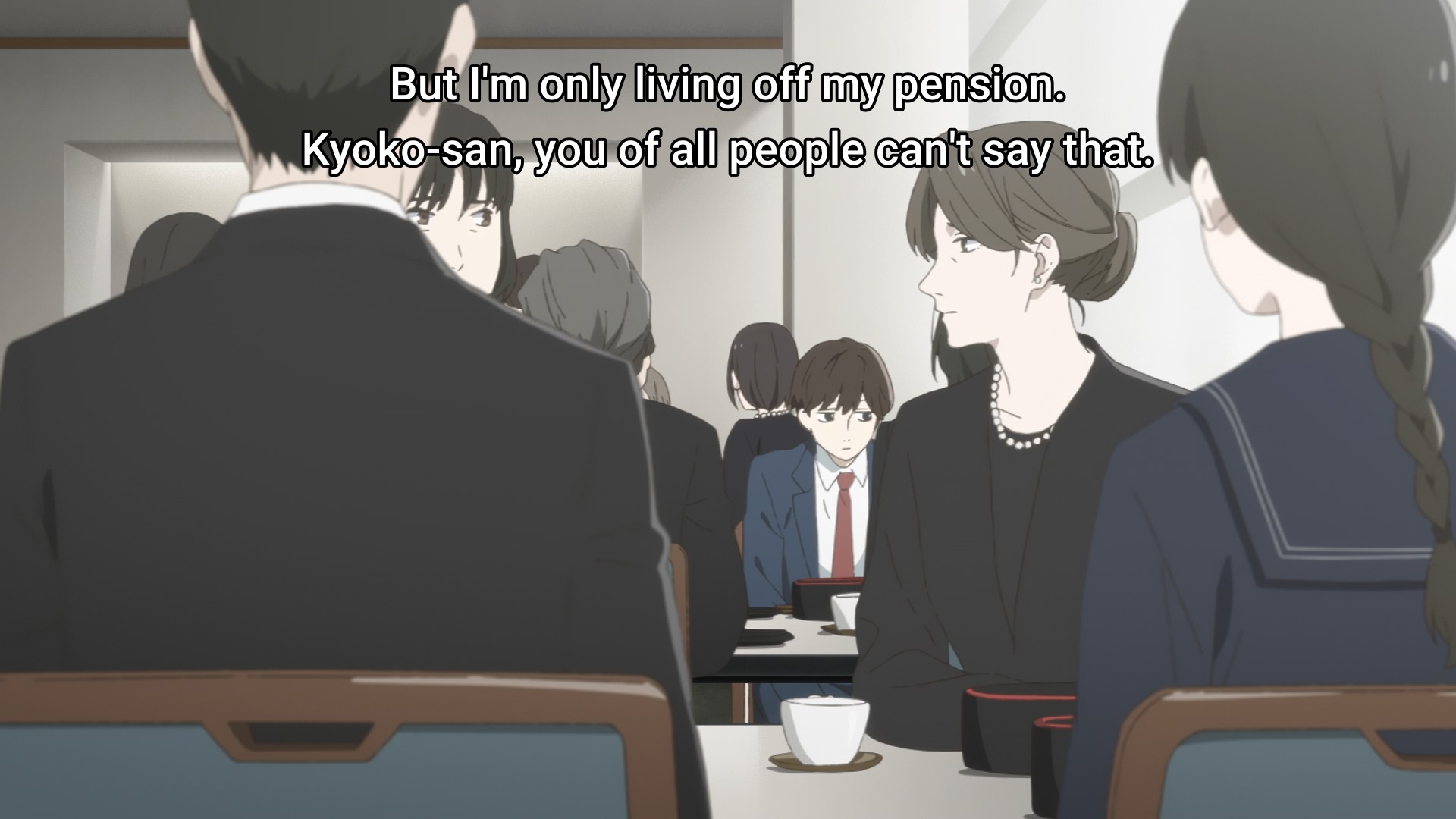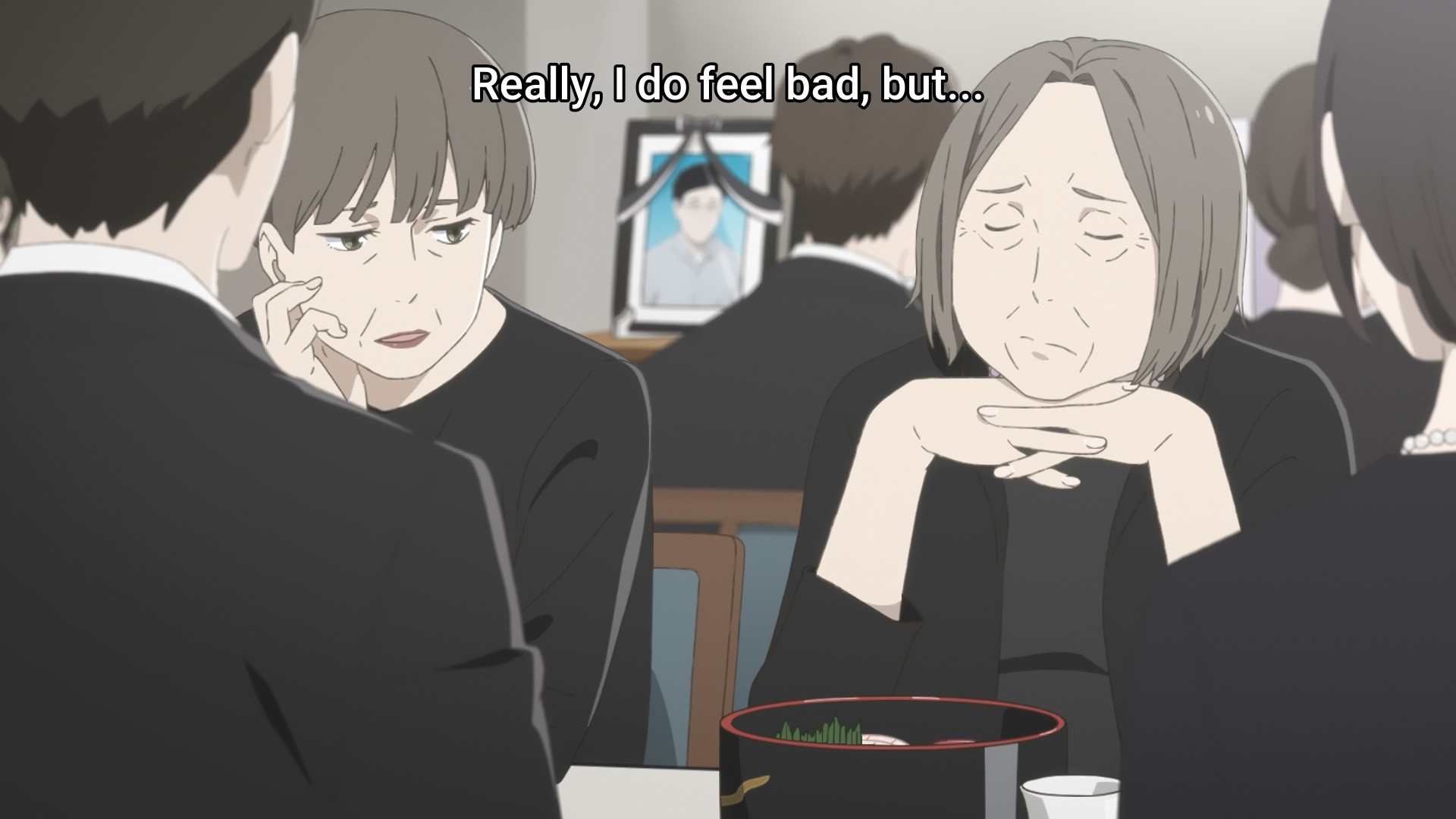 Makio learns that her older sister recently passed away in an accident. An older woman (her mom?) quickly tells Makio to take in Asa, her bereaved niece. Makio tries to protest, because her apartment is hardly fit for a child. Hell, I wouldn’t say it’s fit for a grown adult either. It’s a complete pigsty. Sure, Makio might be reserved and introverted, but I assure you we’re not all like that. A good lot of us can keep our domiciles relatively clean. But Makio can’t, and this is one of the many reasons why caring for Asa would be terribly inconvenient. But you know what else is even more inconvenient? Losing your parents. So tough shit, right? At the end of the day, someone has to step up and do what’s best for the child. I’m equally bemused and saddened by the old lady’s casual hypocrisy. “Have a heart for goodness’s sake,” she says. Excuse me? What about you, ma’am? Where’s your heart? You’re passing the child off to someone else in front of the child. How do you think that makes her feel? In fact, look at all these people who have gathered for the funeral. Where are their hearts? I thought we all agreed that it takes a village to raise a child!