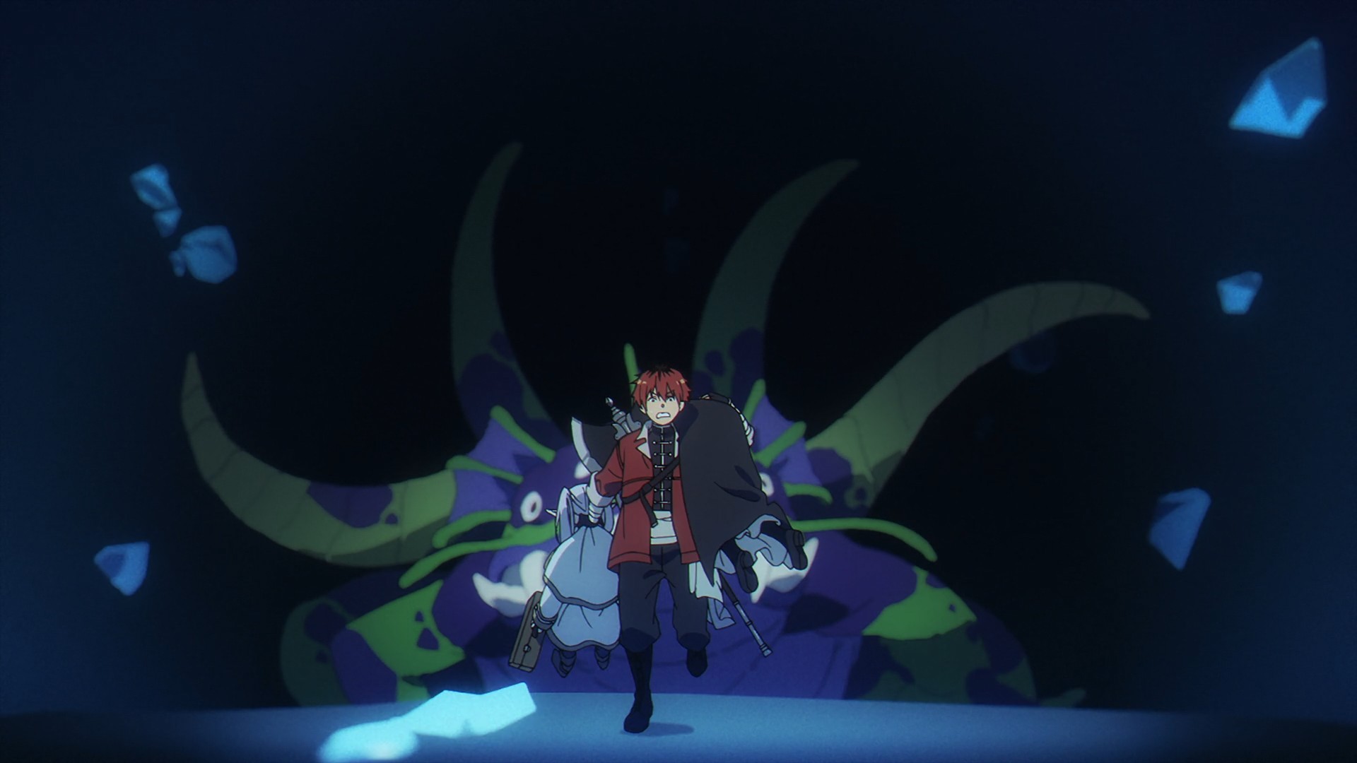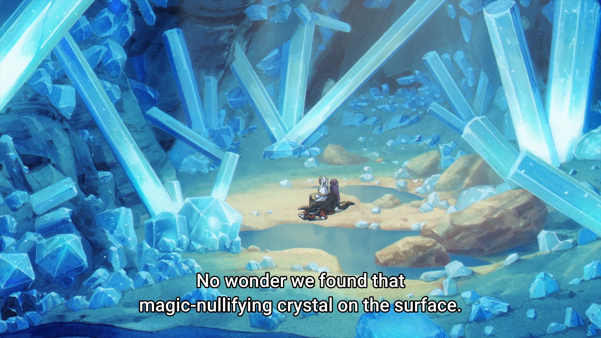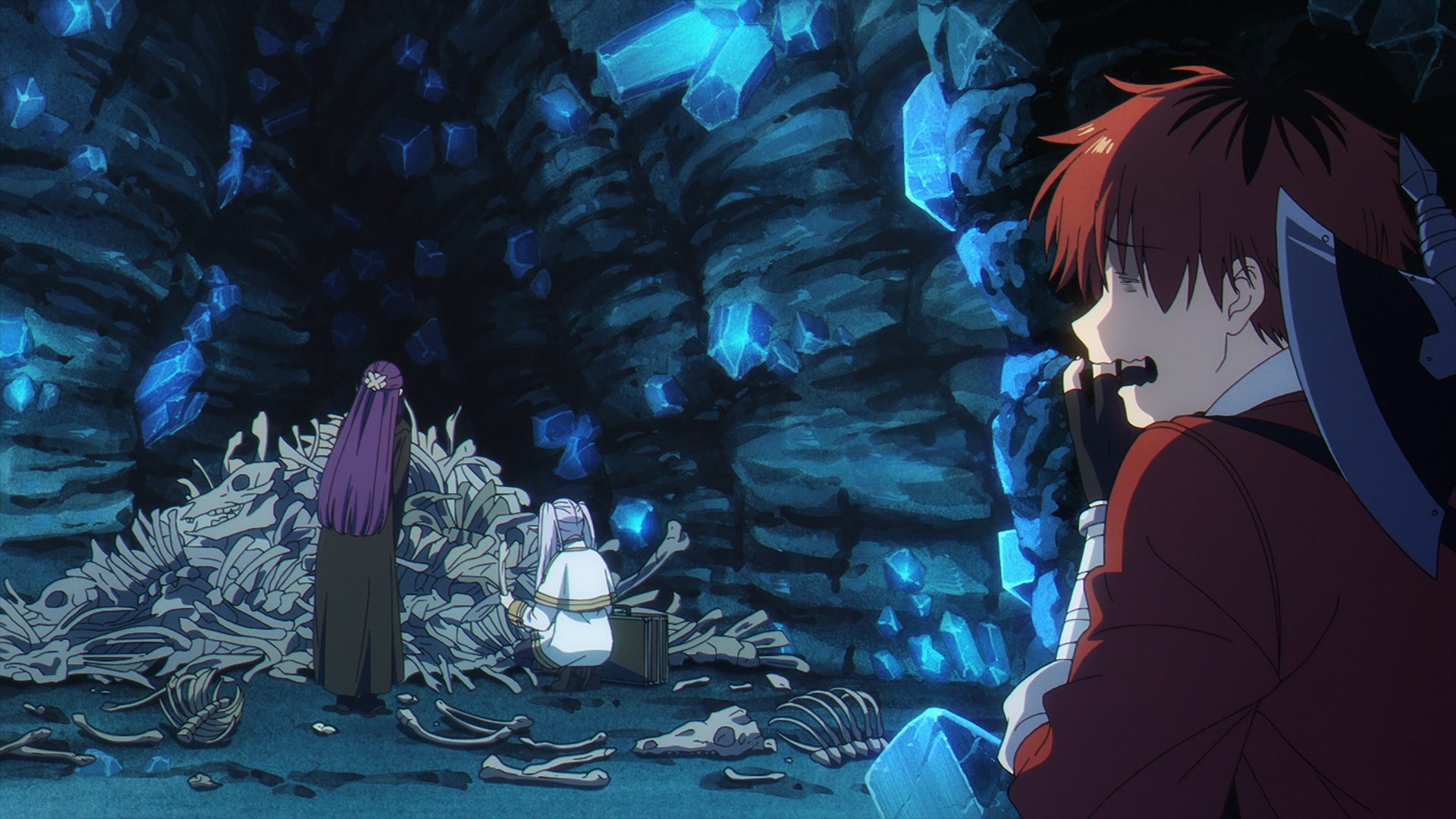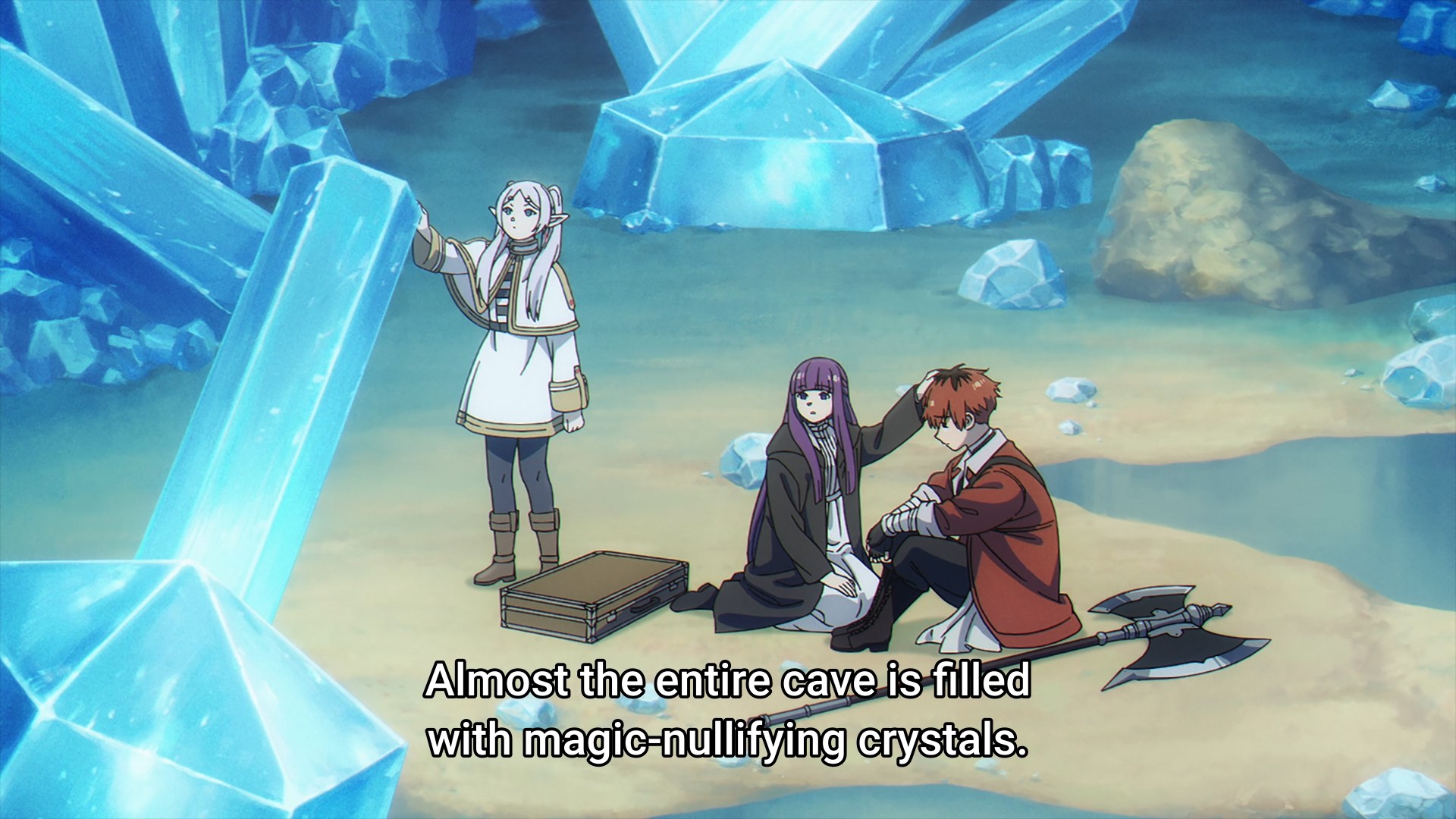 Frieren finds a magic-nullifying stone that is supposedly worth a fortune. As you can imagine, something like that would render her and Fern rather helpless. As a result, Fern wants them to get rid of stone as soon as possible. My first thought is, Isn’t that a bit drastic? I mean, they do have a warrior capable of slaying a dragon. Why not rely on Stark to protect them until they can properly sell it? But Frieren turns the crystal into a light show before quickly following Fern’s advice. Unfortunately, they can’t avoid the crystals that easily, because the party soon stumbles upon an entire cave network full of said magic-nullifying crystals. It’s practically a gold mine. And also, the women have no choice but to rely on Stark now.