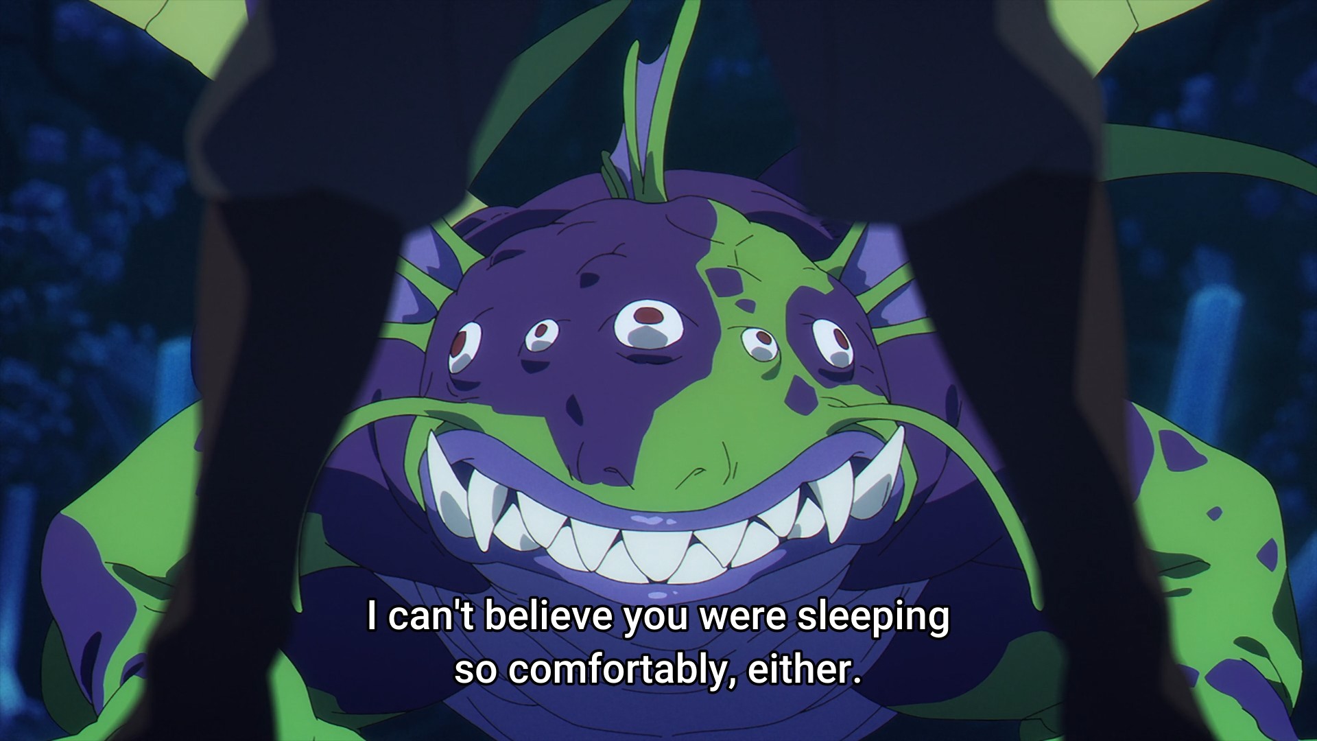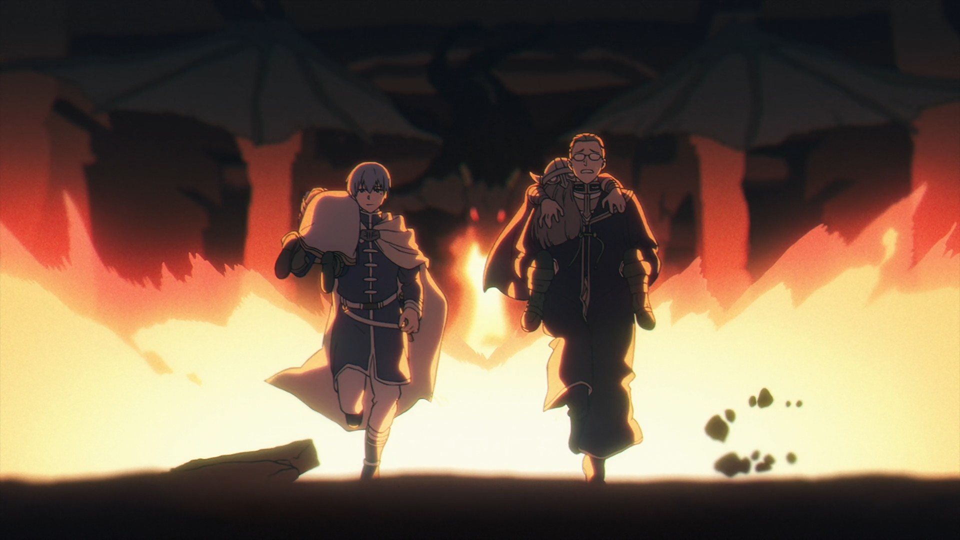 Before Stark can give Fern any reassurance, however, a “venomous apex dragon” rears its ugly head. The creature’s design is oddly clashing, no? I mean, compared to our party and the environment around them, a dark, saturated purple and toxic green, five-eyed dragon just looks odd. Oh well. In one breath, Frieren warns Stark that he’ll die “again” from poison, whatever that means. In another breath, she tells him that she has utter trust in him. Stark has been through a lot since he joined Frieren and Fern on this journey, but he’s still a bit craven. But it’s nothing to be ashamed of. Scared people tend to survive a little longer. So the trio books it, which finally triggers in Frieren a memory of Himmel and their former party. Finally. I’ve been wondering when we would get our first flashback. And in it, we see that even the great Himmel of yore found himself in situations where the only solution was to run.