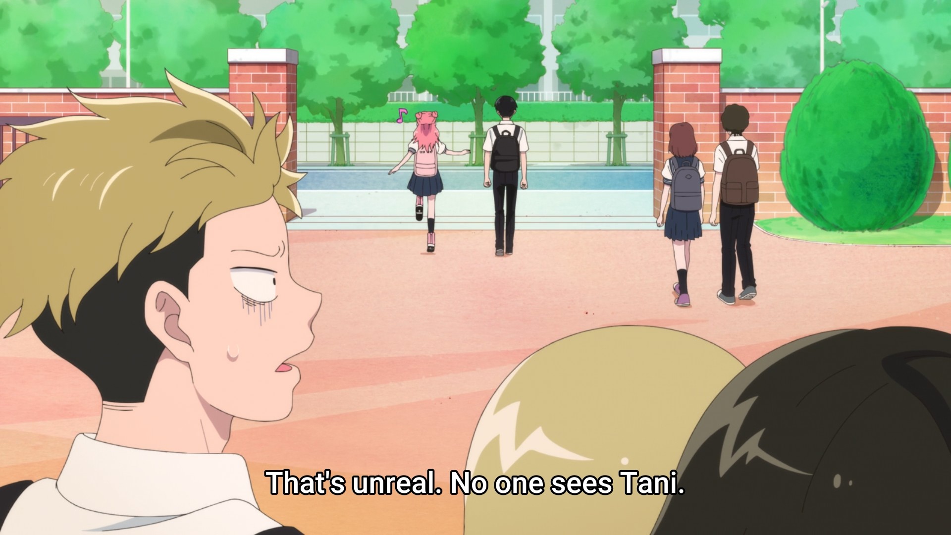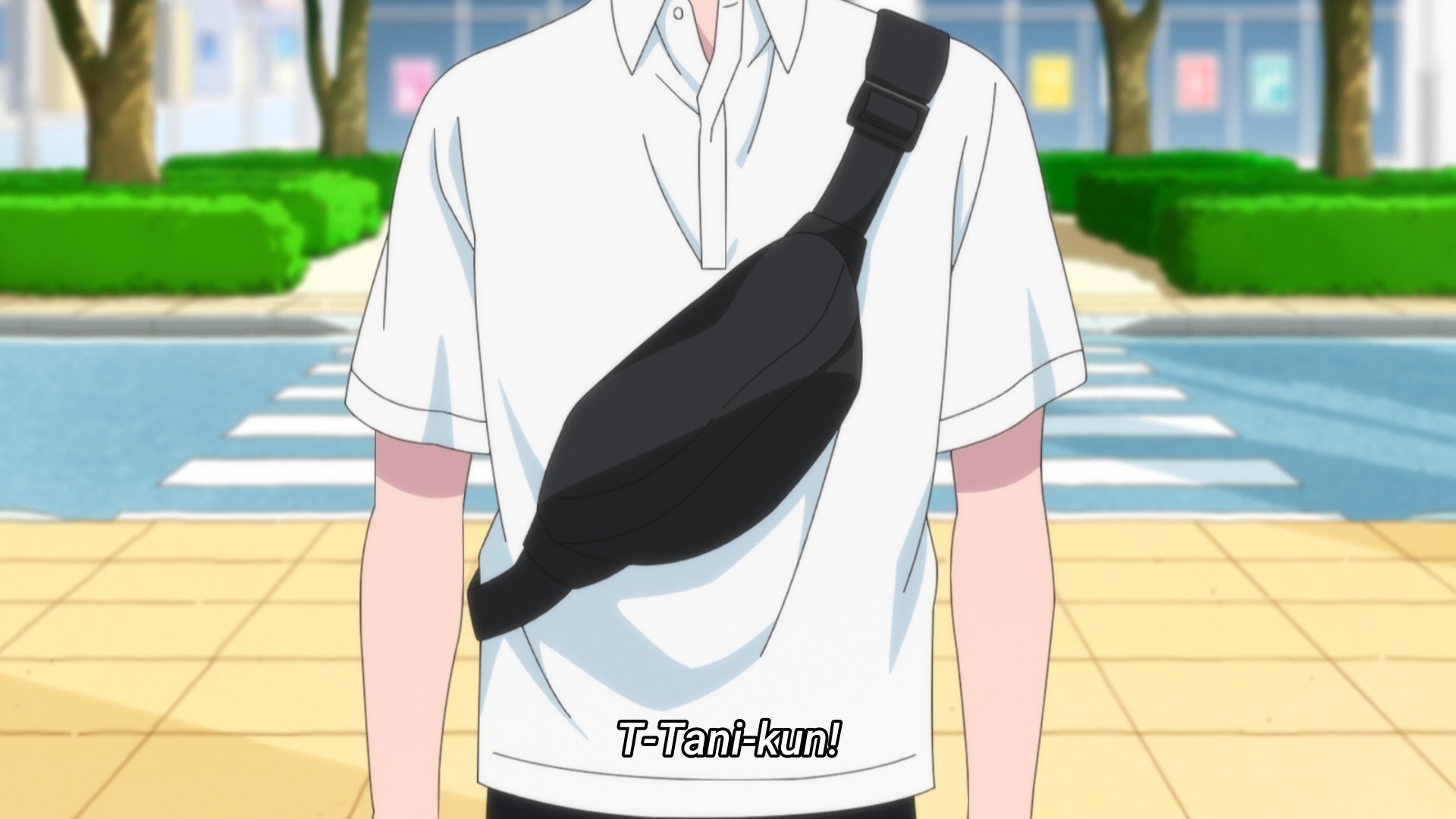 When they started walking home together later in the episode, everyone says their goodbyes to her and her alone. They do not even notice or acknowledge Tani, who is literally right next to her. I mean, I guess this is possible. It’s just odd. Even a loser like me has a friend group. Maybe the mangaka just didn’t want to bother, because it would mean too many moving parts to deal with. I still would have done something like an online gaming buddy, at least. Tani seems like the type, y’know?