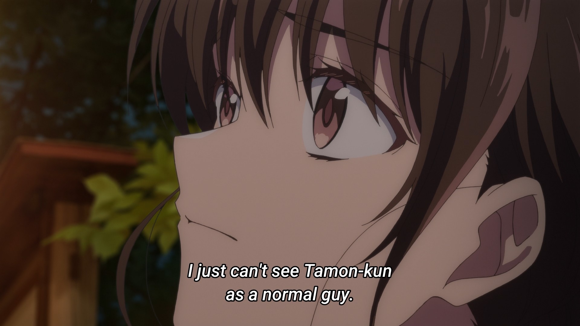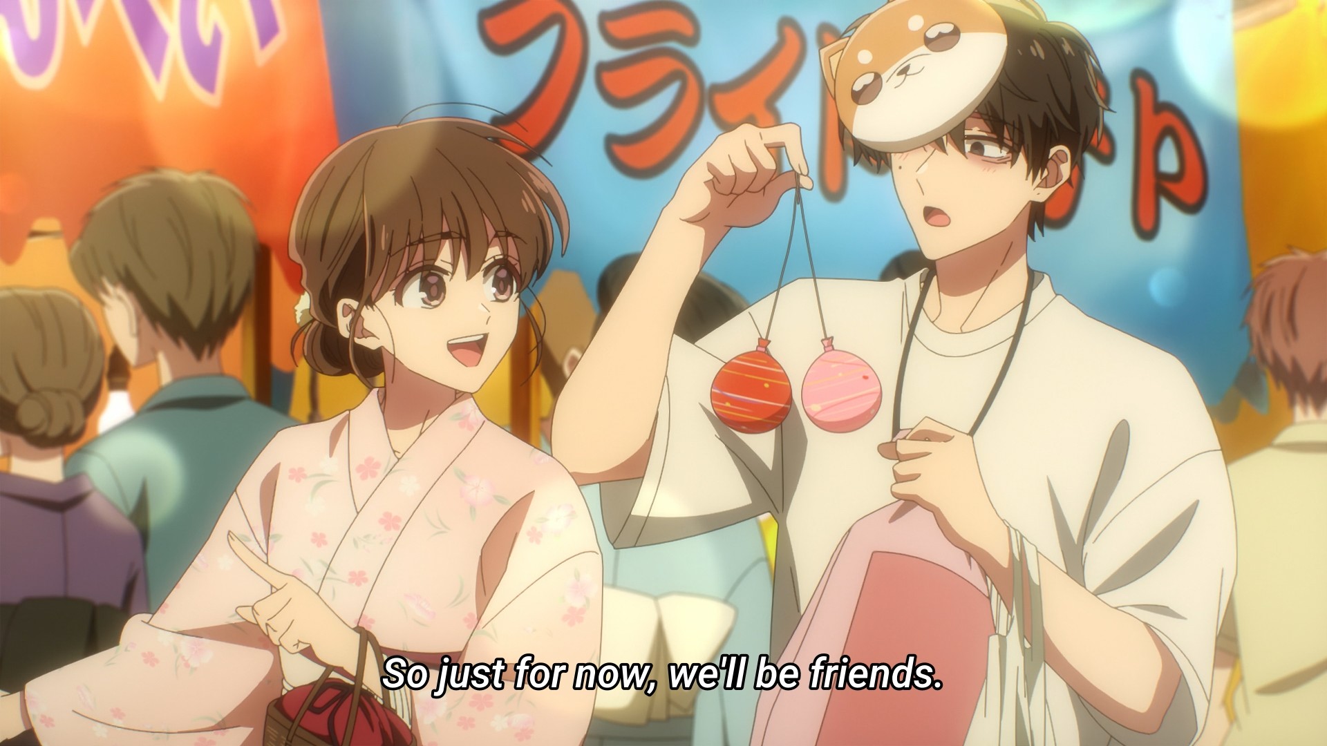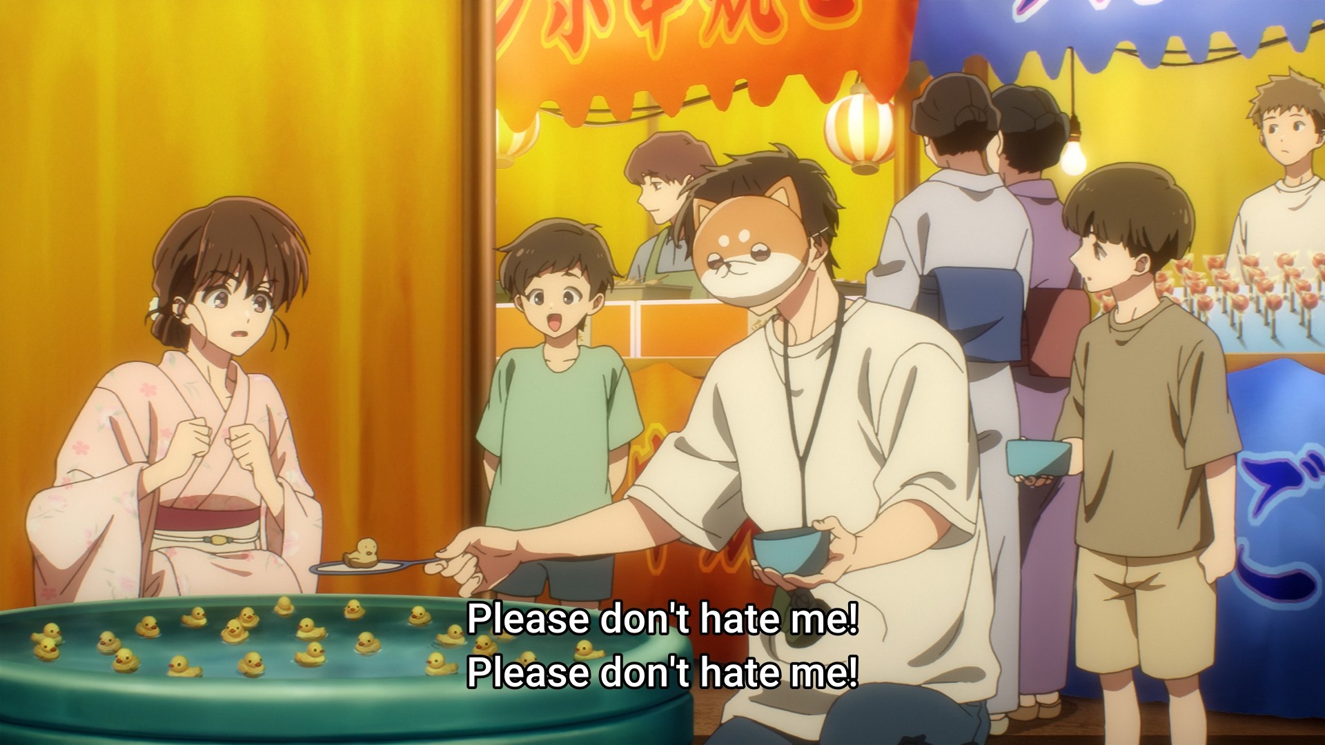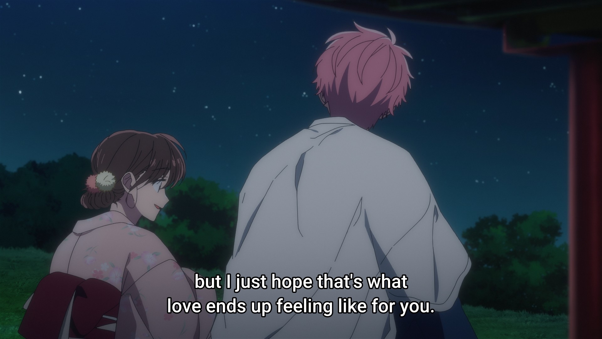 When the fireworks go off, Tamon can’t help but stare at Utage instead. It’s a common trope in romantic anime. You find the person even more beautiful than the fireworks, so you look at them the entire time. You see it in Kaguya: Love is War, you see it in My Dress-Up Darling. It’s almost like Tamon’s falling for Utage right there and then. But she immediately shoots him down, because y’know, her boundaries as a fan. Again, we’re only on episode four. We’re not rushing this. We’re gonna drag this baby out, woo! But also again, Utage is so exhausting.