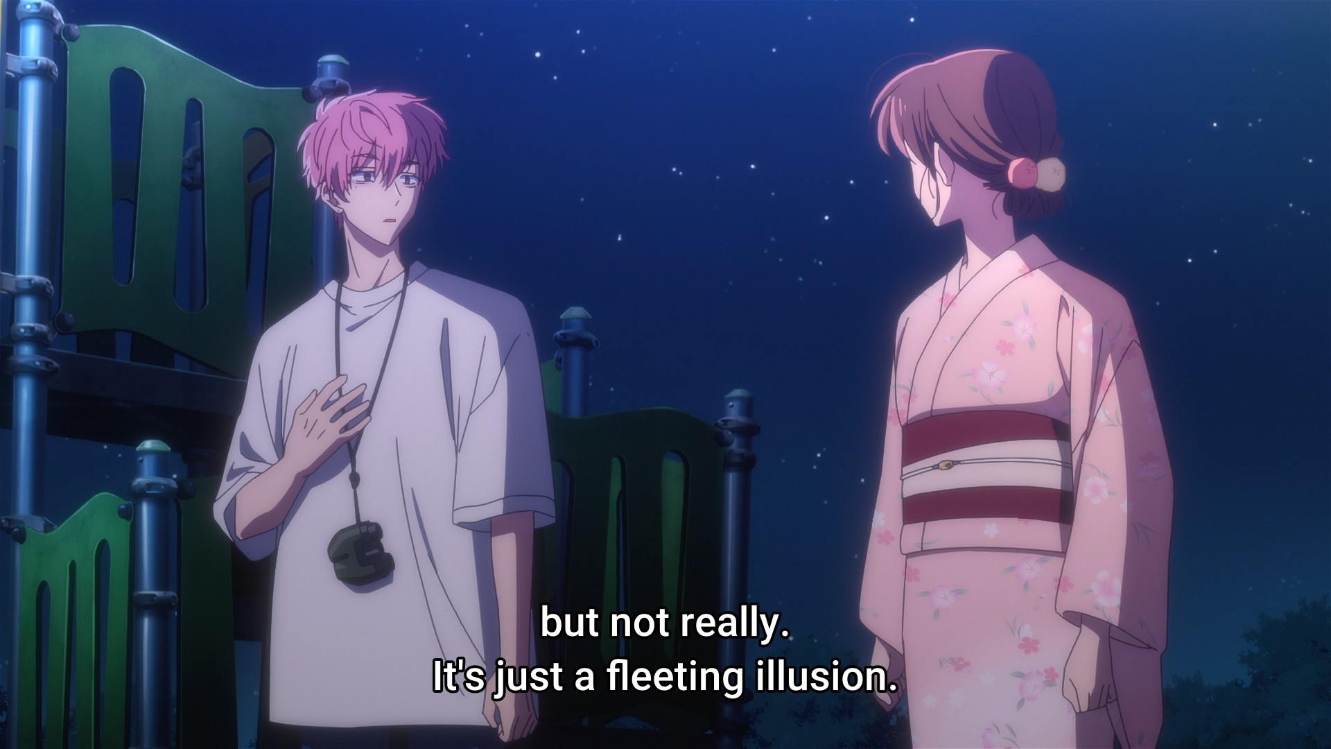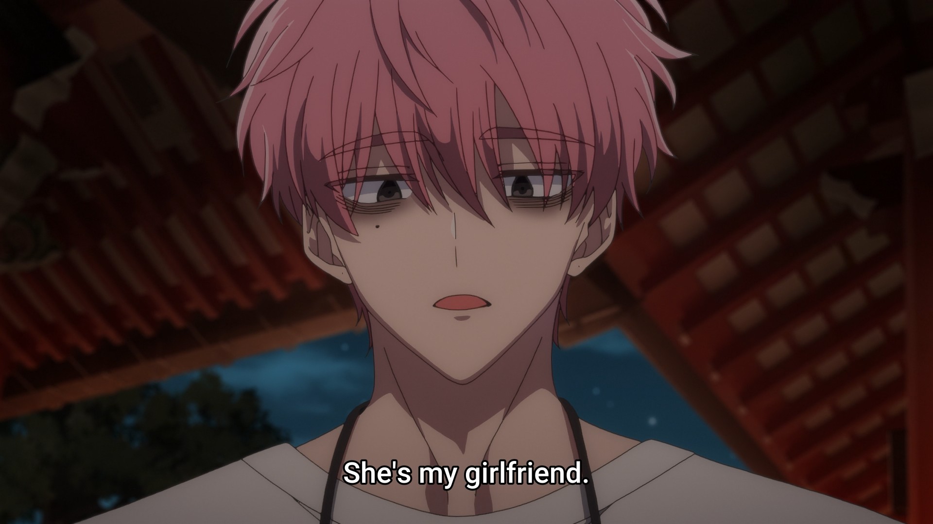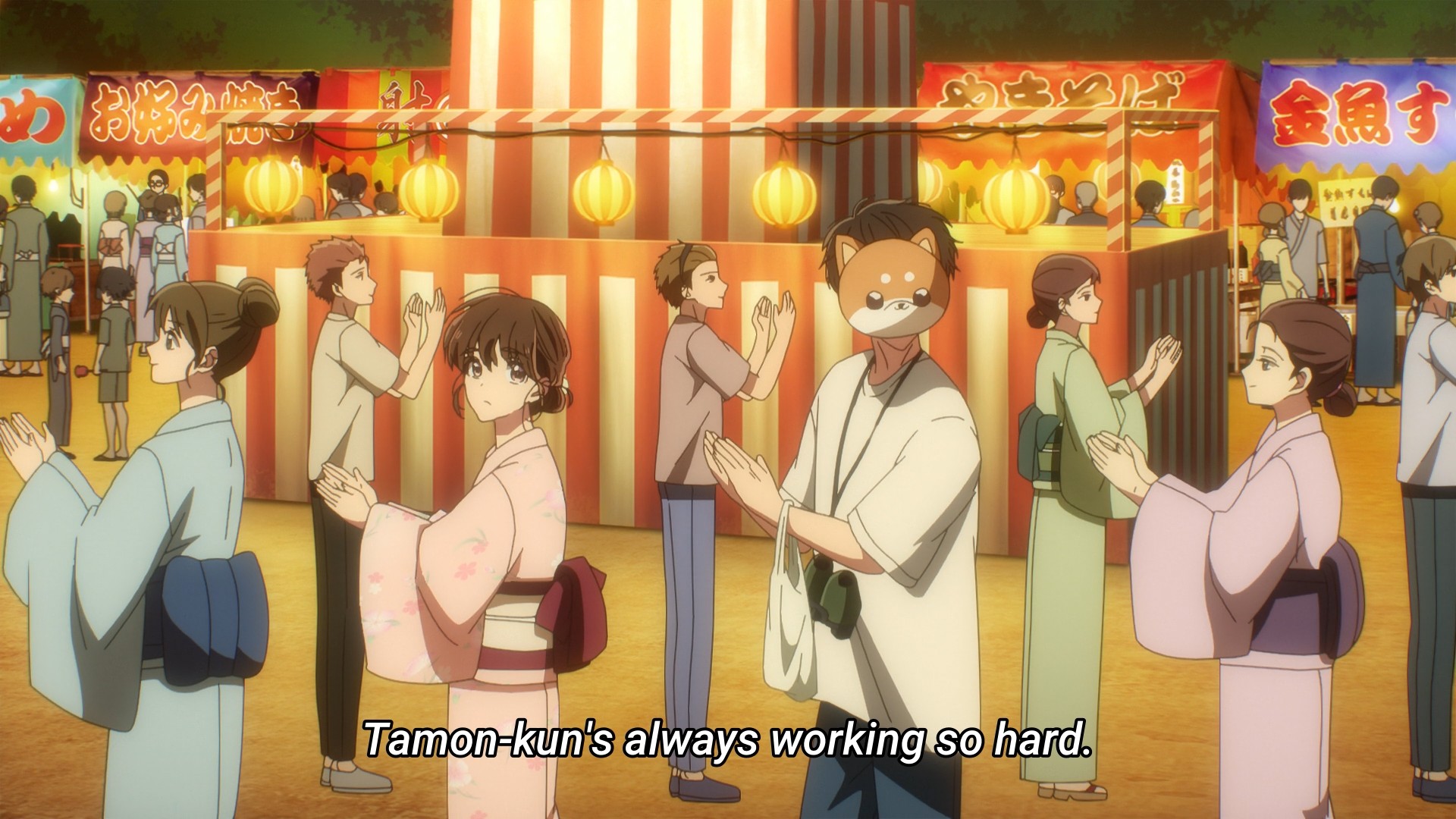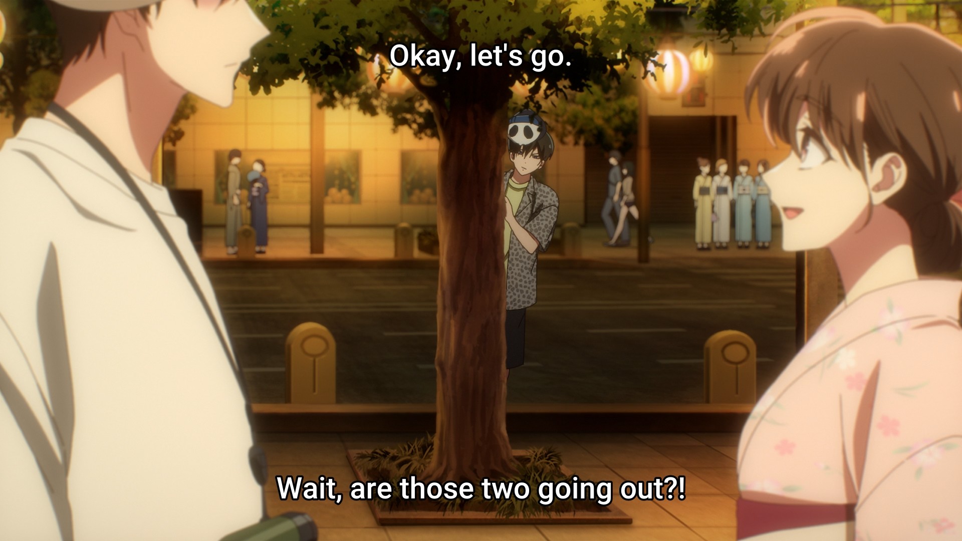 When the fireworks go off, Tamon can’t help but stare at Utage instead. It’s a common trope in romantic anime. You find the person even more beautiful than the fireworks, so you look at them the entire time. You see it in Kaguya: Love is War, you see it in My Dress-Up Darling. It’s almost like Tamon’s falling for Utage right there and then. But she immediately shoots him down, because y’know, her boundaries as a fan. Again, we’re only on episode four. We’re not rushing this. We’re gonna drag this baby out, woo! But also again, Utage is so exhausting.