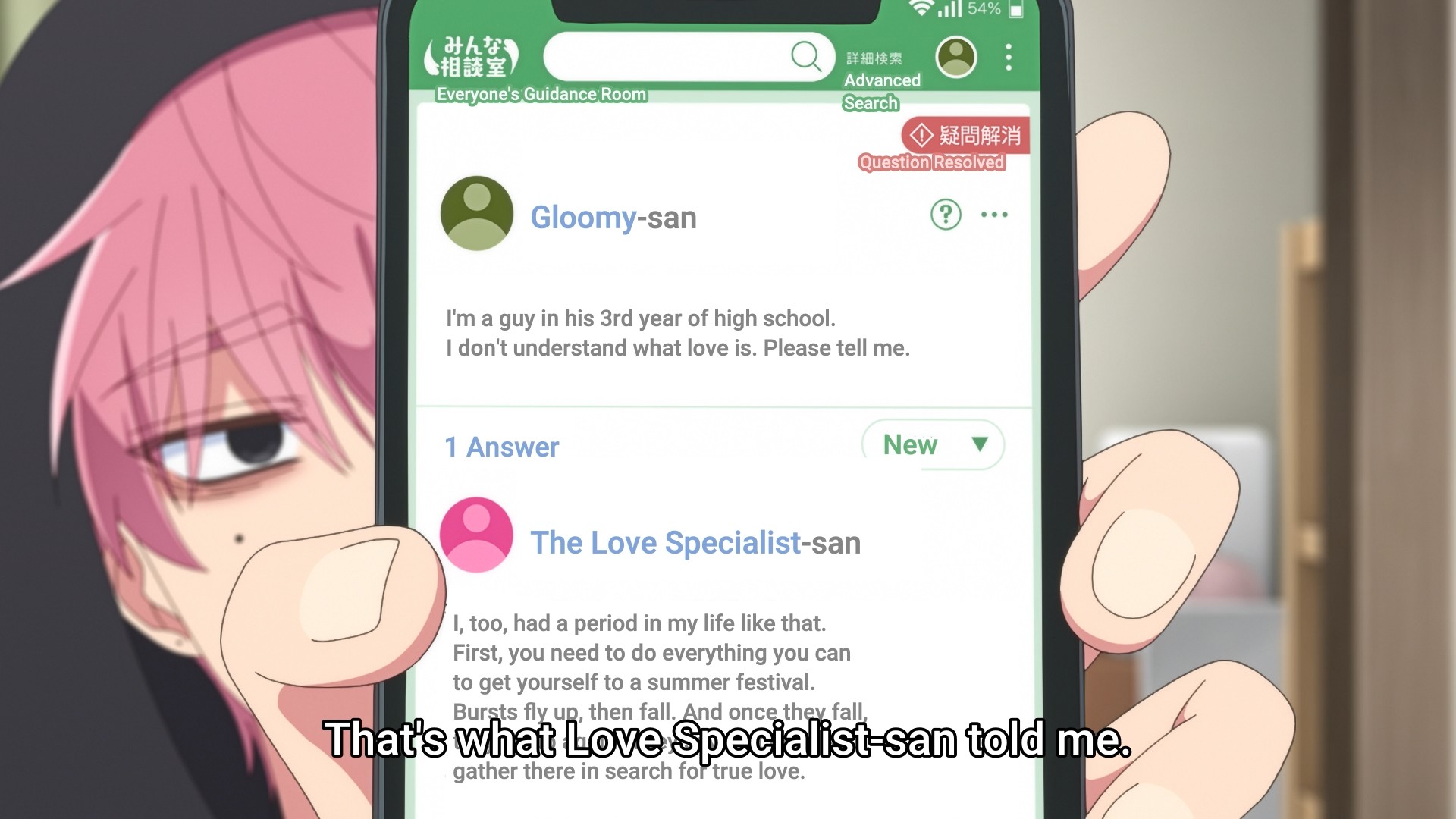 Regardless of the bet, Utage is gonna help Tamon maintain his center position. And first things first, he needs to understand what romantic love is. All of a sudden, he wants to hit up a summer festival. Sounds like Tamon got shitty advice from an AI bot. But it’s kind of a date-like activity, so maybe he’ll fall in love with Utage there or whatever. Unfortunately, her first inclination is to immediately reject his request because “[t]he only way a lone fan would be allowed to go with Tamon-kun to a summer festival is in their own delusion.” Christ, she’s exhausting. The worst part isn’t that she’s a crazed fan who insists on putting Tamon on a pedestal. The worst part is that she’s afraid to simply be his friend — a normal friend who needs your help. If I were in his shoes, that feels lonely to me.