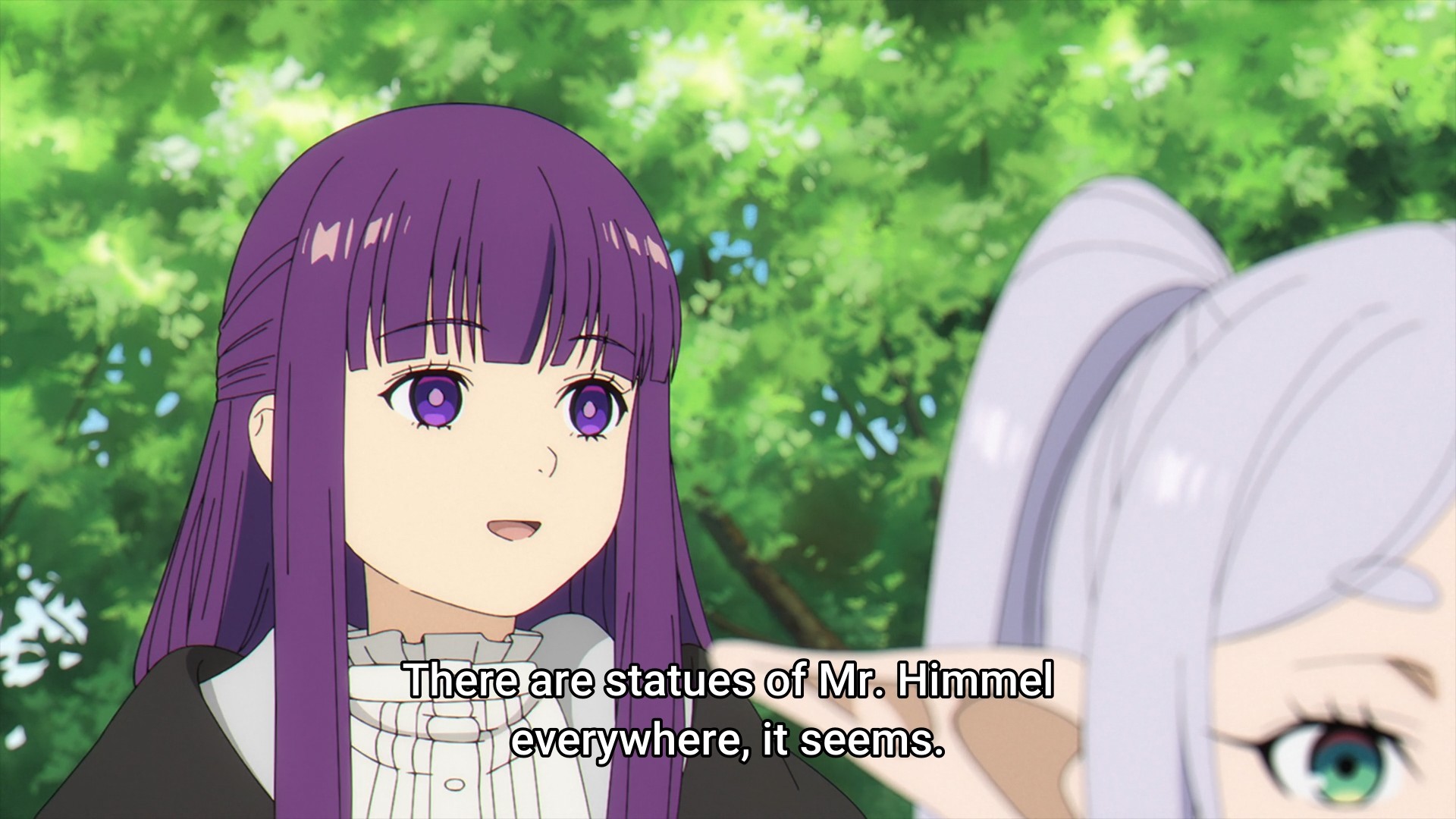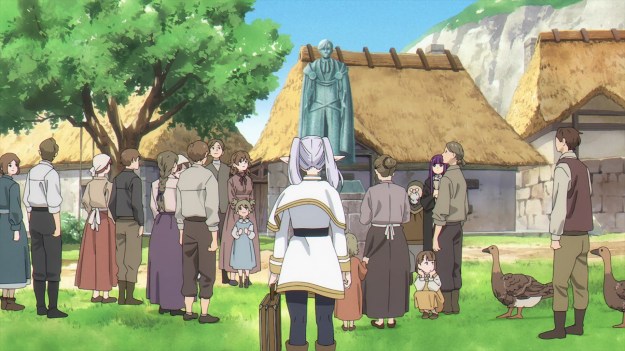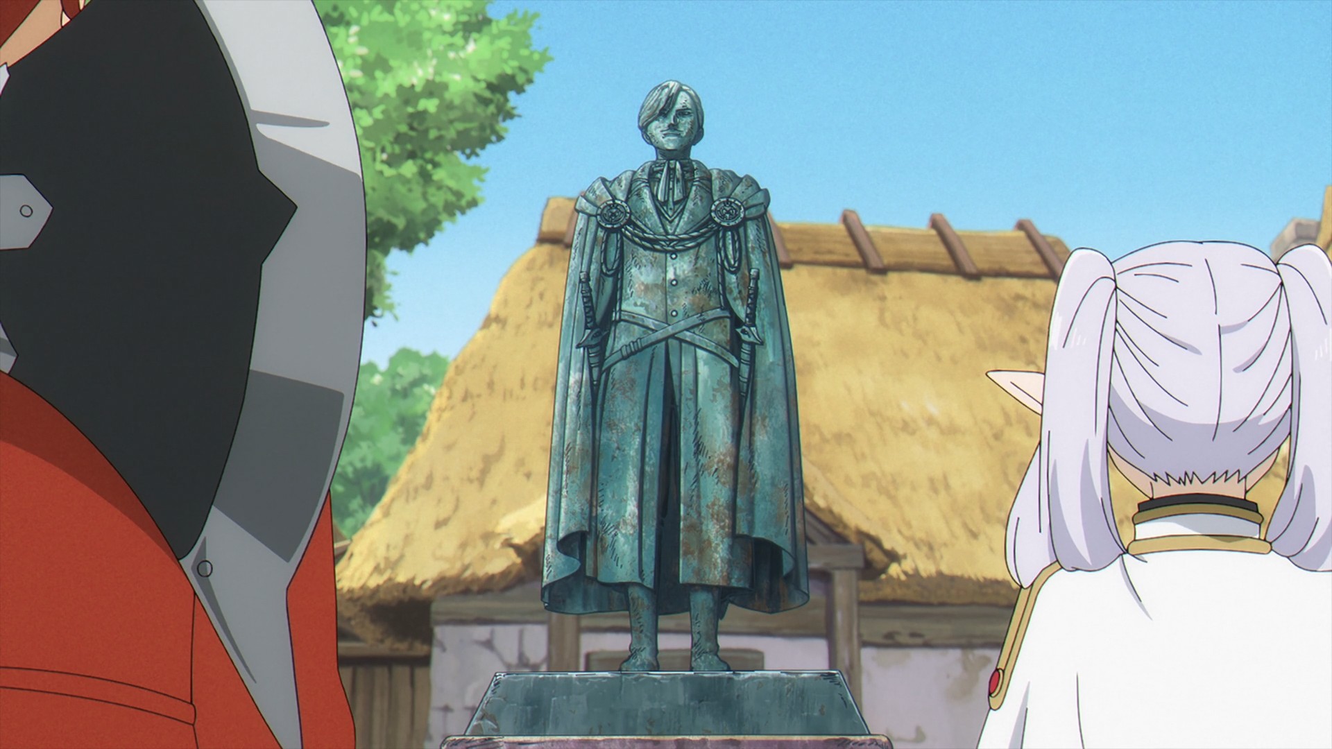 Eh, I’m personally not a fan of having my future set in stone, so I hope the Hero of the South just had really, really accurate predictions. Take Frieren’s recruitment for instance. Why did he bother asking her if he already knew she wouldn’t join him? What was the point? Before he left, the Hero of the South even added that Himmel would change Frieren’s life. But if our future has already been decided for us, then nothing changed. What happened later was always going to happened. Who’s to say that your emotions are even yours to control? It has already decided how you will feel. If you want to tell me that this is not how it works, then why? Why are some things set in stone and others not? But I should probably move on from this, because I don’t want to get into cause and effect, determinism, and all that jazz. I’m just reiterating that I’m not a fan of any plot device that involves seeing an immutable future. For certain viewers, this scene is probably meant to give them shivers or whatever. But I think real life fortune tellers are charlatans, and this is unfortunately coloring my experience of this portion of the episode. Frieren kinda teases the man in memoriam, but only because he thought he would be forgotten in history’s weave. But instead, he is still celebrated to this day. I guess he couldn’t see that future.