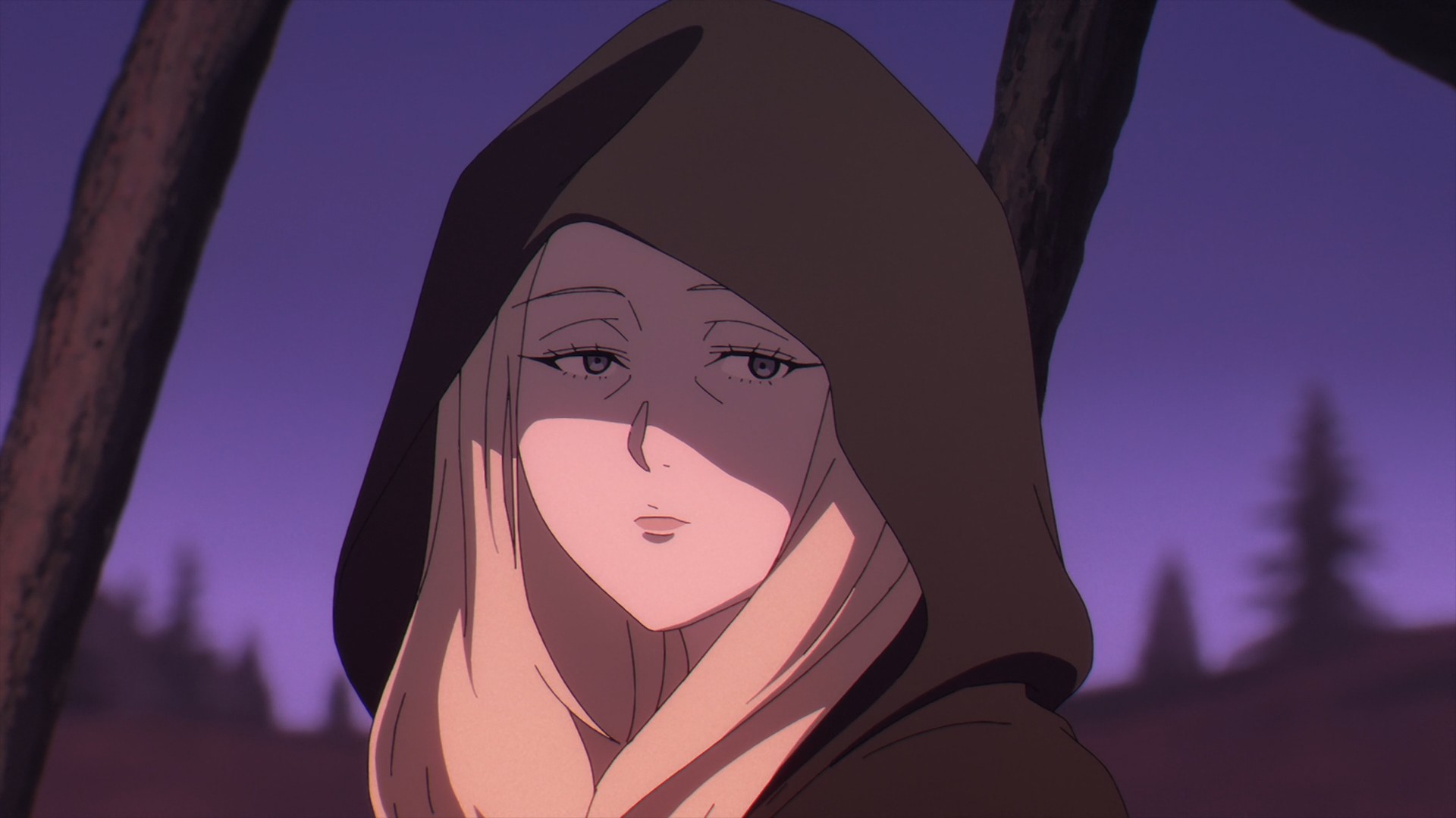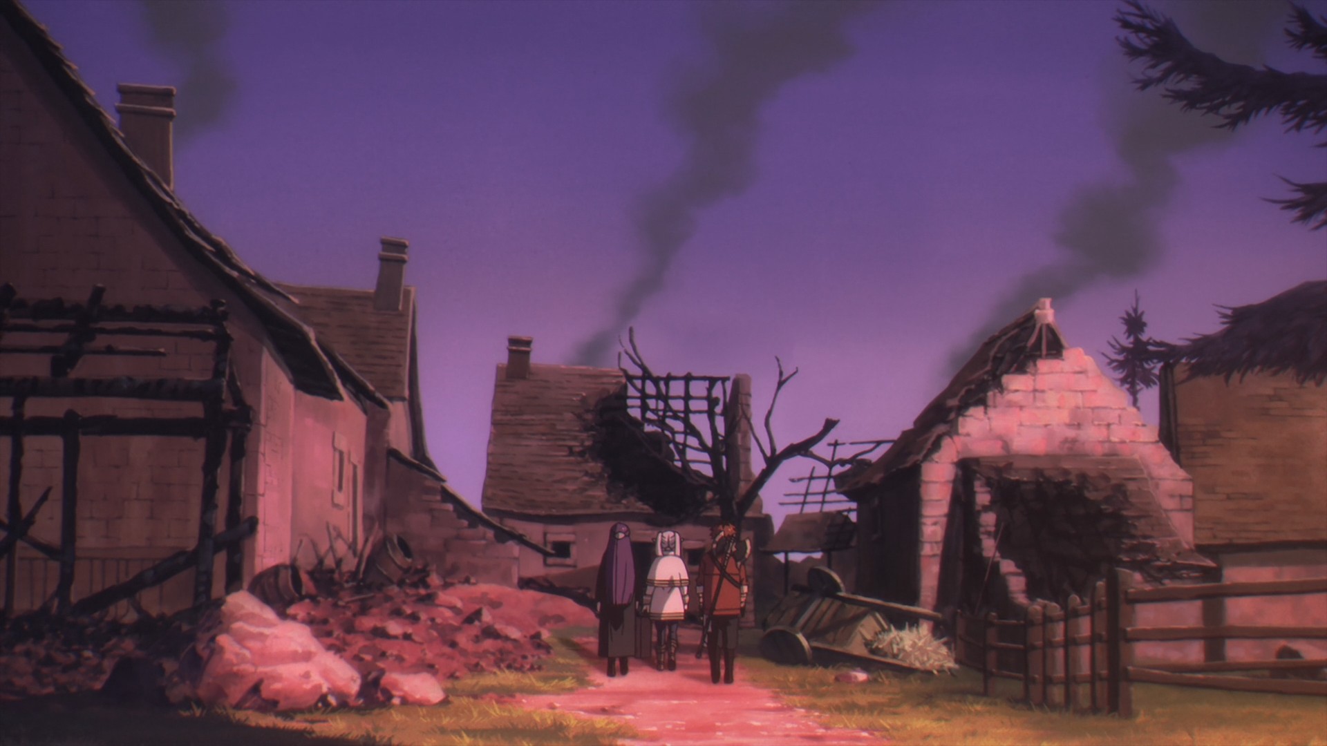 Frieren says she accepted the quest because she didn’t want Himmel’s efforts to go to waste. Do you notice how she always attributes everything to Himmel even though the whole party was there the last time she was on this quest? C’mon, throw Heiter and Eisen a bone or two. Anyway, I don’t suppose there’s a spell for tracking down lost swords, is there? Well, even if it does exist, the owner would probably have to be the one casting the spell. So instead, we get to see our trio play detectives by traveling to and fro, gathering information from the locals. Eventually, the quest takes them to a recently destroyed village, and the story turns dark. They find a hooded woman who claims to be a traveling priestess. She then tells them that a sword demon had destroyed the village. How would she know? She knows, because she is predictably the sword demon.