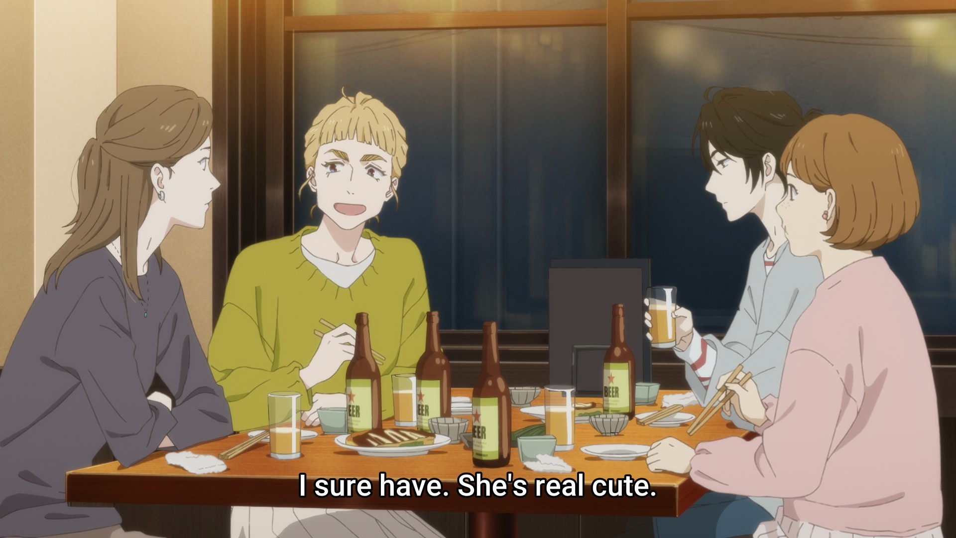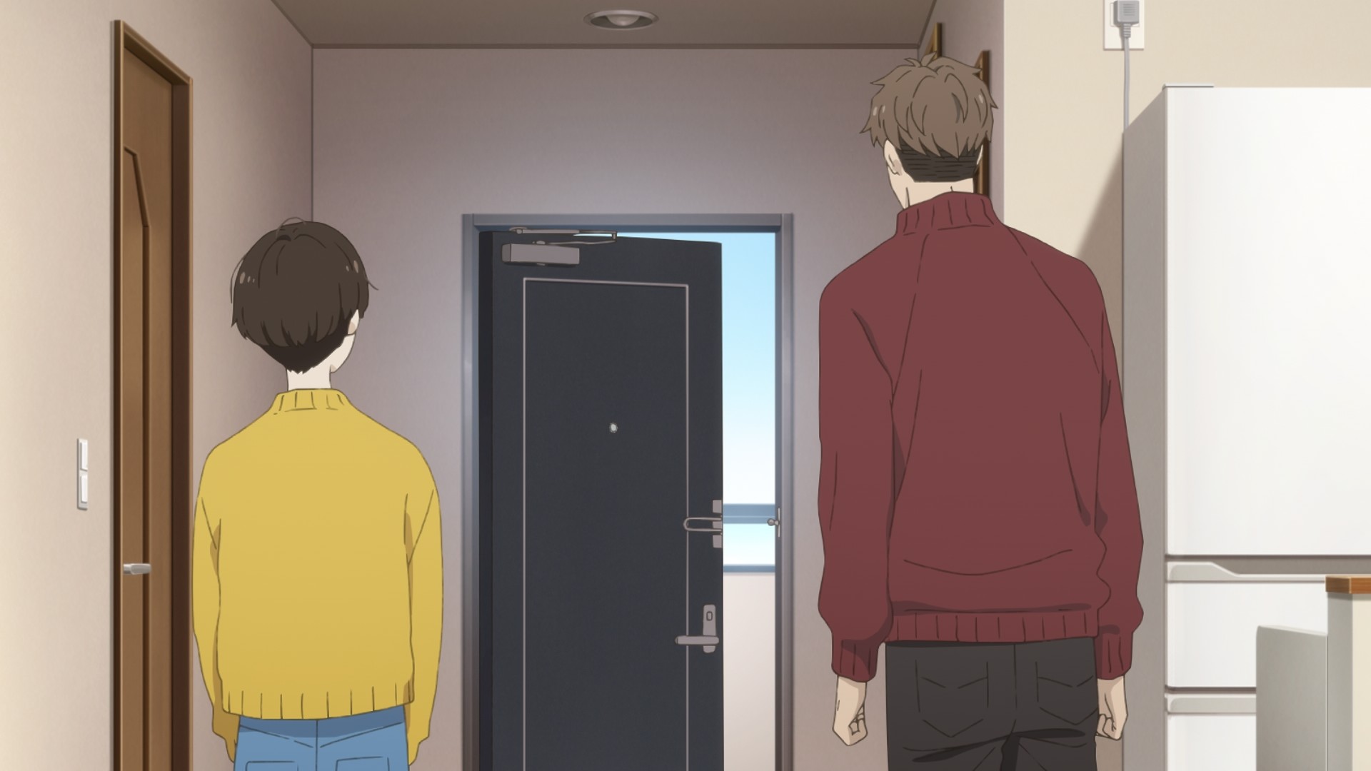 Later, Shingo finally drops by and introduces himself to Asa. And boy is he formal. I get that people still use business cards in Japan, but even with the kids? I dunno, it just feels so stiff. Plus — and I feel like I use this phrase a lot — I honestly can’t remember the last time I’ve seen a business card. Anyway, we learn that Asa can polish off a liter of milk in a single day. Makio bizarrely needs milk with her coffee right now, so she dashes out of the apartment to go buy some. She’s in such a hurry that she leaves her niece with a man the girl just met. I know they used to date and everything — and we shouldn’t treat every man like a predator — but still, it’s careless. This is what I mean about what her actions might entail. Asa might not read it this way, but it just screams, “I need to get out of here. I feel trapped in my own home.”