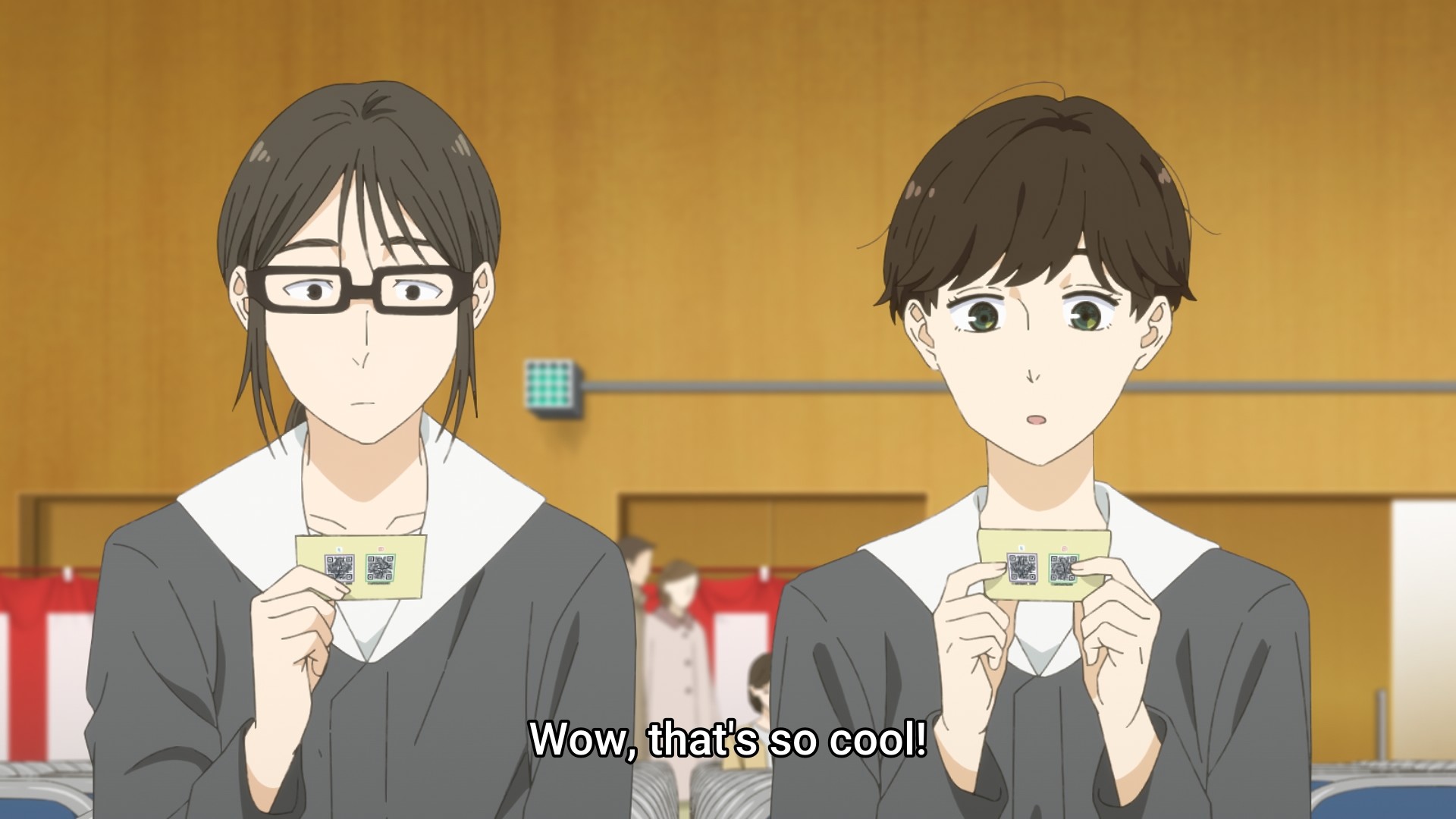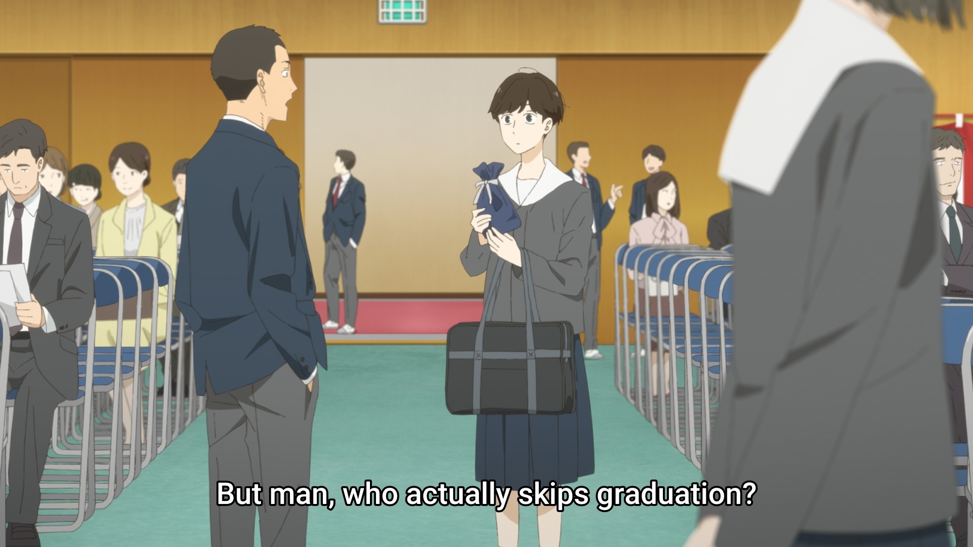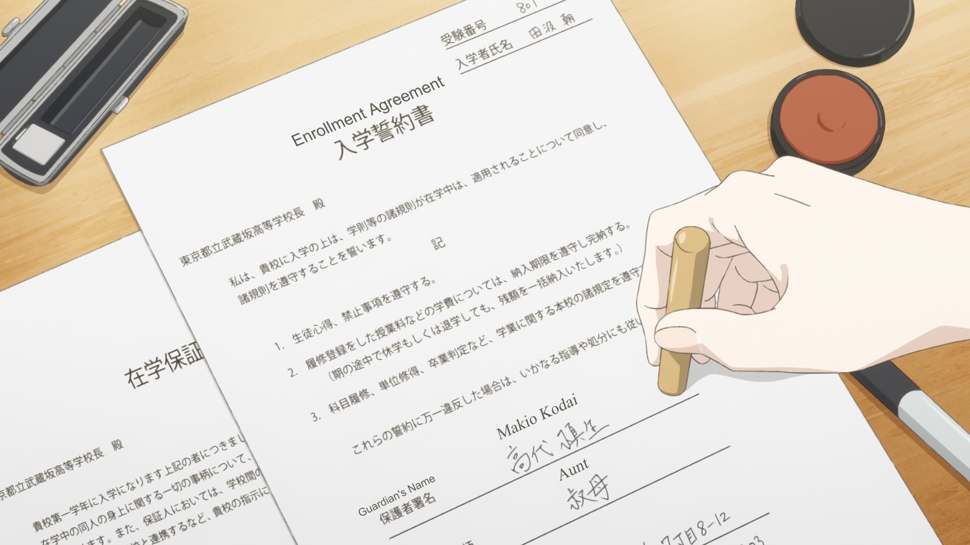 It’s the first day of school, and Emiri is with her mother. Asa didn’t want Makio to come along, though. It feels like she doesn’t want to put even more burden on Makio’s shoulders. Earlier in the episode, Shingo just said that adults can be more sensitive than we think, but I think that applies to everyone. Asa knows Makio suddenly had to upend her life in order to take her in. Asa knows Makio suddenly has a new mouth to feed. Maybe Asa even knows Makio doesn’t feel adequate enough to bcome a foster mom. So this is her way of saying, “Look, you don’t gotta worry about all of that. You’re not my mom, and I’m not your child.” The girl is all smiles right now, but you never really know how she’s holding out on the inside. Maybe her true thoughts are in her journal, but Makio’ll never know if she never reads it. When Makio asked if she should come to the entrance ceremony, she probably wanted to respect Asa’s feelings. But her question might have had an opposite effect; it might have communicated, “Do I really need to do this as well?”