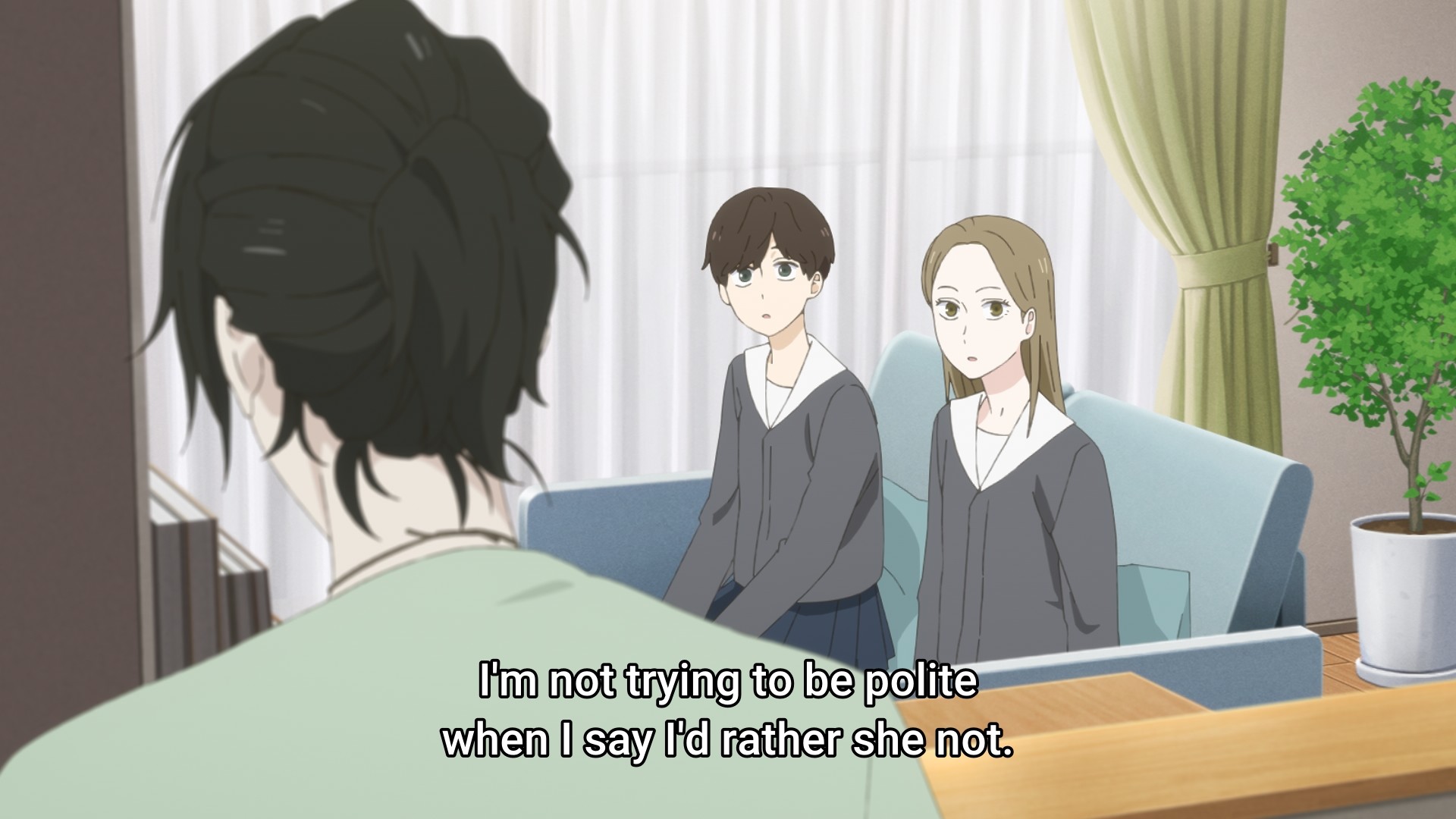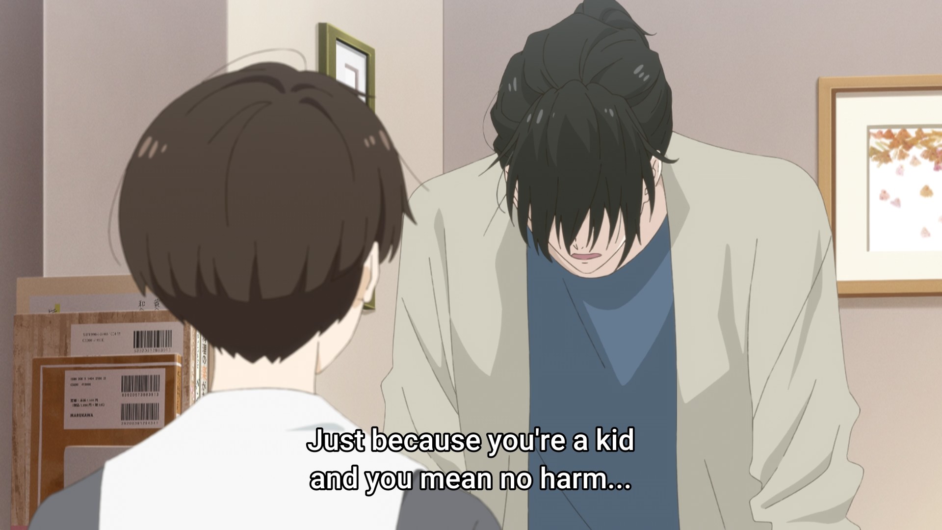 Unfortunately, there’s always going to be this uncomfortable distance between Asa and Makio, because the latter refuses to address the elephant in the room: her estranged relationship with her sister. But you have your sister’s daughter in your home, living with you. You can’t avoid talking about her for the next however many years of cohabitation. But maybe that’s the problem. Maybe the problem is that Makio sees a finish line to not just them sharing a living space, but their relationship altogether. “If I can just reject this topic for the next few years, the kid will eventually leave and I’ll have my desert all to myself again.” Like I’ve said, Makio might try to hide her resentment, but we’re not as good at hiding our true feelings as we think we are. She says she’s not mad that Asa keeps prying, but she sure sounds mad.