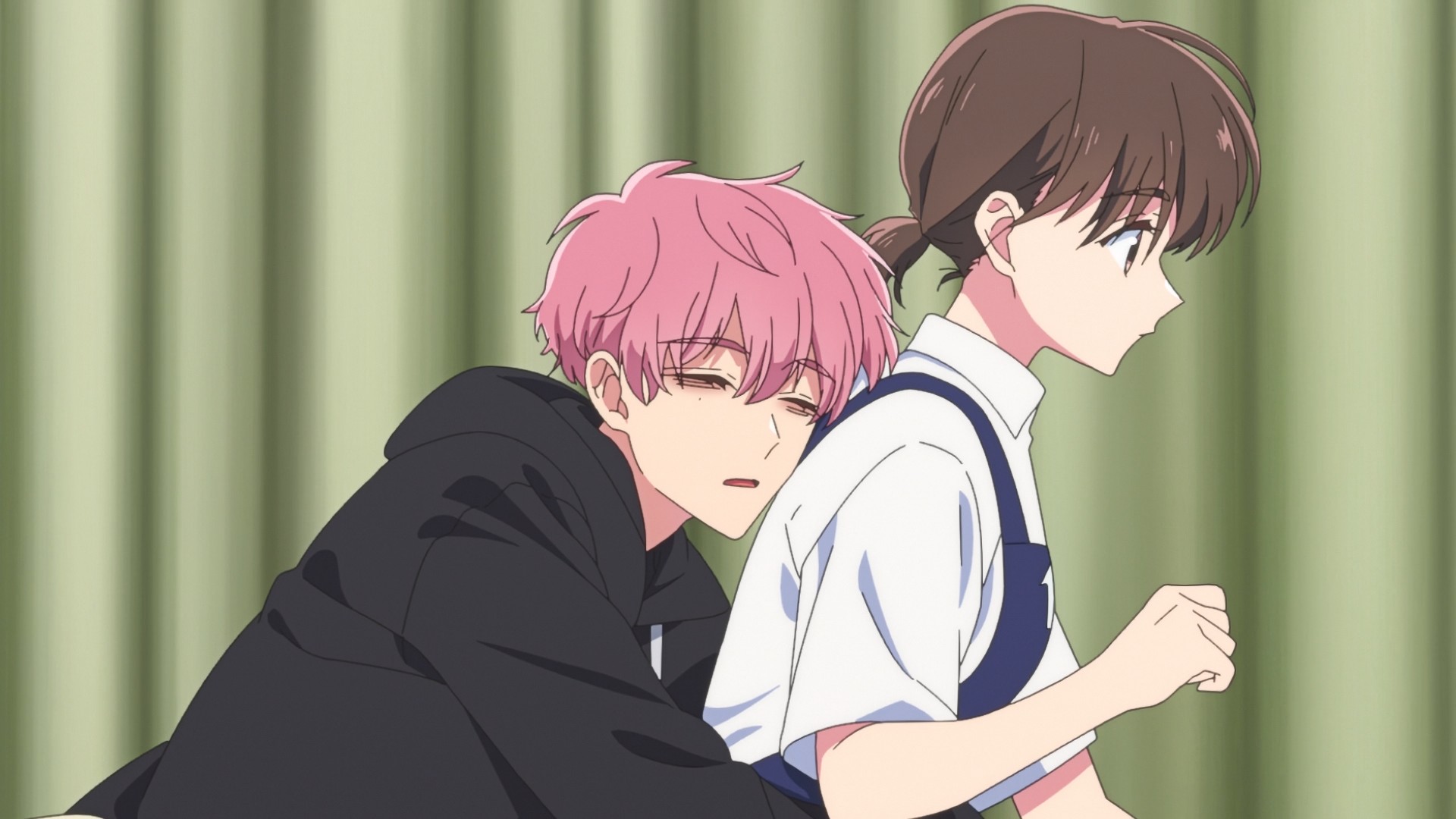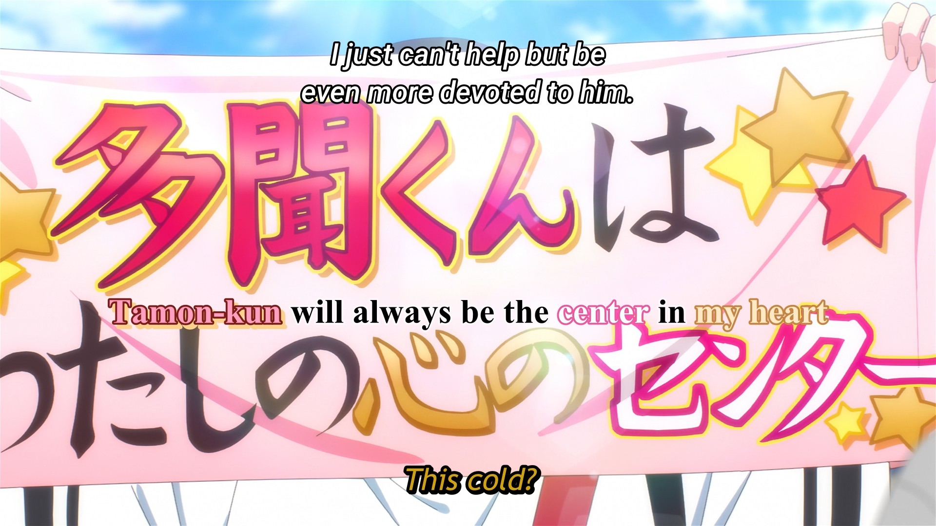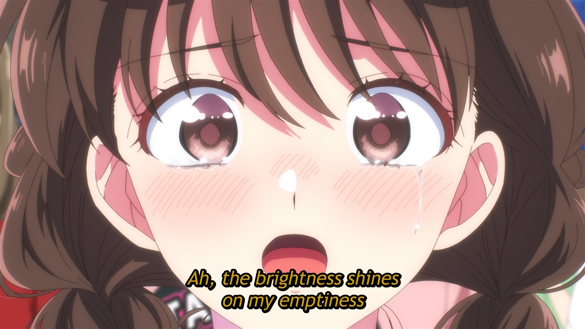 The fifth and final round finally rolls around, aaaaaand it’s a singing competition that we don’t even get to hear. What a cop-out. We just get a montage of the members of F/ACE belting their hearts out while dramatic background music plays. Ultimately, Tamon and Ori didn’t go into the final round at their very best, so some other schmuck wins the center role. Ah, how predictable. Even so, a tearful Utage resolves to continue supporting her oshi, because that’s just what you do. They wouldn’t be your oshi if you just dropped them after a single misstep. Tamon was and probably still is afraid that he might lose Utage. That’s why he unconsciously grabbed onto her earlier, right? In a better show, he would communicate this to her, they would have a heart-to-heart, and perhaps we’d make some real progress towards a palatable romance. And there’s still time to do this, possibly at the start of next week’s episode. But I dunno if this will happen. I don’t have much faith in Tamon’s B-Side. It’s just not very romantic.
