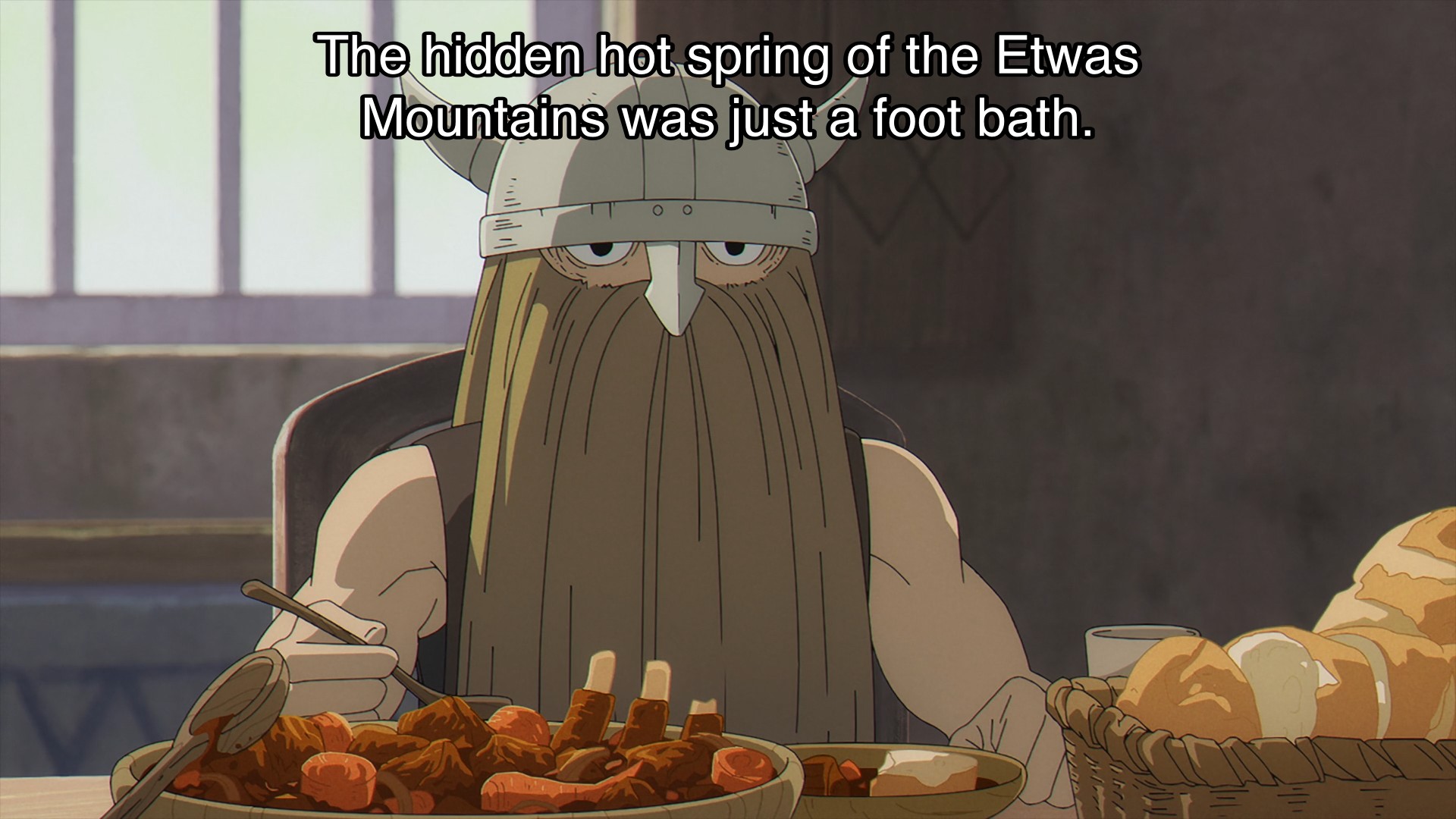 Frieren’s been teasing an onsen since the first episode of the new season, but her sense of time is so different from ours. Her “[it] used to be here” could mean anything. Girl, be specific. Rather than “Where’s the village?” how ’bout we start with “When’s the last time you’ve been to the village?” Ten years ago? Twenty years ago? Well, in this specific case, only “over thirty years ago.” But that still means the village is long gone by human standards. But for some odd reason, Stark remembers hearing a thing or two about the legendary hidden hot spring deep within the mountains, so… all hope is not lost? I dunno, I don’t really care about hot springs. I don’t really care about seeing these characters get naked and jump into one either.