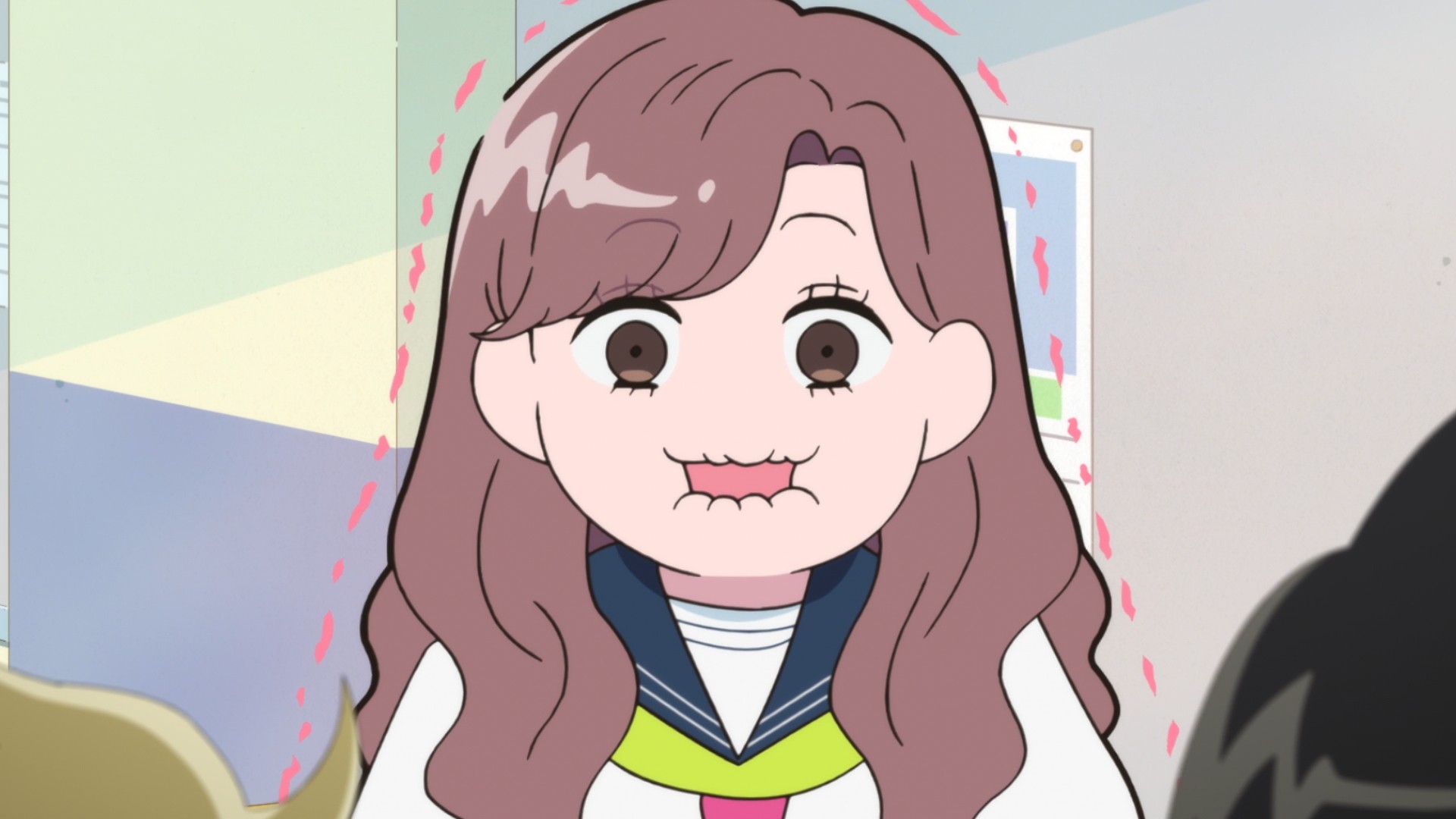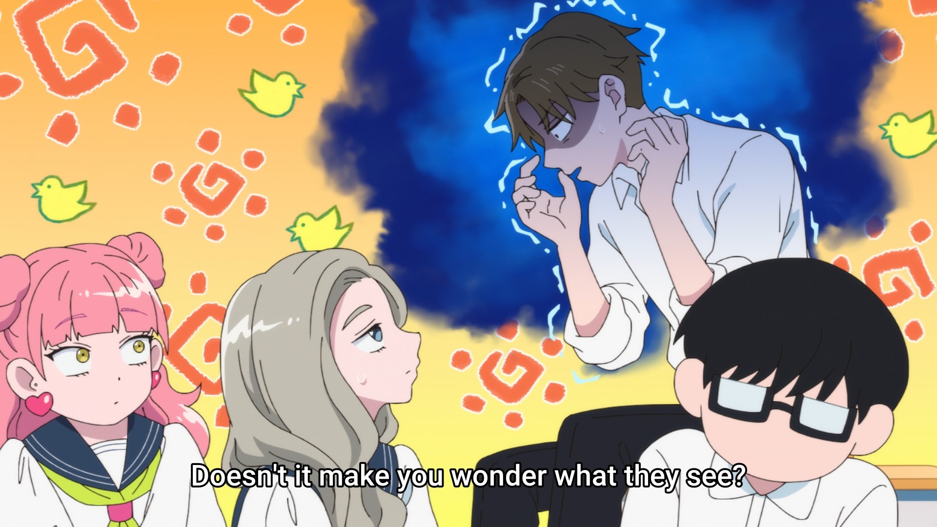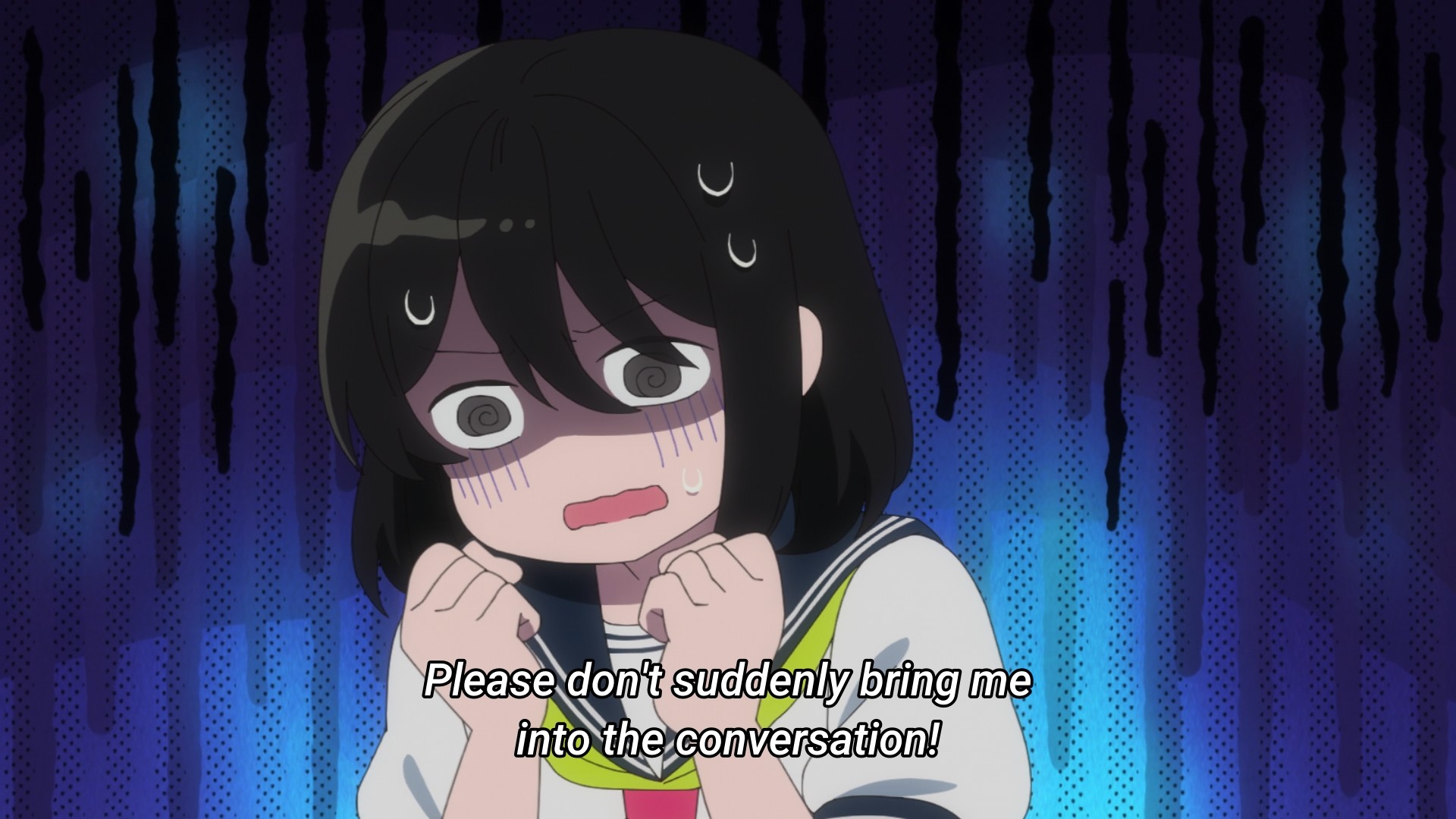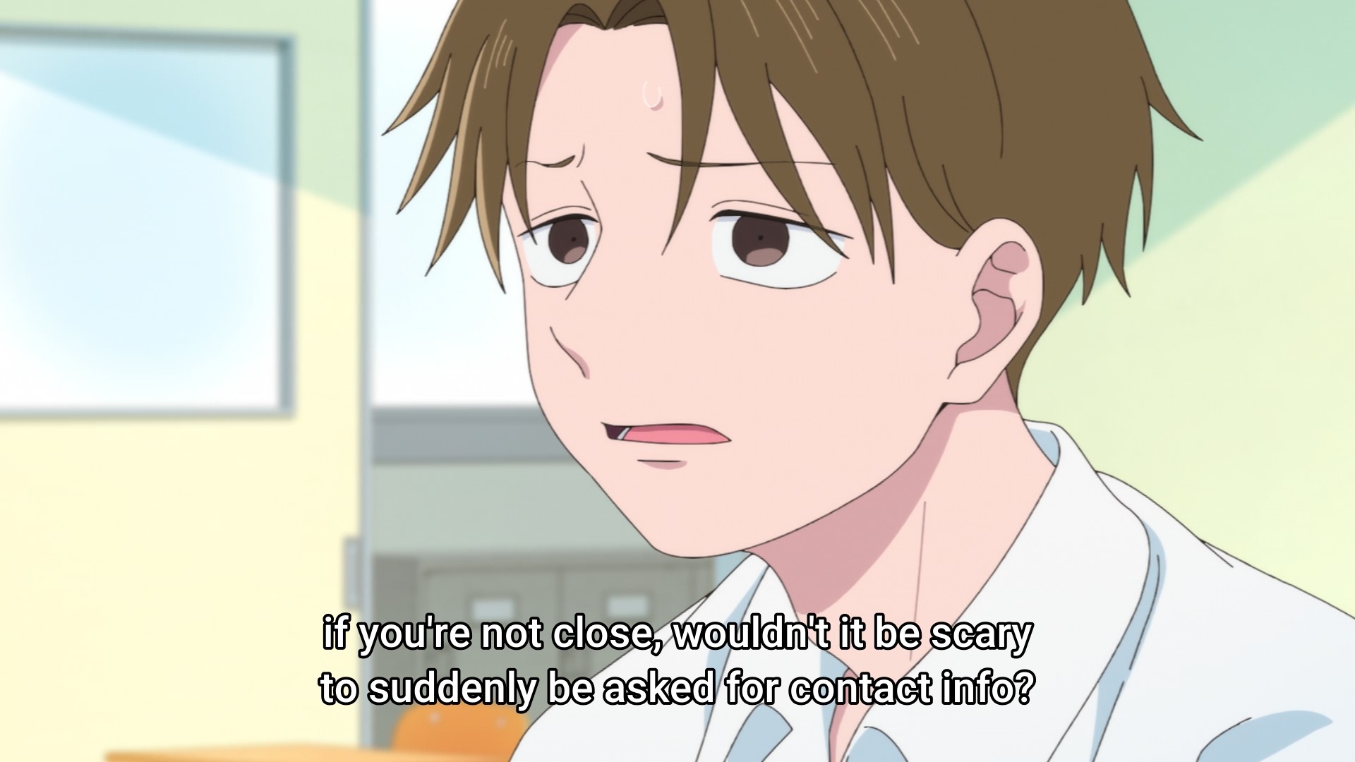 I also really like how this show doesn’t drag things out — most things. Suzuki liked Tani, so she worked up the courage to confess to him in the very first episode. So what happens this week? We find out that Yamada is interested in Nishi. He has spent the last few lunch breaks trying to talk to her, but he hasn’t made much progress. With summer break looming large, he won’t be able to see her in person for a while. As a result, Yamada decides to just go for it: he straight up asks Nishi for her contact info. The episode isn’t even over yet! For anyone who has seen Kaguya: Love Is War, remember how in the first season the main couple lamented wasting their entire summer break not talking to each other? That shit is frustrating. So I have to applaud this show for being full of characters who are more than happy to take action and get what they want outta life. The funniest part is how Nishi has no clue what Yamada’s intentions are. She just sees this as an opportunity to practice making conversations without all the oh-so-intimidating elements like eye contact.