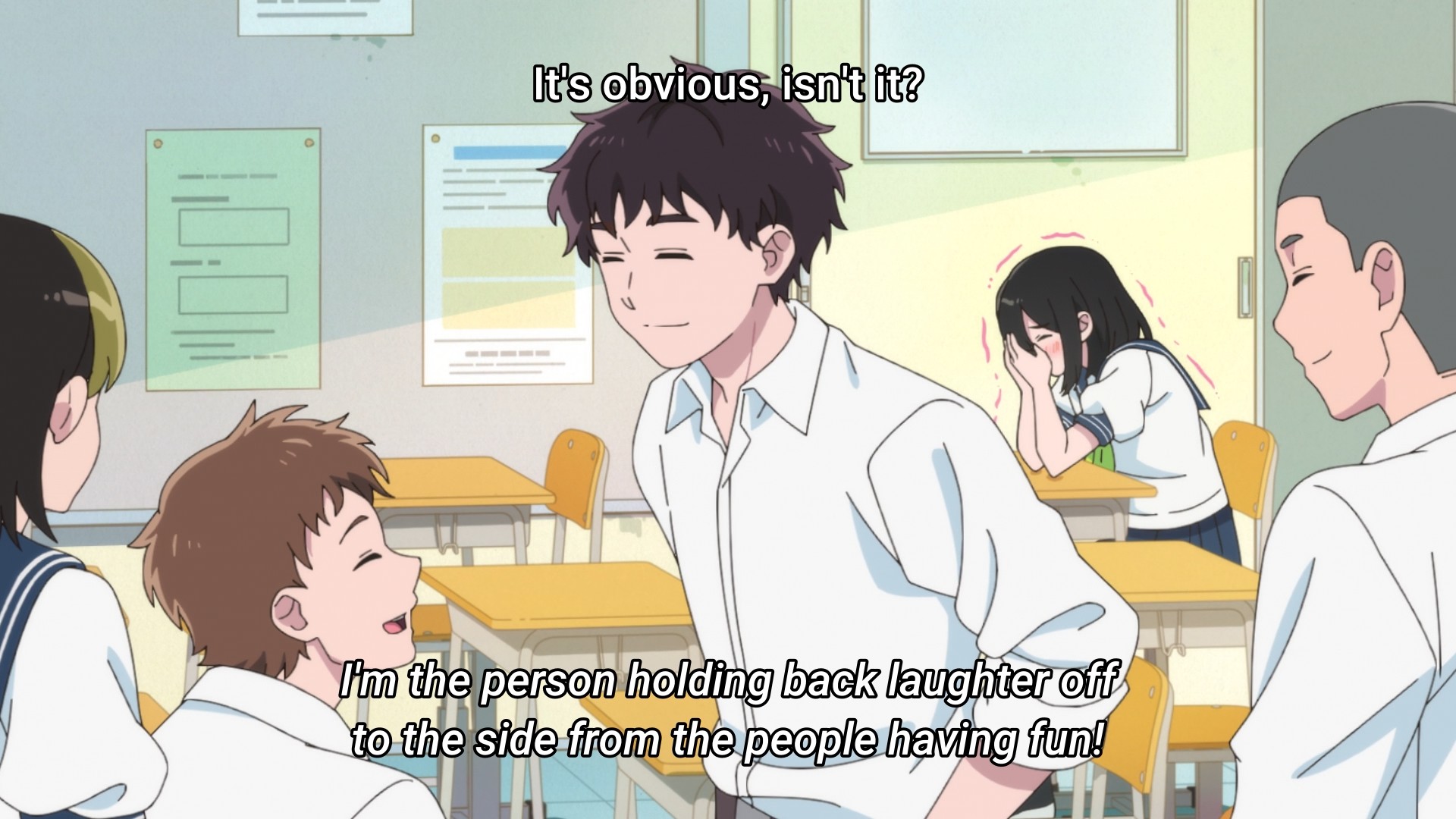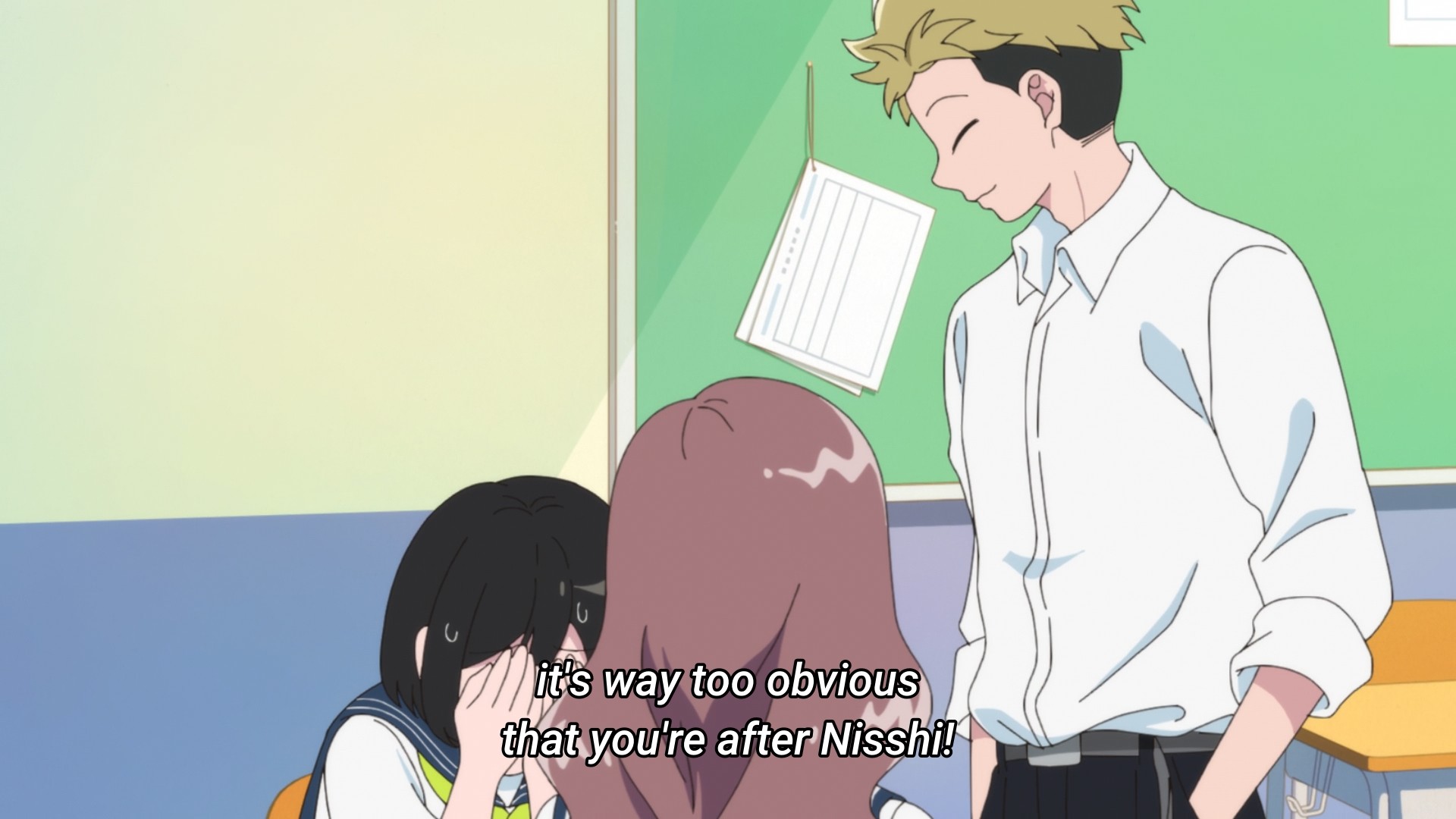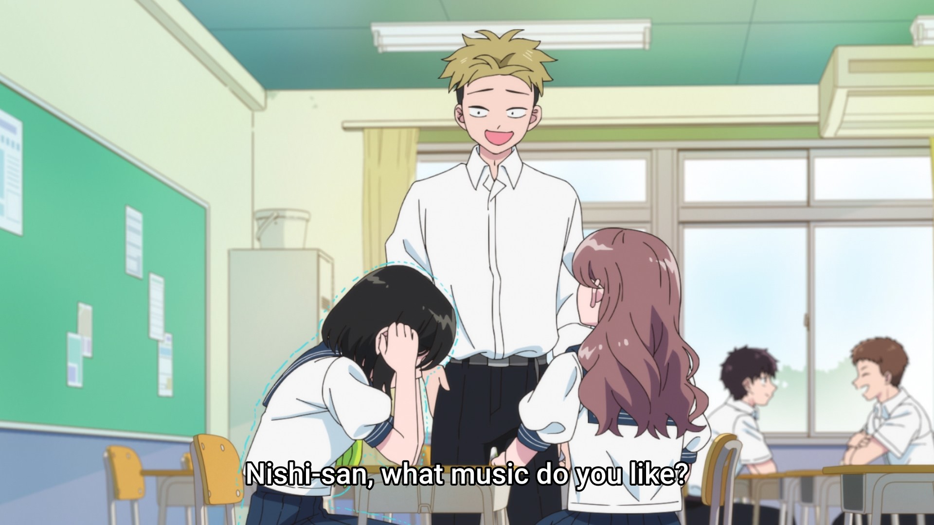 We finally get a proper introduction to Nishi, and she’s personally pretty relatable. It’s not that you ever want to eavesdrop on the conversations around you, but we have ears. Even when you try to distract yourself, you can’t hear but hear things with those same ears. Luckily, her chatty classmates don’t seem to mind. They even try to loop her in, but she just can’t keep up with their tempo. In any other show, there would probably be a side plot where Nishi gets bullied by the popular kids, thereby forcing one of Suzuki’s friends to step in and save her, blah blah blah… then bam, romance. I’m just glad this isn’t that type of show. I’m not trying to deny that bullying exists, but from a storytelling perspective, I’m just so tired of it.