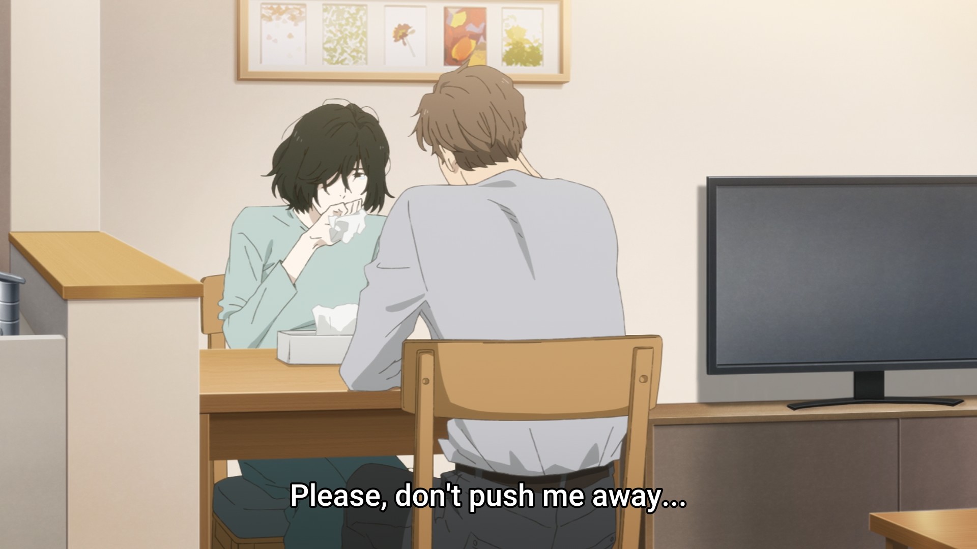Speaking of Asa, she and Makio get into another domestic dispute again. In just half a day, Makio manages to turn a clean apartment back into a pigsty, so I totally get Asa’s frustrations. I’d be annoyed, too. I don’t understand how anyone can stand living like this. Unfortunately, a bit of her mother comes out when Asa scolds Makio, which inadvertently dredges up plenty of unpleasant feelings. It’s tricky. On the one hand, when you agree to live with someone, you have to compromise a little. Even if we accept her excuse that her mind is constantly busy, Makio’s complete inability to pick up after herself is a bit ridiculous. A montage of various people lightly scolding her makes it seem like the woman has trouble coping with any sort of structure or expectation. If it’s that bad, then maybe she needs to seek help for it. If she’s this troubled now, it’s only going to get worse as her mental faculties slow down with age. Hey, it happens to everyone. At the same time, however, Makio didn’t have to take Asa in. She didn’t have to provide a roof over her niece’s head. It does feel a little ungrateful to yell at your aunt. Makio’s bad habits aren’t going to change overnight (assuming they can change at all). Asa could stand to be a bit more patient.