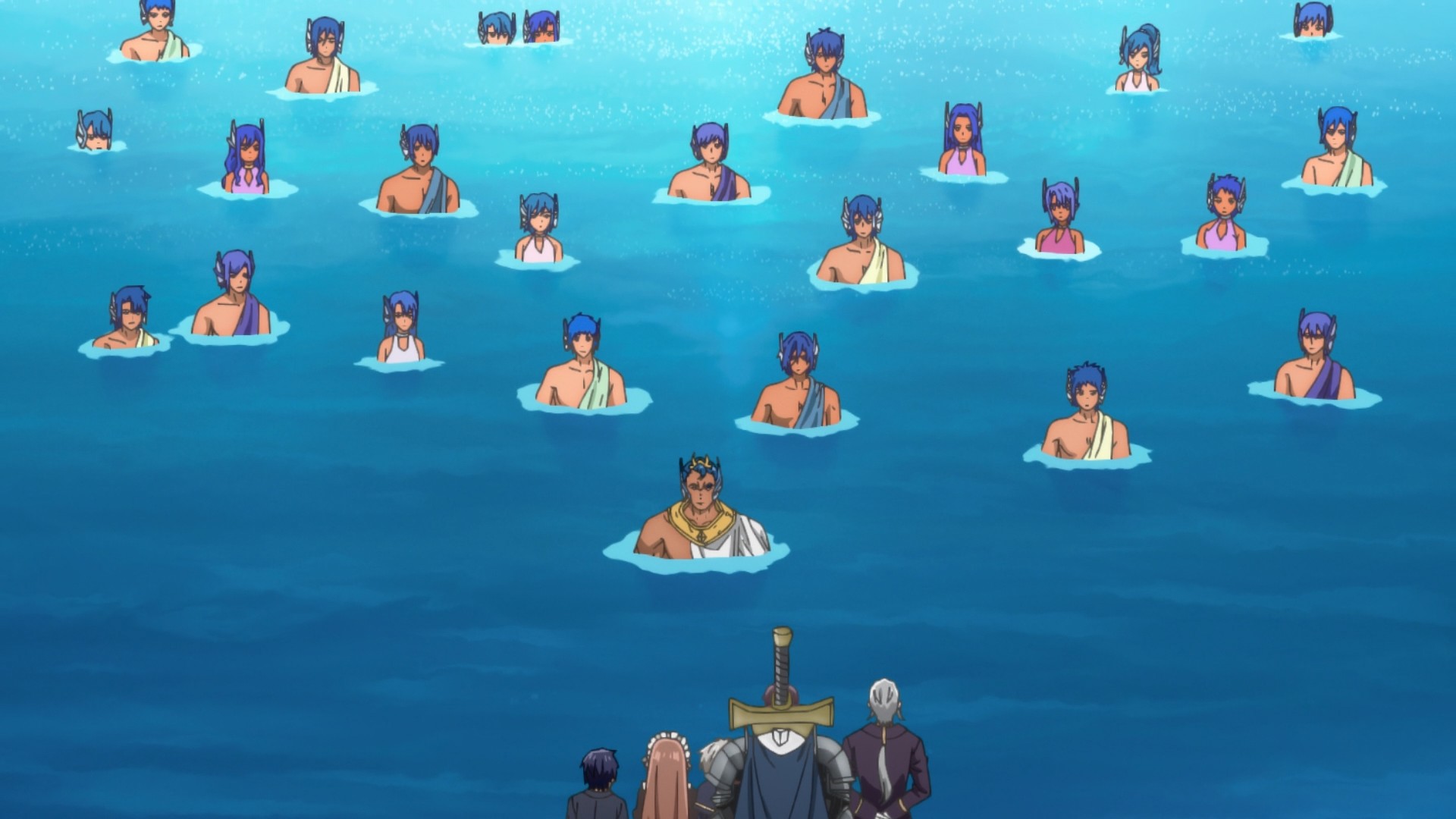 An entire species of merpeople saw Van’s manmade lake and decided to move right in.. Not only that, they want to marry off their chieftain’s daughter to (of course) Van. Yep, not content with just one child bride, our little lordling with the soul of an ojisan now has two little girls fighting over him. Pathetic.