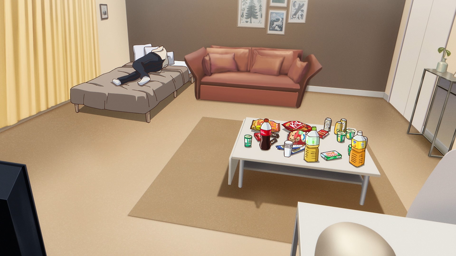 By the way, why would you even serve ramen at a party? And if you’re going to do it, why would you leave it sitting on the table like this? The noodles are just gonna get soggy. Plus, are guests expected to come up and grab an entire bowl for themselves? But there are only four bowls. Only four lucky guests get to have ramen? C’mon, get it together, vampy boys! At this rate, the puppies are gonna steal your woman — the only woman who seems to exist in this universe!