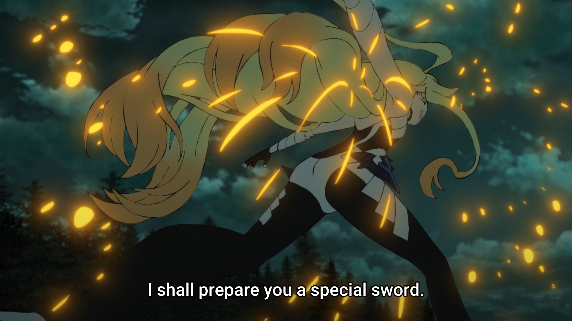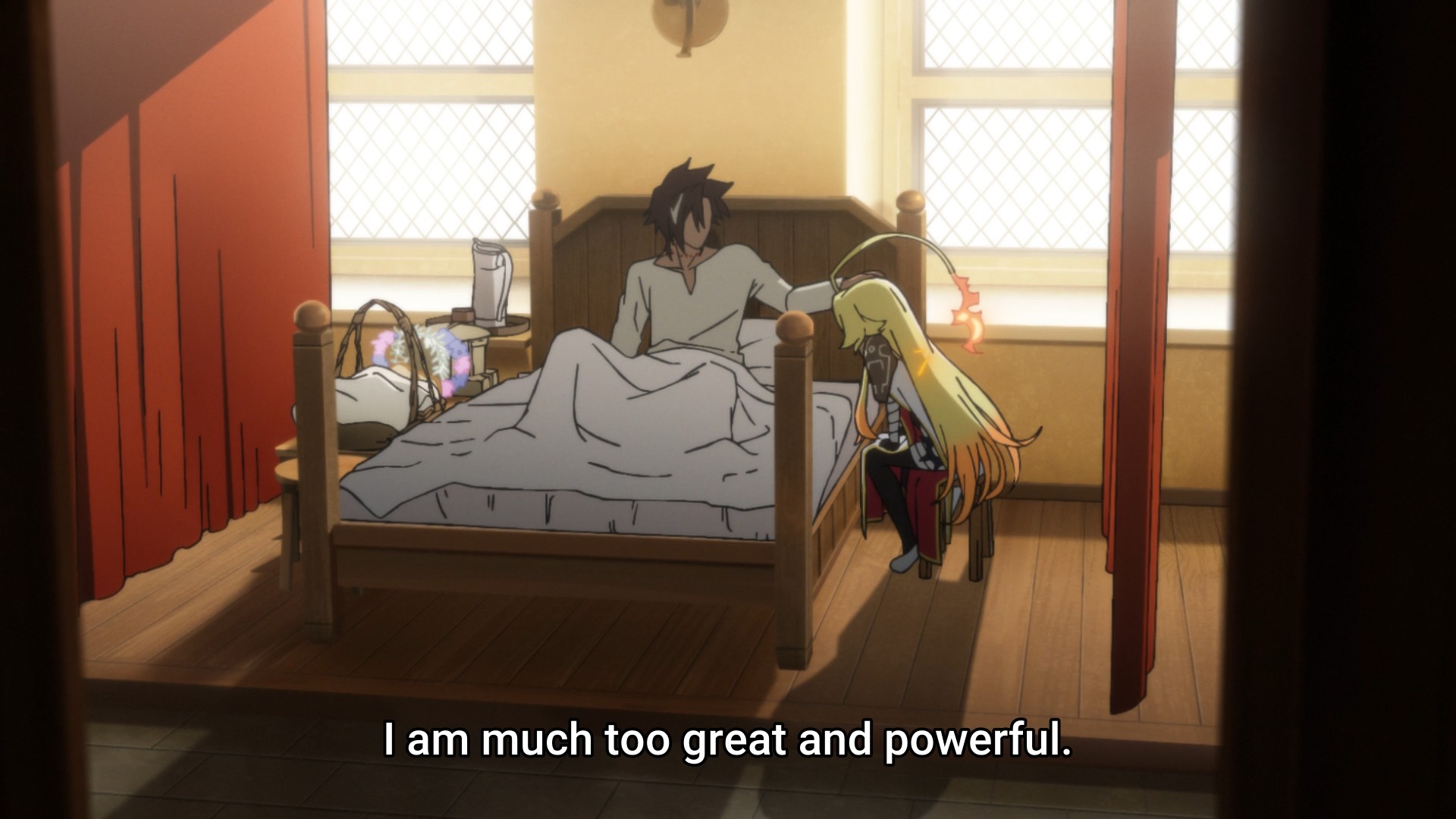 Yeah, yeah, a surprise attack severely injures Xylo, so there’s some drama. But naturally, it was not enough to take him out. So fueled by the same do-gooder juice as every other anime protagonist — the do-gooder juice known simply as ‘determination’ — our hero keeps on keeping on. Luckily, he even has the time to reflect on his nature as a do-gooder. He has time to bitterly admit that he still wants the praise, he still wants the recognition, etc. — that deep down, he’s no different from the goddesses he lambasts. Cool, so sweet of the Demon Lord to pause its attacks long enough for such heroic epiphanies. It only starts attacking again when Teoritta whips her cloak off and starts summoning the most special of swords — a holy sword that can kill anything! Except… it looks kinda dinky, doesn’t it? Oh well, it’s not the size that matters, but what you do with it! As a result, with some last second assistance from Dotta, Xylo deals the decisive blow that ends the nightmare, which, again, was never in doubt. But I do find it a bit… anticlimactic that all of the VIPs remained relatively unscathed. Maybe we’ll find out in next week’s episode that someone died, but I doubt it.