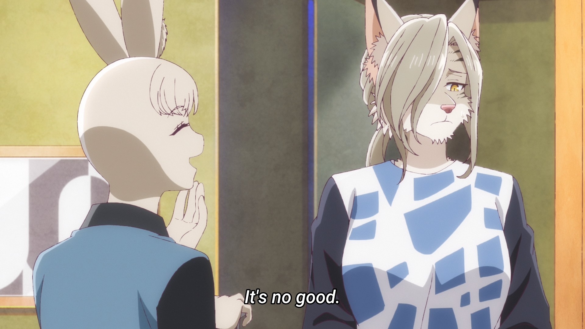 A good chunk of this episode is devoted to Jiraishi trying to find clothes that would go well with her fur pattern. She actually says at one point that she can’t trust the advice of a beast person with plain fur. That’s raci–…