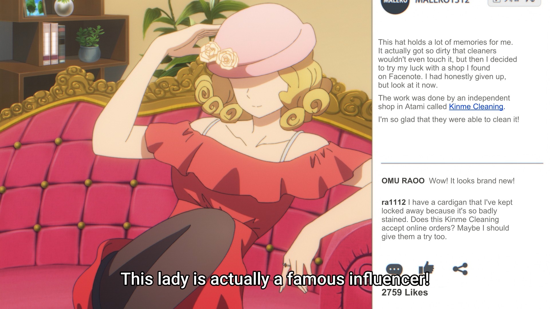 Even though Wakana and her cleaning service haven’t exactly gone viral, she’s already gotten work from a supposedly famous influencer. I just think it’s weird that the influencer immediately sends Wakana an item to clean. Usually, you would message the business, discuss details, figure out payment details, yadda yadda yadda, then send the item. But not this time! Here’s my soiled hat! Clean it!