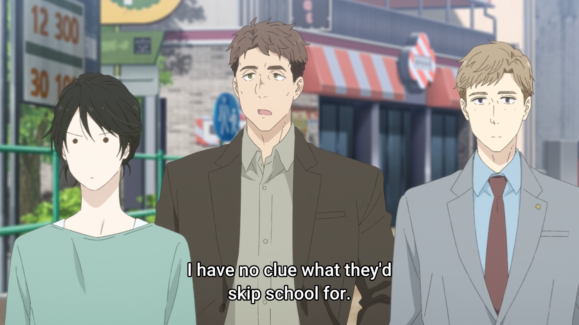 — As I watch this situation unfold, it just confirms to me that I’m not fit to be a parent. I don’t think I’d have the patience for this. Makio’s first instinct is to scold Asa, and Shingo immediately tries to talk her down without adding fuel to the fire. He wants her to keep her cool. Last thing you want to do is to drive the runaway girl even further away. The lawyer guy ends up sounding the most reasonable out of the bunch: “It’s not rare for children to test the adults around them. So I think it’ll be good to show her that this many adults are concerned for her.” Again, it sounds good. It sounds healthy. But he doesn’t have to actually raise her. When this is all said and done, he can go back to being the distant observer. It’s easy to sound wise when you have no skin in the game, so to speak. Well… I’m back to waffling between two sides, aren’t I? In my opinion, it’s easier to just not be a parent, and I think this is a decision that many people in my generation have come to accept. Not only is being a parent increasingly unaffordable, a lot of us have had to come to terms that, yes, our parents may have tried their best, but oftentimes, their best wasn’t enough. And similarly, we probably can’t do much better. But that’s another discussion for another day…