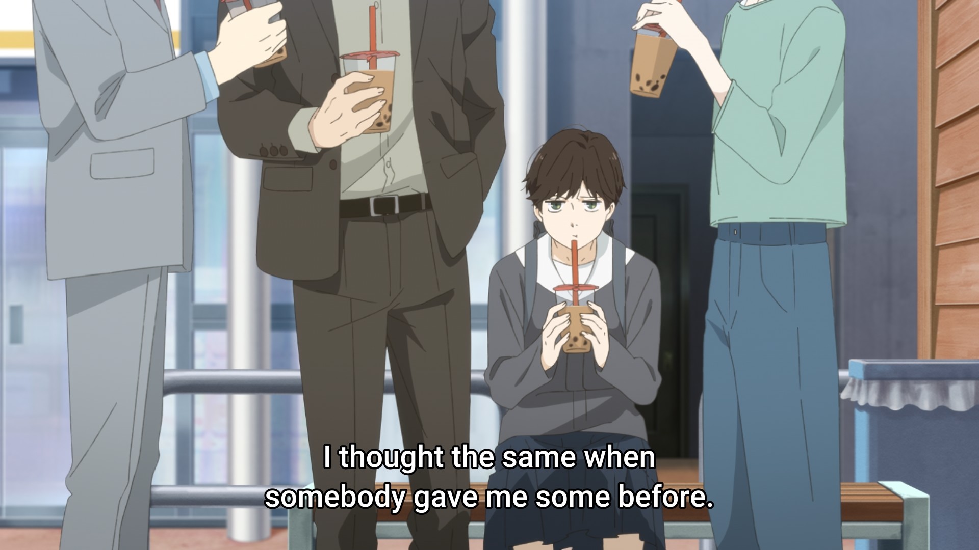 With help from Shingo and that lawyer guy, Makio eventually finds Asa drinking boba on a bench. Afterwards, when Asa sees the two men say their goodbyes to Makio, she bitterly remarks, “You sure have it nice, Makio-chan. You’ve got all these people who care about you.” She adds later, “…I know I don’t come first.” She doesn’t accept that they dropped everything in their day to find her. No, she’s convinced that they dropped everything in their day to help Makio. This was the moment that clicked for me; everything fell into place. Earlier in the episode, Asa was pissed that all of her friends have something positive going on with them, but she has nothing. So screw them, she thought. Yeah, life can be really unfair, but why lash out at your friends? They’re just trying to live their life. What did they ever do to you? Nothing. But that’s precisely the problem.