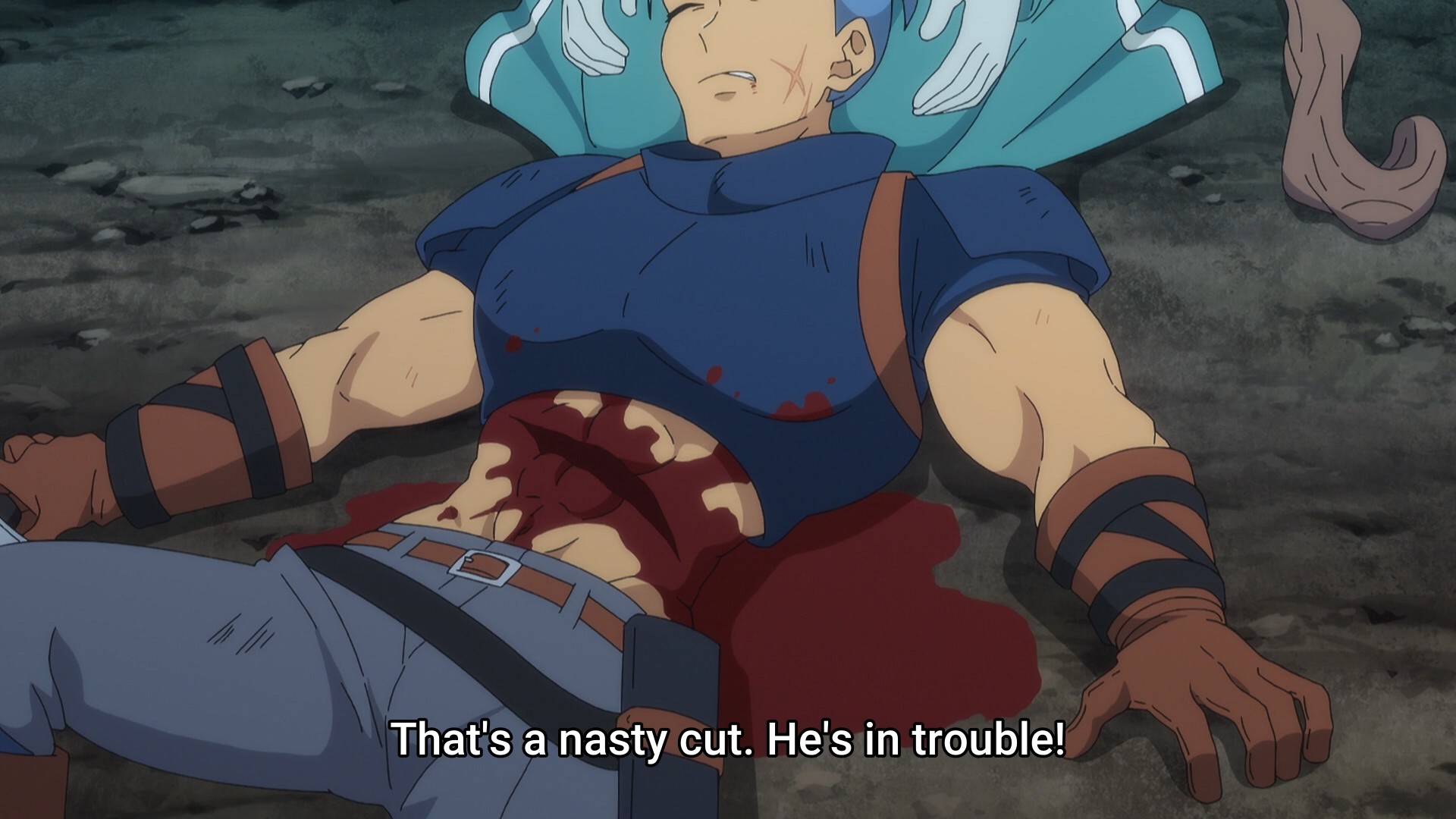 There’s a distinct pattern in this show. Thanks to Flum’s insane regenerative powers, she always has to eat shit every episode, then she gets back up and gets her revenge. Rinse and repeat for every encounter. This week, Dein taps into his cartoonishly evil side. By threatening the life of a blind, amnesiac orphan, he convinces Flum to chug a bottle of potent poison. So of course, she does so and proceeds to writhe in pain as the evil men evilly chuckle from an evil distance. Once the intended audience is enraged, Flum leaves her enemy in complete shock by getting back up on her feet. Finally, blood and guts start flying as Flum lets her cursed sword rip and tear human flesh. It’s not quite at the level of I Spit on Your Grave, but it does feel a lil’ exploitative.