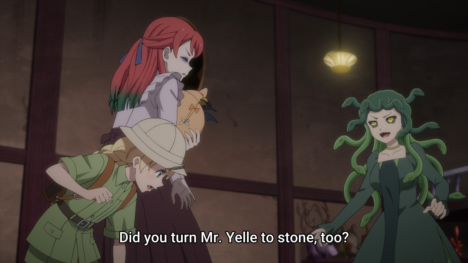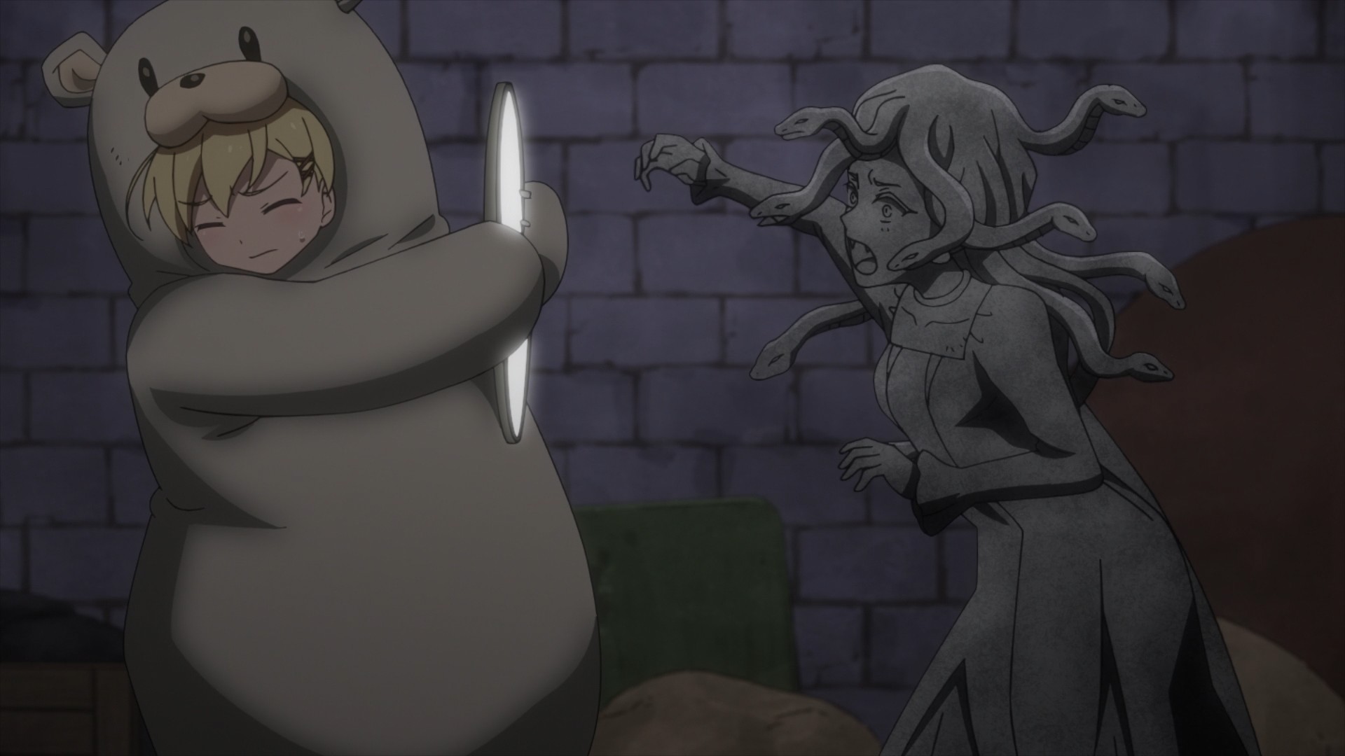 In my opinion, the supernatural angle ruins these mysteries. When you first find out that the missing men had been turned into statues, you start thinking, Ooh, how did some sick twisted individual turn them into statues? Well, it turns out that the culprit is a literal ass Medusa. Lynn even beats her by pulling an uno reverso on the Gorgon: she tricks Medusa into looking a mirror, thereby forcing the monster to turn herself into stone. This presumably turns everyone else back to life (the dead stay dead because they’re beheaded), because Medusa is ultimately defeated. But then wouldn’t her own stone body turn back to normal because she is also–… ah, whatever. Look, I don’t think Medusa is supposed to be able to turn herself into stone, because she would’ve inadvertently doomed herself a long time ago. There are reflections everywhere in life. It’s raining and there’s a puddle outside? Whoops, you’re stoned! Look into a storefront but you see your own reflection in the glass instead? Whoops, you’re stoned! Plus, in the original myth, she was defeated because Perseus could safely see her reflection off of his mirror shield. Ah well, I don’t expect an anime to be accurate to the original Greek myths. The original point is, an actual monster instead of a human monster is just less intriguing to me.