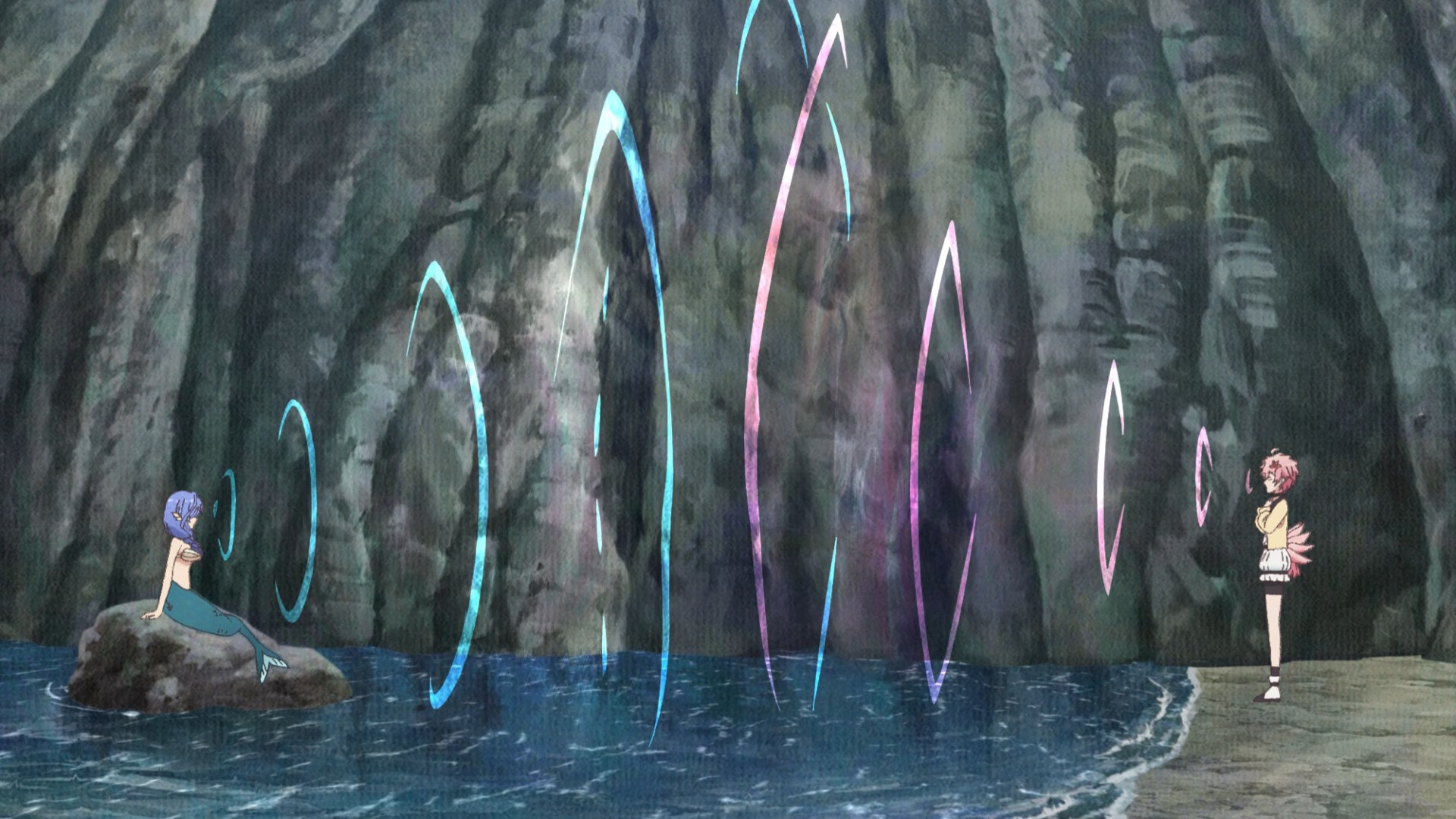 Yoki, Happiness, and Raven investigate a case where cargo has been going missing at a port city. The sailors pin the blame on a mermaid, which Raven readily believes. After all, why trust a demon? First, I don’t think of mermaids as demons. Second, if you’re going to lump them in with demonkind, shouldn’t you also say the same about Happiness, his crush? She’s a harpy, but what makes that different from a half-woman, half-fish thing…? Ah, I don’t get it. Wait, he knows Happiness isn’t human, right? Anyway, the sailors are the true culprit. They have been forcing the mermaid to work for them, because they have her friend (also a mermaid) in their captivity.
