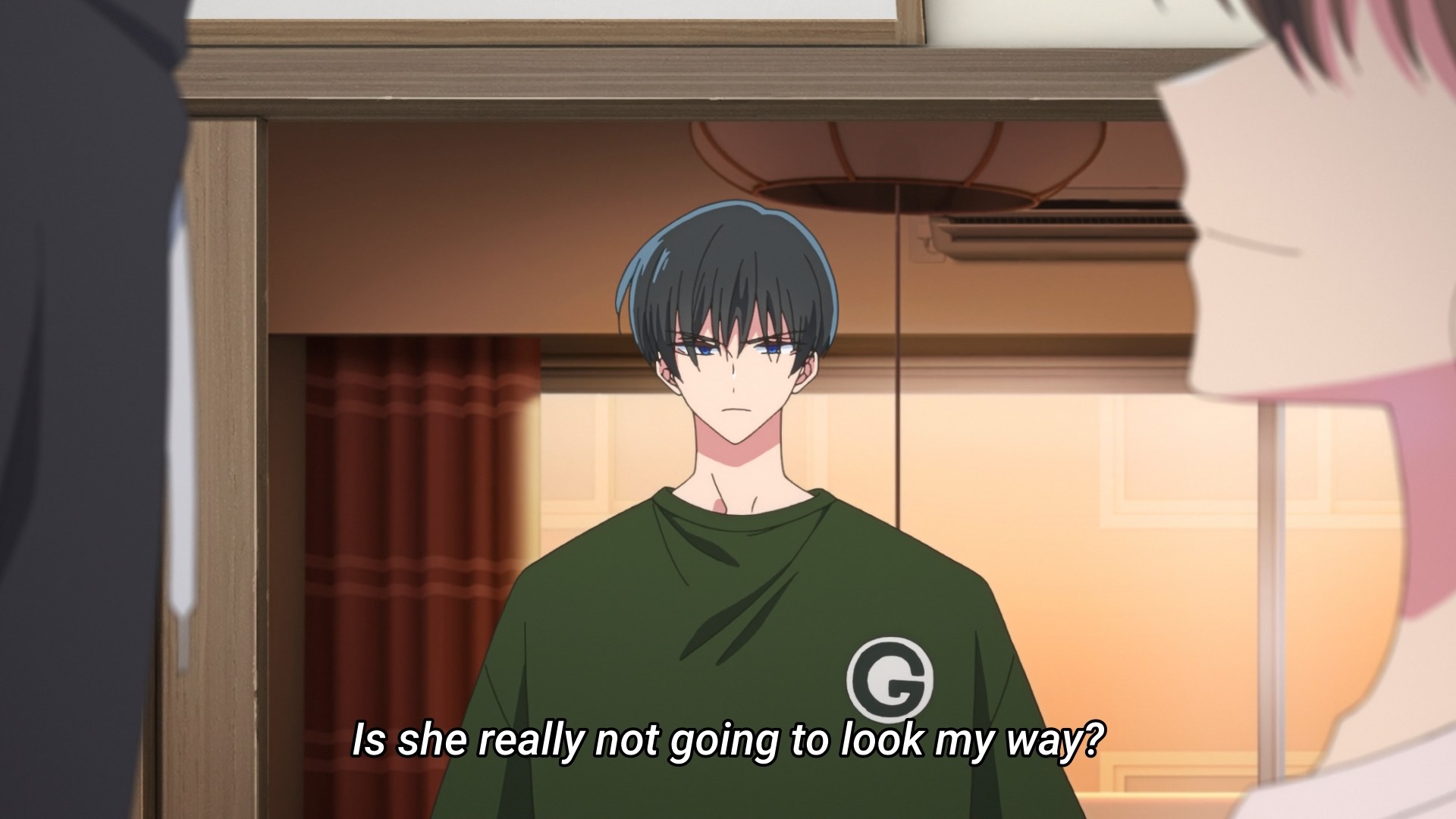 — Same schtick every episode. Gloomyhara bashes himself, then Utage “scolds” him by praising Hottiehara. But the reason why her praise never sticks is because they’re talking past each other. He’s insulting his actual self, she’s praising the fake persona he has created strictly for entertainment. We’re nine episodes in, and we’re still trapped in this conundrum. He actually has to spell it out to her that he wants Gloomyhara to be important to her as well.