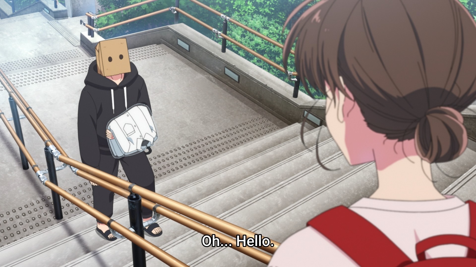 — Same schtick every episode. Gloomyhara bashes himself, then Utage “scolds” him by praising Hottiehara. But the reason why her praise never sticks is because they’re talking past each other. He’s insulting his actual self, she’s praising the fake persona he has created strictly for entertainment. We’re nine episodes in, and we’re still trapped in this conundrum. He actually has to spell it out to her that he wants Gloomyhara to be important to her as well.