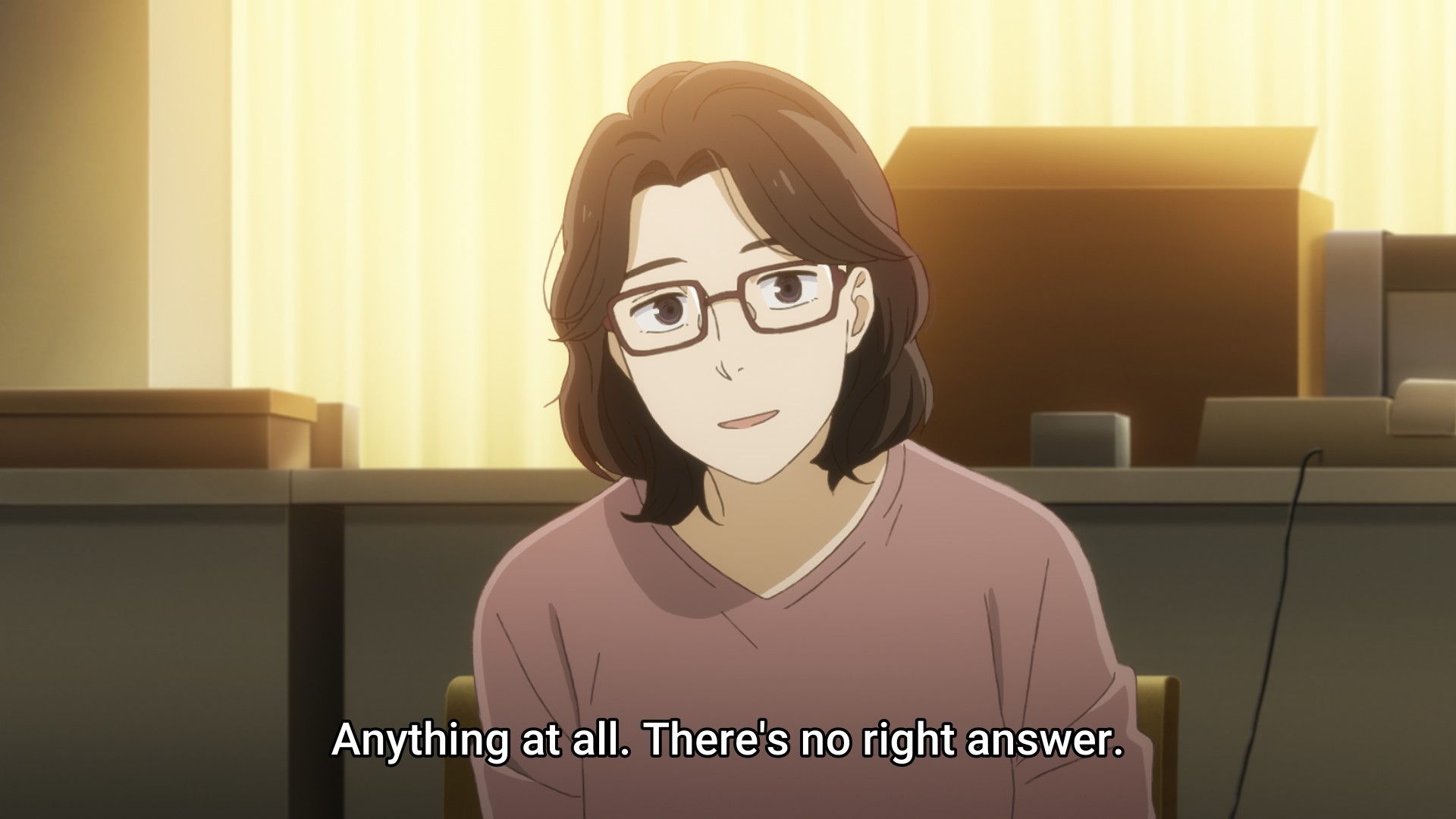 Asa seems to take umbrage when the counselor tells her that they can talk about anything that is on her mind. They usually do this to help break the ice, to find some insight on your personality or how you’re feeling at the moment, to build a rapport, to establish a safe space where the child feels as they can talk about anything, etc. It’s the standard playbook. But instead, Asa sees the exercise as a burden; she thinks the counselor is putting all of the work on her shoulders: “Is that something I’m supposed to come up with.” With Emiri, Asa echoes a similar thought when talking about their future careers: “I wish someone would just choose for me.” Maybe this is all a symptom of her missing her mother’s overbearing, controlling personality. You can see this leaking out in other ways. When Shingo comes bearing groceries, Asa sees this act of love as “spoiling” Makio. She even adds, “I think it’d be better for her if you were more strict.” The child is practically begging to be scolded. Makio and the counselor both want Asa to express herself freely. Just pick a direction and go. But how can you do that when you feel lost and isolated? What direction? That’s the crux of the problem. Asa wants (her mother’s) harsh guidance; she wants to be told what to do and where to go. But it was this same sort of guidance that made Makio estrange herself from her sister, so she almost seems like the last person on earth for Asa to lean on if she desires strictness.