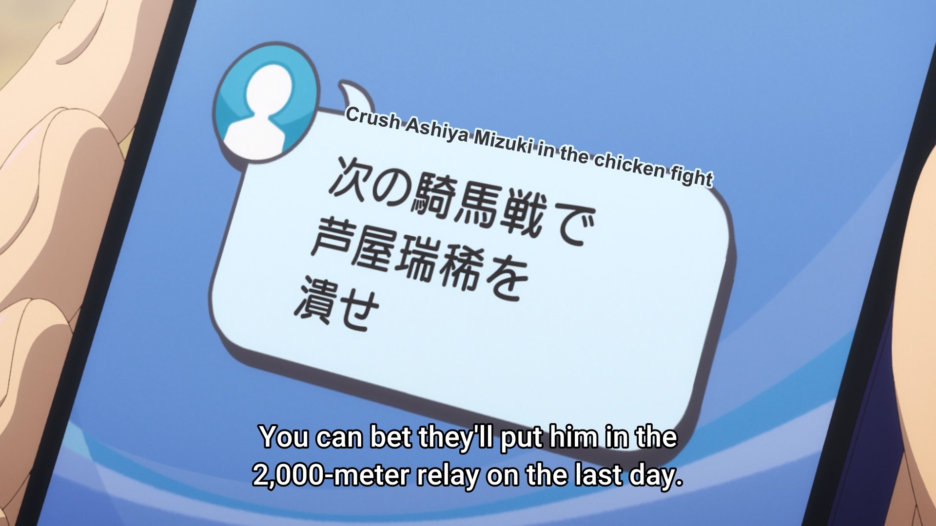 The best part is how Sano doesn’t want Mizuki to enter the “chicken fight” because he knows something about it that is detrimental (probably because the other dorm plays dirty). But does he explain that something to her and the audience? Fuck no. Communicate? Are you insane?