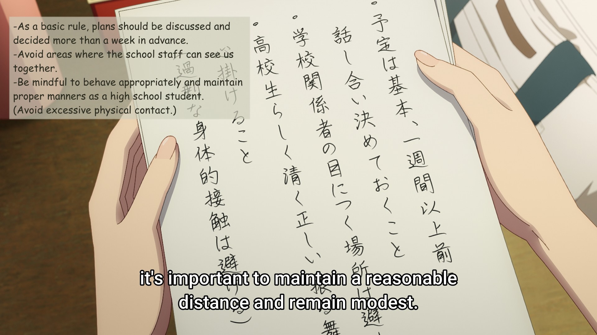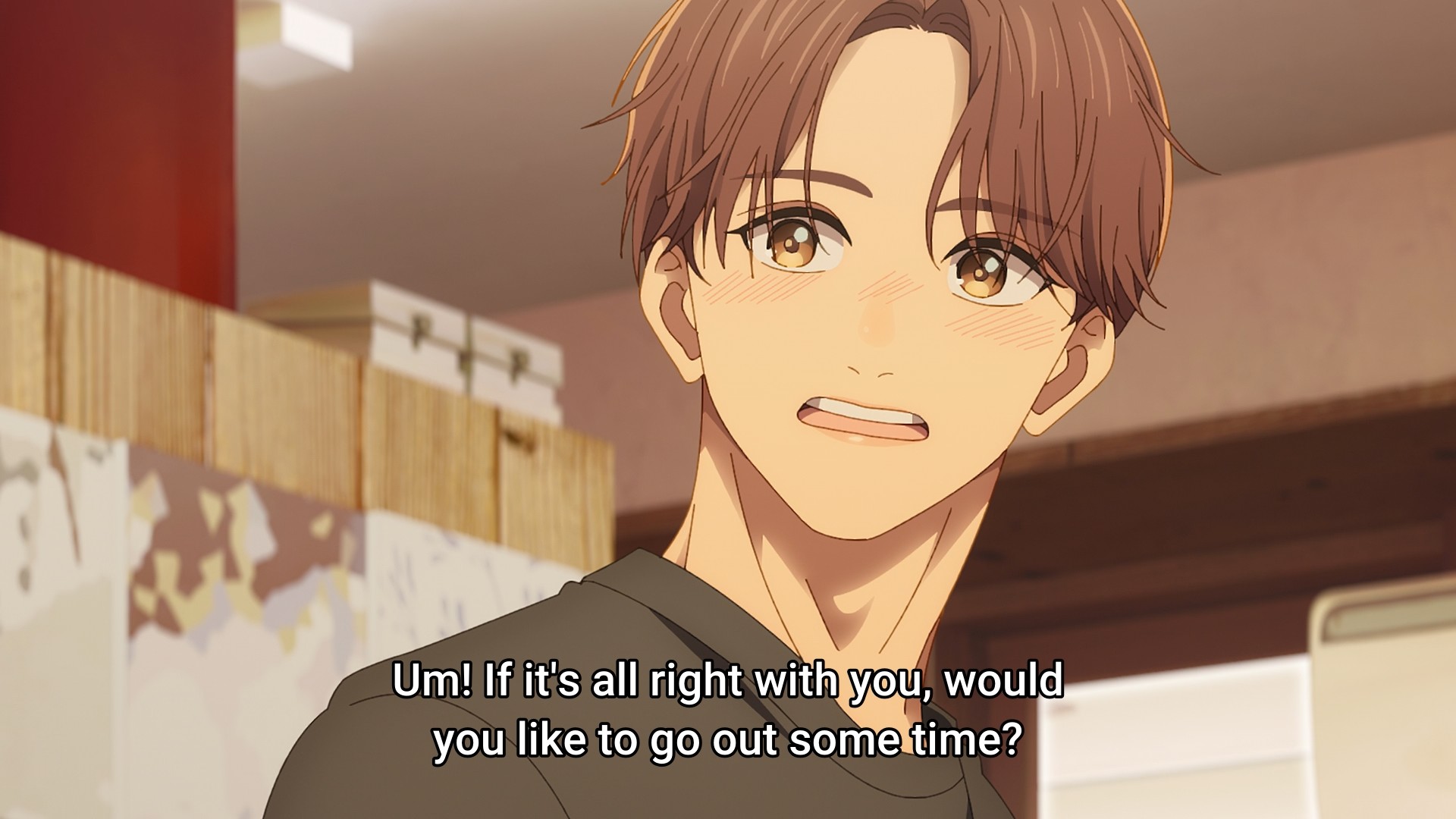 Takiguchi and Ichimura are now officially dating after the whole summer festival incident. Cool, we got over the first major hurdle. Unfortunately, they still seem so unrelatable. At school, Takiguchi suggests inviting all of their friends to lunch together. Ah, the classic merging of the friend groups. The more, the merrier, right? But in the middle of said lunch, she suddenly whips out her relationship contract with Ichimura and starts going over it point by point. For instance, while they’re at school, she and Ichimura need to maintain a minimum distance between the two of them. Takiguchi ultimately relents when she realizes she wants to spend time with her boyfriend — what a novel concept — but this whole thing still feels weird. Fine, she’s inexperienced, but even then, I’ve never seen anyone act like this. I don’t find it particularly compelling to watch either. And if Takiguchi is too uptight, then Ichimura is the direct opposite. They’ve only started dating, but he immediately invites her (and her friends) to go on a trip to stay at his fancy villa in Kobe. Oooh la la~ But seriously, pump the breaks, bro. Try to at least go on a couple of official dates before you plan a freaking trip. Ah well, if you want your uber-unrealistic romance with uber hot, model-like characters, then I guess this is the show for you.